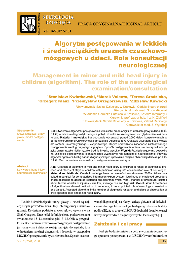 CHILD NEUROLOGY NEUROLOGIA DZIECIĘCA PRACA ORYGINALNA/ORIGINAL ARTICLE Vol. 16/2007 Nr 31 Algorytm postępowania w lekkich i średniociężkich urazach czaszkowomózgowych u dzieci. Rola konsultacji neurologicznej Management in minor and mild head injury in children (algorithm). The role of the neurological examination/consultation 1 Stanisław Kwiatkowski, 2Marek Valenta, 3Teresa Grodzicka, Grzegorz Klauz, 1Przemysław Grzegorzewski, 1Zdzisław Kawecki 1 1 Uniwersytecki Szpital Dziecięcy w Krakowie. Oddział Neurochirurgii Kierownik: dr hab. med. S. Kwiatkowski 2 Akademia Górniczo Hutnicza w Krakowie, Katedra Informatyki Kierownik: prof. zw. dr hab. inż. K. Zieliński 3 Uniwersytecki Szpital Dziecięcy w Krakowie, Zakład Radiologii Kierownik: dr med. Z. Wyrobek Streszczenie Słowa kluczowe: urazy głowy, model postępowania Cel: Stworzenie algorytmu postępowania w lekkich i średniociężkich urazach głowy u dzieci (LIŚCIUG) w zakresie diagnostyki i miejsca pobytu dziecka ze szczególnym uwzględnieniem roli neurologa. Materiał i metodyka: Na podstawie obserwacji ponad 2000 dzieci konsultowanych w poradni chirurgicznej Uniwersyteckiego Szpitala Dziecięcego w Krakowie utworzono bazę wiedzy dla systemu informatycznego – ekspertowego, którym sprawdzono zasadność zastosowanego postępowania według przyjętego algorytmu. Sposób postępowania opierał się na czynnikach ryzyka urazu: ryzyko niskie, ryzyko średnie i ryzyko wysokie. Wyniki: Przyjęcie algorytmu pozwoliło na unifikację postępowania, jednoznacznie wyznaczyło rolę konsultacji neurologicznej. Przyjęty algorytm ogranicza liczbę badań diagnostycznych i precyzuje miejsce obserwacji dziecka po LIŚCIUG. Ma znaczenie w ewentualnym postępowaniu orzeczniczym. Abstract Key words: head injury, neurological examination Aim: Creation of algorithm in mild and minor head injury at children in range of diagnostics proceed and places of stays of children with particular taking into consideration role of neurologist. Material and Methods: Create knowledge base on base of observation over 2000 children consulted in surgical for computerized information expert system, legitimacy of employed procedure check according to accepted (catched on) algorithm which (who). Manner of procedure resisted about factors of risks of injuries – risk low, average risk and high risk. Conclusion: Acceptance of algorithm has allowed unification of procedure, it has appointed role of neurologic consultation one-valued. Accepted algorithm limits number of diagnostic research and place of observation of child specifies mild and minor head injury. Lekkie i średniociężkie urazy głowy u dzieci są najczęstszym powodem konsultacji chirurgicznej i neurologicznej. Kryterium podziału urazów głowy opiera się na Skali Glasgow. Uraz lekki definiuje się na podstawie stanu świadomości 15–13, średniociężki 13–12. O ile w przypadku ciężkich urazów czaszkowo-mózgowych postępowanie jest oczywiste i dziecko zostaje przyjęte do szpitala, to z wdrożeniem należnej diagnostyki i leczenia w przypadku LIŚCIUG postępowanie bywa różnorodne. Sposób zastosoVol. 16/2007, Nr 31 wanej diagnostyki jest różny i zależy głównie od doświadczenia chirurga lub neurologa badającego dziecko. Należy podkreślić, że w grupie LIŚCIUG dochodzi do największej liczby niepowodzeń diagnostycznych i leczniczych [1] Założenia i cel pracy Podjęte badanie miało na celu stworzenie jednolitego sposobu postępowania w LIŚCIUG w ambulatorium 13 Stanisław Kwiatkowski, Marek Valenta, Teresa Grodzicka et al. szpitalnym , poradni chirurgicznej lub neurologicznej. Miało ustalić, jaki rodzaj diagnostyki powinien być zastosowany u dziecka i gdzie jest miejsce jego obserwacji i leczenia. Metodyka Na podstawie doświadczenia w leczeniu urazów głowy u dzieci w Oddziale Neurochirurgii Dziecięcej Uniwersyteckiego Szpitala Dziecięcego w Krakowie i dostępnego piśmiennictwa zastosowano grupy czynników ryzyka urazów głowy. W stosunku do poszczególnych grup utworzono algorytm postępowania w zakresie diagnostyki i obserwacji. Ta część stanowiła bazę wiedzy dla stworzenia programu informatycznego opartego na systemie ekspertowym Bay-Ex. Przeprowadzono badanie z użyciem systemu dla kolejnych 40 dzieci z LIŚCIUG. Potwierdzenie przydatności algorytmu postępowania było wynikiem pracy. Czynniki ryzyka urazu głowy u dzieci 1. Ryzyko wysokie • GCS 13–12 • Obniżenie GCS o 2 pkt w czasie obserwacji (wywiad) • Drgawki • Objawy oponowe • Objawy ogniskowe • Krwiak podczepcowy • Wyczuwalne wgniecenie czaszki • Uraz otwarty głowy • Wywiad w kierunku schorzeń hematologicznych, radio i chemioterapii 2. Ryzyko średnie • Utrata przytomności > 1 min • Senność • Bóle głowy • Wymioty > 3 razy • Niepamięć wsteczna • Drgawki w wywiadzie • Uraz wielomiejscowy • Uraz twarzoczaszki, uraz miejscowy • Podejrzenie dziecka pobitego • Noworodek lub niemowlę poniżej 6 mies. życia 3. Ryzyko niskie • GCS 15 • Bez utraty przytomności • Wymioty poniżej 3 razy • Bez objawów oponowych • Bez śladów urazu miejscowego Wszystkie czynnika ryzyka na podstawie wywiadu i badania lekarskiego ogólnego i neurologicznego można ustalić na każdym poziomie jednostki opieki zdrowotnej. Ma to na celu zastosowanie dalszego sposobu postępowania [3]. Postępowanie diagnostyczne w zależności od stopnia ryzyka urazu głowy głowy, w tym opcja 3D (CT, CT-3D) Badanie CT z użyciem kontrastu jest uzasadnione w bardzo szczególnych przypadkach, a badanie za pomocą rezonansu magnetycznego jądrowego (MRJ) jest niecelowe [2]. Wartość badania USG jest wysoka: obrazuje struktury w-czaszkowe, zwłaszcza przestrzenie płynowe, umożliwia wykazanie krwawienia śródczaszkowego oraz objawów nadciśnienia śródczaszkowego. Badanie jest krótkie, nieinwazyjne, powtarzalne, nie wymaga znieczulenia ogólnego. Badanie RTG jest najmniej w