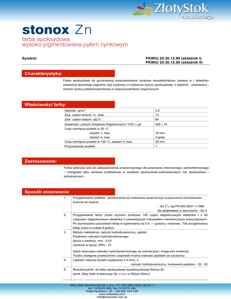 PKWiU 20.30.12.90 (składnik I) PKWiU 20.30.12.90 (składnik II) Symbol: Charakterystyka: Farba epoksydowa do gruntowania przeciwrdzewna cynkowa dwuskładnikowa zawiera w I składniku zawiesinę aktywnego pigmentu (pył cynkowy) w roztworze żywicy epoksydowej. II składnik - utwardzacz roztwór żywicy poliaminoamidowej w rozpuszczalnikach organicznych Właściwości farby: Gęstość, g/cm3 3,2 Zaw. części lotnych, %, śred. 13 Zaw. części stałych, obj % 64 Zawartość Lotnych Związków Organicznych ( VOC ), g/l 420 10 Czas schnięcia powłoki w 20 C stopień 1, max. stopień 4, max. 15 min. 3 godz. Czas schnięcia powłoki w 120 C, stopień 4, max. 20 min. Przyczepność powłoki 1 Zastosowanie: Farba polecana jest do zabezpieczenia antykorozyjnego dla przemysłu chemicznego, petrochemicznego i energetyki jako warstwa podkładowa w zestawie epoksydowo-poliuretanowym lub epoksydowo poliwinylowym. Sposób stosowania: 1. Przygotowanie podłoża: powierzchnia do malowania powinna być oczyszczona strumieniowo ściernie do stopnia - Sa 21/2 wg PN-ISO 8501-1:1996 dla eksploatacji w zanurzeniu - Sa 3 2. Przygotowanie farby: przed użyciem zmieszać 100 części objętościowych składnika I z 26 częściami objętościowymi składnika II (utwardzacza) mieszadłem mechanicznym koszyczkowym. Po wymieszaniu pozostawić farbę w opakowaniu na 0.5 - 1 godziny i malować. Tak przygotowaną farbę zużyć w czasie 8 godzin. 3. Metody nakładania: natrysk hydrodynamiczny, pędzel Parametry natrysku hydrodynamicznego: dysza o średnicy, mm - 0,53 ciśnienie w dyszy, MPa - 15 (dane dotyczące natrysku hydrodynamicznego są orientacyjne i mogą ulec korekcie) Trudno dostępne powierzchnie i poprawki można malować pędzlem ze szczeciny. 4. Lepkość robocza (kubek wypływowy 4 mm), s: natrysk hydrodynamiczny, malowanie pędzlem - 20 - 30 5. Rozcieńczalnik: do farby epoksydowej wysokocynkowej Stonox Zn (prod. Złoty Stok Antykorozja Sp. z o.o. w Złotym Stoku) 6. Zalecana grubość powłoki, µm 40 warstwy, µm 65 Maksymalna grubość powłoki na sucho, µm 100 7. Zalecana liczba warstw 1-2 8. Zużycie teoretyczne wyrobu dla grubości powłoki 40 m, l/m2 Zużycie praktyczne może odbiegać od podanego w zależności od 0,063 warunków aplikacji, rodzaju konstrukcji, warunków pogodowych itd. 9. Wilgotność względna powietrza w czasie malowania, % < 80 10. Temperatura malowania, °C Temperatura podłoża co najmniej 3°C wyższa od punktu rosy. 10 - 35 11. Nakładanie następnych warstw: czas minimalny (temp. 20°C, wilg. wzgl. 65 %), min 20 12. Mycie narzędzi po malowaniu: rozcieńczalnik do farby epoksydowej wysokocynkowej Stonox Zn (prod. Złoty Stok Antykorozja Sp. z o.o. w Złotym Stoku) 13. Najkrótszy czas od wymalowania do eksploatacji powłoki: 7 dni Następne wymalowania: Można nanosić farby nawierzchniowe: epoksydowe, poliwinylowe. Przed nakładaniem farby nawierzchniowej, po dłuższym narażeniu powłoki farby epoksydowej wysokocynkowej, należy usunąć z niej biały nalot (produkty korozji cynku) oraz zanieczyszczenia. Okres przydatności farby do użycia: Składnik I – 6 miesięcy od daty produkcji Składnik II - 6 miesięcy od daty produkcji Wskazówki bhp i przeciwpożarowe: Ze względu na obecność w farbie rozpuszczalników organicznych prace malarskie należy. prowadzić w pomieszczeniach dobrze wentylowanych. Należy przestrzegać ogólnych zasad i przepisów BHP i przeciwpożarowych. UWAGA: farba zawiera szkodliwe związki poliaminoamidowe. Pomieszczenia zamknięte w których stosowano Stonox Zn, w trakcie prac malarskich i po ich zakończeniu należy intensywnie wietrzyć, a po zaniku specyficznego zapachu można oddać do użytku Magazynowanie: W pomieszczeniach dobrze wentylowanych, z dala od źródeł zapłonu. W oryginalnych, szczelnie zamkniętych opakowaniach producenta. Opakowania: Pojemniki blaszane o pojemności 10l lub inne do uzgodnienia między producentem i odbiorcą. Wszystkie informacje i zalecenia oparte są na naszym doświadczeniu i posiadanej wiedzy. Wrzesień 2009 r.