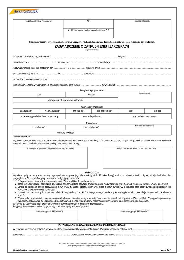 Pieczęć nagłówkowa Pracodawcy NIP Miejscowość i data Nr NKP, pod którym zarejestrowana jest firma w ZUS Uwaga: zaświadczenie wypełnione niewłaściwie lub nieczytelnie nie będzie honorowane. Zaświadczenie jest ważne jeden miesiąc od daty wystawienia ZAŚWIADCZENIE O ZATRUDNIENIU I ZAROBKACH (wypełnia zakład pracy) Niniejszym zaświadcza się, że Pan/Pani ........................................................................................................................ imię ojca .............................................................................. nazwisko rodowe .................................................. urodzony(a) ............................................... zamieszkały(a) .......................................................................................................... legitymujący(a) się dowodem osobistym serii ................ nr ………....................... wydanym przez ............................................................................................................................. jest zatrudniony(a) od dnia ................................. do ................................... na stanowisku …………………………………………….......................................................................... na podstawie umowy o pracę na czas: ……………….………………………………………………………...... . Przeciętne miesięczne wynagrodzenie z ostatnich 3 miesięcy netto wynosi: ................................... słownie złotych ................................................................................................ Powyższe wynagrodzenie: jest* kwota obciążenia nie jest* obciążone z tytułu wyroków sądowych Wymieniony pracownik: znajduje się* nie znajduje się* znajduje się* nie znajduje się* w okresie wypowiedzenia umowy o pracę w okresie próbnym znajduje się* nie znajduje się* jest* nie jest* pracownikiem sezonowym Pracodawca: Numer telefonu pracodawcy w trakcie likwidacji * - niepotrzebne skreślić Wystawca zaświadczenia wyraża zgodę na telefoniczne potwierdzenie zawartych w nim danych. W przypadku podania danych niezgodnych ze stanem faktycznym wystawca zaświadczenia ponosi odpowiedzialność według przepisów prawa karnego. Podpis i pieczęć głównego księgowego lub osoby upoważnionej Podpis i pieczęć pracodawcy lub osoby upoważnionej DYSPOZYCJA Wyrażam zgodę na potrącanie z mojego wynagrodzenia za pracę (zgodnie z treścią art. 91 Kodeksu Pracy), moich zobowiązań z tytułu pożyczki, jakiej mi udzielono lub poręczyłem* w Wierzyciel S.A., przy zachowaniu następujących warunków: 1. Potrącenie następuje na każde pisemne wezwanie Wierzyciel S.A. do spłaty pożyczki. 2. Zgoda jest nieodwołalna i obowiązuje aż do czasu spłacenia całości pożyczki, oraz świadczeń z nią związanych, wynikających z warunków zawartej umowy o pożyczkę. 3. Uznaję do potrącania całości zobowiązania z ww. tytułu, tj. kapitał, odsetki, koszty wynikające z warunków umowy o pożyczkę oraz koszty związane z przekazem lub przelewem przez pracodawcę należności. 4. Upoważniam pracodawcę do potrącania należności wymienionych w pkt. 3 z mojego wynagrodzenia przy każdej wypłacie, aż do zaspokojenia należności określonych w pkt. 3. 5. W przypadku rozwiązania lub ustania mojego zatrudnienia, zobowiązuję się w terminie 7 dni pisemnie zawiadomić o tym fakcie Wierzyciel S.A. W przypadku ponownego zatrudnienia zobowiązuję się udzielić zgody na potrącanie z mojego wynagrodzenia należności wymienionych w pkt. 3 przez nowego pracodawcę. Wierzyciel S.A. zastrzega sobie prawo do weryfikacji danych zawartych w niniejszym zaświadczeniu. Przyjmuję do wiadomości niniejszą dyspozycję i zobowiązuję się realizować jej treść. data i czytelny podpis PRACOWNIKA data i czytelny podpis PRACODAWCY POTWIERDZENIE ZAŚWIADCZENIA O ZATRUDNIENIU I ZAROBKACH W związku z wnioskiem o pożyczkę potwierdziłem(am) wysokość zarobków i okres zatrudnienia. Powyższe informacje potwierdził(a) .................................................................. , stanowisko................................................................................. . Zaświadczenie potwierdzono pod numerem telefonu ……………………................................................................ ...................................................................................................................... Data, pieczątka firmowa i podpis osoby potwierdzającej zaświadczenie Zaświadczenie o zatrudnieniu i zarobkach strona 1 z 1
