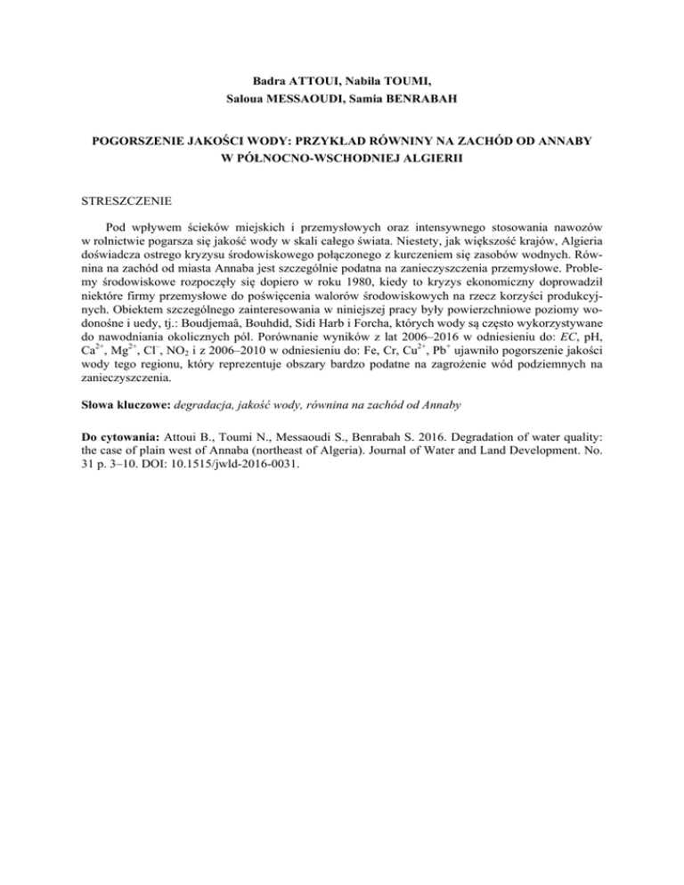Badra ATTOUI, Nabila TOUMI, Saloua MESSAOUDI, Samia BENRABAH POGORSZENIE JAKOŚCI WODY: PRZYKŁAD RÓWNINY NA ZACHÓD OD ANNABY W PÓŁNOCNO-WSCHODNIEJ ALGIERII STRESZCZENIE Pod wpływem ścieków miejskich i przemysłowych oraz intensywnego stosowania nawozów w rolnictwie pogarsza się jakość wody w skali całego świata. Niestety, jak większość krajów, Algieria doświadcza ostrego kryzysu środowiskowego połączonego z kurczeniem się zasobów wodnych. Równina na zachód od miasta Annaba jest szczególnie podatna na zanieczyszczenia przemysłowe. Problemy środowiskowe rozpoczęły się dopiero w roku 1980, kiedy to kryzys ekonomiczny doprowadził niektóre firmy przemysłowe do poświęcenia walorów środowiskowych na rzecz korzyści produkcyjnych. Obiektem szczególnego zainteresowania w niniejszej pracy były powierzchniowe poziomy wodonośne i uedy, tj.: Boudjemaâ, Bouhdid, Sidi Harb i Forcha, których wody są często wykorzystywane do nawodniania okolicznych pól. Porównanie wyników z lat 2006–2016 w odniesieniu do: EC, pH, Ca2+, Mg2+, Cl–, NO2 i z 2006–2010 w odniesieniu do: Fe, Cr, Cu2+, Pb+ ujawniło pogorszenie jakości wody tego regionu, który reprezentuje obszary bardzo podatne na zagrożenie wód podziemnych na zanieczyszczenia. Słowa kluczowe: degradacja, jakość wody, równina na zachód od Annaby Do cytowania: Attoui B., Toumi N., Messaoudi S., Benrabah S. 2016. Degradation of water quality: the case of plain west of Annaba (northeast of Algeria). Journal of Water and Land Development. No. 31 p. 3–10. DOI: 10.1515/jwld-2016-0031.