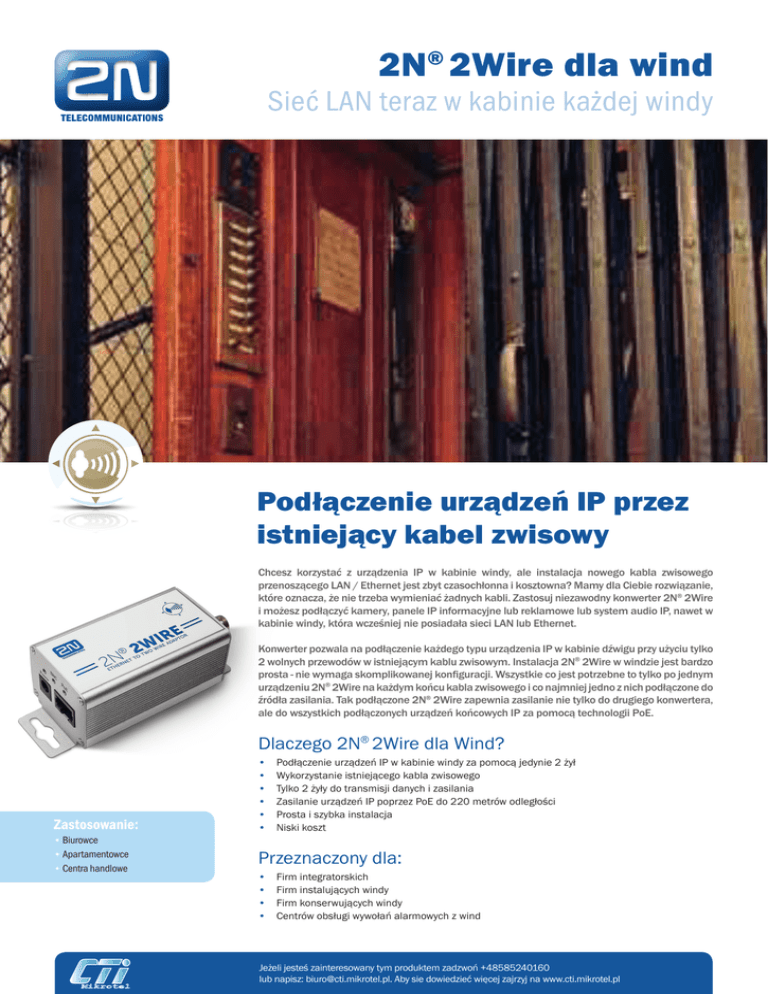 2N® 2Wire dla wind Sieć LAN teraz w kabinie każdej windy Podłączenie urządzeń IP przez istniejący kabel zwisowy Chcesz korzystać z urządzenia IP w kabinie windy, ale instalacja nowego kabla zwisowego przenoszącego LAN / Ethernet jest zbyt czasochłonna i kosztowna? Mamy dla Ciebie rozwiązanie, które oznacza, że nie trzeba wymieniać żadnych kabli. Zastosuj niezawodny konwerter 2N® 2Wire i możesz podłączyć kamery, panele IP informacyjne lub reklamowe lub system audio IP, nawet w kabinie windy, która wcześniej nie posiadała sieci LAN lub Ethernet. Konwerter pozwala na podłączenie każdego typu urządzenia IP w kabinie dźwigu przy użyciu tylko 2 wolnych przewodów w istniejącym kablu zwisowym. Instalacja 2N® 2Wire w windzie jest bardzo prosta - nie wymaga skomplikowanej konfiguracji. Wszystkie co jest potrzebne to tylko po jednym urządzeniu 2N® 2Wire na każdym końcu kabla zwisowego i co najmniej jedno z nich podłączone do źródła zasilania. Tak podłączone 2N® 2Wire zapewnia zasilanie nie tylko do drugiego konwertera, ale do wszystkich podłączonych urządzeń końcowych IP za pomocą technologii PoE. Dlaczego 2N® 2Wire dla Wind? Zastosowanie: • Biurowce • Apartamentowce • Centra handlowe • • • • • • Podłączenie urządzeń IP w kabinie windy za pomocą jedynie 2 żył Wykorzystanie istniejącego kabla zwisowego Tylko 2 żyły do transmisji danych i zasilania Zasilanie urządzeń IP poprzez PoE do 220 metrów odległości Prosta i szybka instalacja Niski koszt Przeznaczony dla: • • • • Firm integratorskich Firm instalujących windy Firm konserwujących windy Centrów obsługi wywołań alarmowych z wind Jeżeli jesteś zainteresowany tym produktem zadzwoń +48585240160 lub napisz: [email protected]. Aby sie dowiedzieć więcej zajrzyj na www.cti.mikrotel.pl Przykład połączeń LAN Router UTP 2N® 2Wire Maszynownia 2 2N® 2Wire UTP Panel reklamowy IP Kabina Parametry Techniczne Interfejs Ethernet Wskaźniki LED Typ złącza Szybkość RJ45 10/100 Base T, half/full duplex, auto-negotiation Zasilanie BNC PoE PoE IEEE 802.3 af/at 40Watt Compliant PoE+ Wejście AC Wyjście DC Okablowanie zewnętrzne (2Wire/UTP) Typ kabla Impedancja Zasięg transmisji 2 żyły, Cat 5e., Cat 6. lub podobny 25Ω do 100Ω Max 220 m @Cat6. Metoda transmisji Technologia Modulacja Pasmo częstotliwości CSMA/CA i TDMA Windowed OFDM 1.8MHz do 30MHz Niebieski – Zasilanie WŁ Zielony – Link Aktywny Zielony – Link Aktywny Zasilacz AC/DC 100–240 VAC , 50–60 Hz 48 VDC/0.84A–1.3A Parametry mechaniczne Wymiary Waga Materiał 40x40x75mm (HxWxL) 120g Aluminum Ekstrudowane Parametry środowiskowe Temperatury pracy Temperatury przechowywania -10° do +50°C -30° do +70°C Producent: 2N TELEKOMUNIKACE a.s. Dystrybutor: CTI MIKROTEL sp. z o.o. Modřanská 621, 143 01 Prague 4, Czech Republic, Tel.: +420 261 301 500, E-mail: [email protected], www.2n.cz. Aleja Grunwaldzka 205/209 80-266 Gdańsk Tel.: +48585240160, E-mail: [email protected],