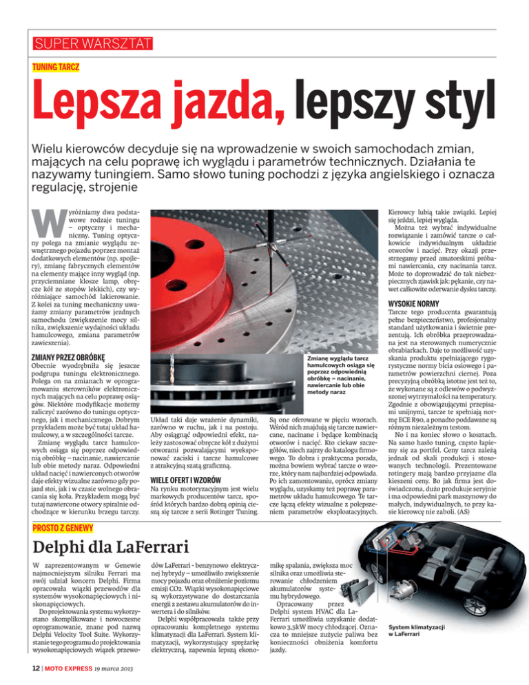 SUPER WARSZTAT TUNING TARCZ Lepsza jazda, lepszy styl Wielu kierowców decyduje się na wprowadzenie w swoich samochodach zmian, mających na celu poprawę ich wyglądu i parametrów technicznych. Działania te nazywamy tuningiem. Samo słowo tuning pochodzi z języka angielskiego i oznacza regulację, strojenie W Kierowcy lubią takie związki. Lepiej się jeździ, lepiej wygląda. Można też wybrać indywidualne rozwiązanie i zamówić tarcze o całkowicie indywidualnym układzie otworów i nacięć. Przy okazji przestrzegamy przed amatorskimi próbami nawiercania, czy nacinania tarcz. Może to doprowadzić do tak niebezpiecznych zjawisk jak: pękanie, czy nawet całkowite oderwanie dysku tarczy. yróżniamy dwa podstawowe rodzaje tuningu – optyczny i mechaniczny. Tuning optyczny polega na zmianie wyglądu zewnętrznego pojazdu poprzez montaż dodatkowych elementów (np. spojlery), zmianę fabrycznych elementów na elementy mające inny wygląd (np. przyciemniane klosze lamp, obręcze kół ze stopów lekkich), czy wyróżniające samochód lakierowanie. Z kolei za tuning mechaniczny uważamy zmiany parametrów jezdnych samochodu (zwiększenie mocy silnika, zwiększenie wydajności układu hamulcowego, zmiana parametrów zawieszenia). WYSOKIE NORMY ZMIANY PRZEZ OBRÓBKĘ Obecnie wyodrębniła się jeszcze podgrupa tuningu elektronicznego. Polega on na zmianach w oprogramowaniu sterowników elektronicznych mających na celu poprawę osiągów. Niektóre modyfikacje możemy zaliczyć zarówno do tuningu optycznego, jak i mechanicznego. Dobrym przykładem może być tutaj układ hamulcowy, a w szczególności tarcze. Zmianę wyglądu tarcz hamulcowych osiąga się poprzez odpowiednią obróbkę – nacinanie, nawiercanie lub obie metody naraz. Odpowiedni układ nacięć i nawierconych otworów daje efekty wizualne zarówno gdy pojazd stoi, jak i w czasie wolnego obracania się koła. Przykładem mogą być tutaj nawiercone otwory spiralnie odchodzące w kierunku brzegu tarczy. Zmianę wyglądu tarcz hamulcowych osiąga się poprzez odpowiednią obróbkę – nacinanie, nawiercanie lub obie metody naraz Układ taki daje wrażenie dynamiki, zarówno w ruchu, jak i na postoju. Aby osiągnąć odpowiedni efekt, należy zastosować obręcze kół z dużymi otworami pozwalającymi wyeksponować zaciski i tarcze hamulcowe z atrakcyjną szatą graficzną. WIELE OFERT I WZORÓW Na rynku motoryzacyjnym jest wielu markowych producentów tarcz, spośród których bardzo dobrą opinią cieszą się tarcze z serii Rotinger Tuning. Są one oferowane w pięciu wzorach. Wśród nich znajdują się tarcze nawiercane, nacinane i będące kombinacją otworów i nacięć. Kto ciekaw szczegółów, niech zajrzy do katalogu firmowego. To dobra i praktyczna porada, można bowiem wybrać tarcze o wzorze, który nam najbardziej odpowiada. Po ich zamontowaniu, oprócz zmiany wyglądu, uzyskamy też poprawę parametrów układu hamulcowego. Te tarcze łączą efekty wizualne z polepszeniem parametrów eksploatacyjnych. Tarcze tego producenta gwarantują pełne bezpieczeństwo, profesjonalny standard użytkowania i świetnie prezentują. Ich obróbka przeprowadzana jest na sterowanych numerycznie obrabiarkach. Daje to możliwość uzyskania produktu spełniającego rygorystyczne normy bicia osiowego i parametrów powierzchni ciernej. Poza precyzyjną obróbką istotne jest też to, że wykonane są z odlewów o podwyższonej wytrzymałości na temperatury. Zgodnie z obowiązującymi przepisami unijnymi, tarcze te spełniają normę ECE R90, a ponadto poddawane są różnym niezależnym testom. No i na koniec słowo o kosztach. Na samo hasło tuning, często łapiemy się za portfel. Ceny tarcz zależą jednak od skali produkcji i stosowanych technologii. Prezentowane rotingery mają bardzo przyjazne dla kieszeni ceny. Bo jak firma jest doświadczona, dużo produkuje seryjnie i ma odpowiedni park maszynowy do małych, indywidualnych, to przy kasie kierowcę nie zaboli. (AS) PROSTO Z GENEWY Delphi dla LaFerrari W zaprezentowanym w Genewie najmocniejszym silniku Ferrari ma swój udział koncern Delphi. Firma opracowała wiązki przewodów dla systemów wysokonapięciowych i niskonapięciowych. Do projektowania systemu wykorzystano skomplikowane i nowoczesne oprogramowanie, znane pod nazwą Delphi Velocity Tool Suite. Wykorzystanie tego programu do projektowania wysokonapięciowych wiązek przewo12 | MOTO EXPRESS 19 marca 2013 dów LaFerrari - benzynowo elektrycznej hybrydy – umożliwiło zwiększenie mocy pojazdu oraz obniżenie poziomu emisji CO2. Wiązki wysokonapięciowe są wykorzystywane do dostarczania energii z zestawu akumulatorów do inwertera i do silników. Delphi współpracowała także przy opracowaniu kompletnego systemu klimatyzacji dla LaFerrari. System klimatyzacji, wykorzystujący sprężarkę elektryczną, zapewnia lepszą ekono- mikę spalania, zwiększa moc silnika oraz umożliwia sterowanie chłodzeniem akumulatorów systemu hybrydowego. Opracowany przez Delphi system HVAC dla LaFerrari umożliwia uzyskanie dodatkowo 3,5kW mocy chłodzącej. Oznacza to mniejsze zużycie paliwa bez konieczności obniżenia komfortu jazdy. System klimatyzacji w LaFerrari