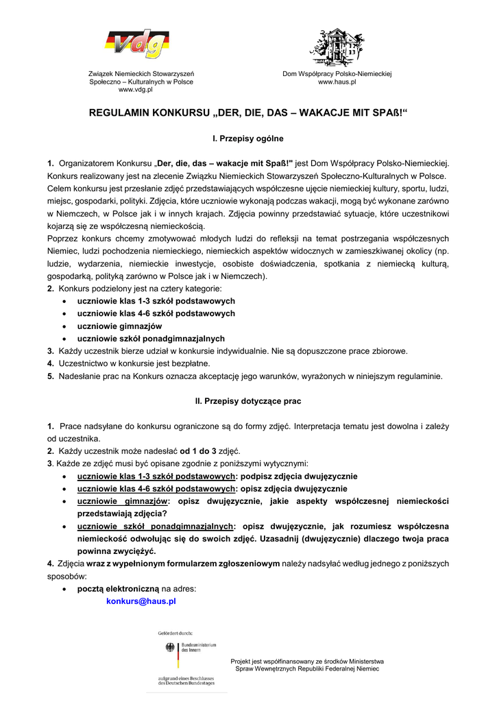 Związek Niemieckich Stowarzyszeń Społeczno – Kulturalnych w Polsce www.vdg.pl Dom Współpracy Polsko-Niemieckiej www.haus.pl REGULAMIN KONKURSU „DER, DIE, DAS – WAKACJE MIT SPAß!“ I. Przepisy ogólne 1. Organizatorem Konkursu „Der, die, das – wakacje mit Spaß!" jest Dom Współpracy Polsko-Niemieckiej. Konkurs realizowany jest na zlecenie Związku Niemieckich Stowarzyszeń Społeczno-Kulturalnych w Polsce. Celem konkursu jest przesłanie zdjęć przedstawiających współczesne ujęcie niemieckiej kultury, sportu, ludzi, miejsc, gospodarki, polityki. Zdjęcia, które uczniowie wykonają podczas wakacji, mogą być wykonane zarówno w Niemczech, w Polsce jak i w innych krajach. Zdjęcia powinny przedstawiać sytuacje, które uczestnikowi kojarzą się ze współczesną niemieckością. Poprzez konkurs chcemy zmotywować młodych ludzi do refleksji na temat postrzegania współczesnych Niemiec, ludzi pochodzenia niemieckiego, niemieckich aspektów widocznych w zamieszkiwanej okolicy (np. ludzie, wydarzenia, niemieckie inwestycje, osobiste doświadczenia, spotkania z niemiecką kulturą, gospodarką, polityką zarówno w Polsce jak i w Niemczech). 2. Konkurs podzielony jest na cztery kategorie: uczniowie klas 1-3 szkół podstawowych uczniowie klas 4-6 szkół podstawowych uczniowie gimnazjów uczniowie szkół ponadgimnazjalnych 3. Każdy uczestnik bierze udział w konkursie indywidualnie. Nie są dopuszczone prace zbiorowe. 4. Uczestnictwo w konkursie jest bezpłatne. 5. Nadesłanie prac na Konkurs oznacza akceptację jego warunków, wyrażonych w niniejszym regulaminie. II. Przepisy dotyczące prac 1. Prace nadsyłane do konkursu ograniczone są do formy zdjęć. Interpretacja tematu jest dowolna i zależy od uczestnika. 2. Każdy uczestnik może nadesłać od 1 do 3 zdjęć. 3. Każde ze zdjęć musi być opisane zgodnie z poniższymi wytycznymi: uczniowie klas 1-3 szkół podstawowych: podpisz zdjęcia dwujęzycznie uczniowie klas 4-6 szkół podstawowych: opisz zdjęcia dwujęzycznie uczniowie gimnazjów: opisz dwujęzycznie, jakie aspekty współczesnej niemieckości przedstawiają zdjęcia? uczniowie szkół ponadgimnazjalnych: opisz dwujęzycznie, jak rozumiesz współczesna niemieckość odwołując się do swoich zdjęć. Uzasadnij (dwujęzycznie) dlaczego twoja praca powinna zwyciężyć. 4. Zdjęcia wraz z wypełnionym formularzem zgłoszeniowym należy nadsyłać według jednego z poniższych sposobów: pocztą elektroniczną na adres: [email protected] Projekt jest współfinansowany ze środków Ministerstwa Spraw Wewnętrznych Republiki Federalnej Niemiec tradycyjną przesyłką pocztową (w formie fizycznej lub na nośnikach CD) lub dostarczenie osobiste na adres: Dom Współpracy Polsko-Niemieckiej ul. 1 Maja 13/2 45-068 Opole z dopiskiem „Konkurs Wakacje mit Spaß” 5. Każde ze zdjęć powinno być oznaczone w sposób łatwy do identyfikacji z odpowiednim opisem: numer zdjęcia (zgodny z formularzem zgłoszeniowym) oraz imię i nazwisko uczestnika 6. Zdjęcia w formie cyfrowej powinny być możliwe do otwarcia w programach Microsoft Office. 7. Preferowany wymiar zdjęć w formie fizycznej (wywołanych) to 15 x 20 cm. 8. Organizator zastrzega sobie prawo do dyskwalifikowania prac nie spełniających wymienionych wyżej wymogów. 9. Organizator nie zwraca prac biorących udział w Konkursie, prac zdyskwalifikowanych, jak również z niego wyłączonych ze względów formalnych. III. Terminarz i ocena prac 1. Termin nadsyłania prac mija dnia 15 października 2014 roku (włącznie), decyduje data stempla pocztowego. Prace nadesłane po terminie nie będą brane pod uwagę w Konkursie. 2. Organizator powołuje Jury Konkursu z udziałem przedstawicieli ze strony organizatora oraz profesjonalnego artystę. Prace oceniane będą pod względem zgodności z tematem i ideą konkursu, estetyki, oraz wartości artystycznej pracy. Decyzja Jury jest ostateczna i nie podlega weryfikacji. 3. Wyniki Konkursu ogłoszone będą podczas uroczystej gali wręczenia nagród dla zwycięzców. O miejscu i dacie uroczystej gali uczestnicy konkursu zostaną powiadomieni bezpośrednio przez organizatora. IV. Nagrody i wyróżnienia 1. Organizator przewiduje następujące nagrody dla zwycięzców każdej z czterech kategorii: za zajęcie I miejsca – tablet oraz wybrane publikacje Domu Współpracy Polsko-Niemieckiej, za zajęcie II miejsca – telefon komórkowy oraz wybrane publikacje Domu Współpracy PolskoNiemieckiej, za zajęcie III miejsca – aparat cyfrowy fotograficzny oraz wybrane publikacje Domu Współpracy Polsko-Niemieckiej. 2. Organizator zastrzega sobie prawo do zmiany nagród rzeczowych, wymienionych powyżej. V. Wykorzystanie prac uczestników i przepisy końcowe 1. Organizator zastrzega sobie prawo do bezpłatnej reprodukcji nagrodzonych i wyróżnionych prac, a także do wyeksponowania nadesłanych prac na wystawach pokonkursowych oraz w innych publikacjach związanych z działalnością organizatora. Organizatorzy konkursu zastrzegają sobie prawo do udostępniania prac osobom i instytucjom trzecim. 2. W przypadku wystąpienia okoliczności niezależnych od organizatora ma on prawo do przesunięcia terminów konkursowych, zmiany poszczególnych punktów w regulaminie lub całkowitego odwołania konkursu. 3. Wszelkie pytania prosimy kierować telefonicznie do p. Katarzyny Czech pod nr telefonu (77) 402 51 05 lub pod adres e-mail: [email protected]. Aktualne informacje o konkursie zamieszczane będą na stronie internetowej www.bilingua.haus.pl. Projekt jest współfinansowany ze środków Ministerstwa Spraw Wewnętrznych Republiki Federalnej Niemiec