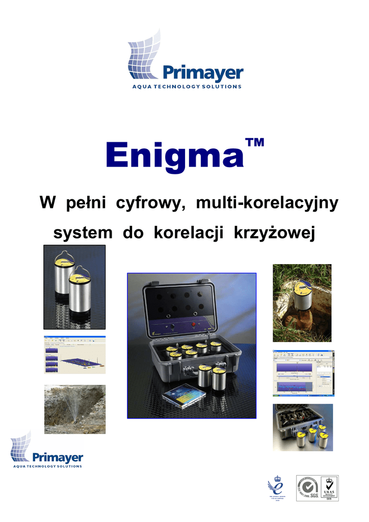 ™ Enigma W pełni cyfrowy, multi-korelacyjny system do korelacji krzyżowej Enigma™ – Unikalny system wykrywania i dokładnej lokalizacji wycieków wody EnigmaTM jest najbardziej rozwiniętym technologicznie korelatorem, jednocześnie wykorzystującym najnowocześniejsze doświadczenia cyfrowej technologii akustycznej. Łączy tradycyjny proces rejestratorów akustycznych (do wyszukiwania ukrytych wycieków) z najnowocześniejszą cyfrową technologią korelacyjną (do dokładnej lokalizacji wycieku). Enigma oferuje: • • • • • • • • Wykrywanie ukrytych wycieków oraz dokładną lokalizację w jednym kroku ich Przenoszenie szumów z rurociągu do komputera bez najmniejszych strat na jakości Unikatową wydajność korelacyjną także w trudnych do korelacji obszarach 8 czujników do korelacji krzyżowej Szybką korelację do kilku km sieci podczas jednego pomiaru W pełni cyfrową technologię przenoszenia danych Znalezienie większej liczby wycieków Bardzo wydajne oprogramowanie z 2010 roku Sieć ośmiu cyfrowo korelujących czujników rozmieszczana jest na wodociągu w normalnym okresie eksploatacji. Czujniki notują i nagrywają dźwięk awarii. Po wgraniu danych do komputera wszystkie dźwięki z wszystkich czujników poddane są cyfrowej analizie spektralnej i dokonana zostaje korelacja pomiędzy każdą kombinacją par czujników (każdy z każdym). Pomiarów dokonywać można w ciągu dnia (w ciągu kilku minut) lub można czujniki zaprogramować do pomiarów w nocy, wtedy wystarczy tylko jednego dnia osadzić je na rurociągu (zasuwy, studnie, hydranty osadzenie czujników następuje podobnie jak przy zwykłym korelatorze) np. na rurociągu stalowym w odległości od siebie max do 1 km, a następnego dnia dokonać oceny przy pomocy walizki komunikacyjnej, do której wkładane są czujniki, a program dokonuje analizy zmierzonych danych i dźwięków i dokładnie określa miejsca wszystkich stwierdzonych wycieków na obszarze, na którym system był danego dnia zastosowany. Korelacja krzyżowa System ośmiu czujników umożliwia skorelowanie w ciągu kilku minut do kilku kilometrów sieci. Zwykły korelator z dwoma czujnikami na podobne zadanie potrzebowałby kilku godzin. Enigma przy osadzeniu wszystkich czujników dokona bowiem pomiarów korelacyjnych pomiędzy każdym z nich, zatem ogółem 28 korelacji podczas jednego pomiaru i może zidentyfikować o wiele więcej wycieków. Kolejną ogromną zaletą korelacji krzyżowej jest możliwość potwierdzenia Model sieci przedstawia przejrzyście osadzenie czujników awarii z innych kombinacji czujników. Przez to maksymalnie sprecyzowane zostaje miejsce określonej awarii, skuteczność wykopu przy korelacji krzyżowej jest o wiele większa, przy tym stosunkowo mniej czasochłonna niż klasyczna metoda korelacji. Enigma dzięki zastosowaniu ośmiu czujników potrafi dodatkowo bezpośrednio zmierzyć szybkość rozprzestrzeniania się dźwięku po rurociągu i przez to nie tylko wykryć jakiekolwiek niejednorodności na sieci (np. fragment innego rodzaju rurociągu), błędnie przez użytkownika przyjęty materiał rurociągu, orientację także w przypadku nieznanego rurociągu, ale przede wszystkim maksymalnie sprecyzować pomiary korelacyjne w każdej sytuacji. Detekcja ukrytych wycieków Właściwości czujników korelacyjnych • • • • • • • Mała wielkość - łatwe osadzenie Ekstremalna czułość piezoakcelerometra Możliwość programowania bez użycia komputera Nie występują radia, manipulowanie konektory ani kable - łatwe Bardzo szybka komunikacja za pomocą portów optycznych Bateria na 5 lat - nie trzeba doładowywać Całkowicie zanurzalne - pokrycie IP68 Enigma potrafi niezawodnie wykrywać ukryte wycieki i można ją bardzo efektywnie wykorzystywać przy prewencyjnym wyszukiwaniu wycieków. Dzięki opracowanemu prze PRIMAYER algorytmowi korelacyjnemu, wykrywanie uszkodzeń jest o wiele sprawniejsze i bardziej niezawodne niż klasyczny nasłuch lub stosowanie urządzeń akustycznych, także wyraźnie zwiększa się odległość pomiędzy poszczególnymi czujnikami, dzięki czemu możliwe jest badanie o wiele większego rejonu sieci. Enigma oprócz wykrywania wycieków pokazuje także ich dokładne miejsce. Przy wybraniu sposobu pomiaru w nocy, Enigma wykona trzy niezależne od siebie korelacje w ciągu nocy, następnie diagram 3D wyraźnie wykryje, czy szczyty korelacyjne to faktyczne wycieki, czy tylko przypadkowy pobór wody. Dodatkowo praca w nocy umożliwia korelację dźwięków w warunkach gdy minimalne jest zużycie, minimalny hałas otoczenia a ciśnienie w rurociągu najwyższe, co pomaga lepszemu rozchodzeniu się dźwięku w rurociągu. Wyniki korelacji są więc o wiele bardziej wartościowe. Wyjątkowa cyfrowa analiza spektralna oraz filtracja Dzięki unikatowemu, w pełni cyfrowemu przenoszeniu szumu z rurociągu bezpośrednio do jednostki oceniającej, dźwięku wycieku w żaden sposób nie zakłóca ani nie wywiera na niego wpływu transmisja radiowa, jak to jest przy zwykłych korelatorach. Zaleta ta umożliwia programowi Enigma stosowanie postępowej, w pełni cyfrowej analizy spektralnej, której wyniki są zupełnie nieporównywalne ze zwykłymi korelatorami i ich obróbką cyfrową. Funkcja equalizera spektralnego reguluje natężenie sygnału w ramach całego spektrum w celu maksymalnego wyrównania na każdej częstotliwości a system autofiltrów aktywuje dynamiczny przebieg wyboru zakresu częstotliwości. Dzięki tym funkcjom Enigma potrafi całkiem wyeliminować wszelkie wpływy przypadkowych dźwięków i korelować tylko czysty i spójny dźwięk awarii i to o najwyższej jakości dźwięku bez najmniejszych strat jakościowych i ilościowych, które przy transmisji radiowej powstają zawsze. Przez zastosowanie autofiltra (z prawej strony) osiągnięto obraz szczytu korelacyjnego nawet w bardzo trudnych warunkach Oprogramowanie Właściwości oprogramowa