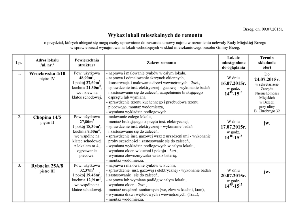 Brzeg, dn. 09.07.2015r. Wykaz lokali mieszkalnych do remontu o przydział, których ubiegać się mogą osoby uprawnione do zawarcia umowy najmu w rozumieniu uchwały Rady Miejskiej Brzegu w sprawie zasad wynajmowania lokali wchodzących w skład mieszkaniowego zasobu Gminy Brzeg. Lp. Adres lokalu /ul. nr / Powierzchnia struktura 1. Wrocławska 4/10 Pow. użytkowa 48,90m2, 1 pokój 27,60m2, kuchnia 21,30m2, wc i zlew na klatce schodowej. piętro IV 2. Chopina 14/5 piętro II 3. Rybacka 25A/8 piętro III Pow. użytkowa 27,80m2 1 pokój 18,30m2, kuchnia 9,50m2, wc wspólne na klatce schodowej z lokalem nr 4, ogrzewanie piecowe. Pow. użytkowa 32,37m2 1 pokój 19,46m2, kuchnia 12,91m2, wc wspólne na klatce schodowej. Zakres remontu - naprawa i malowanie tynków w całym lokalu, - naprawa i odmalowanie skrzynek okiennych, - konserwacja i malowanie drzwi wewnętrznych - 2szt., - sprawdzenie inst. elektrycznej i gazowej - wykonanie badań i zastosowanie się do zaleceń, uzupełnienie brakującego osprzętu lub wymiana, - sprawdzenie trzonu kuchennego i przebudowa trzonu piecowego, montaż wodomierza, - wymiana wykładzin podłogowych. - malowanie całego lokalu, - montaż brakującego osprzętu inst. elektrycznej, - sprawdzenie inst. elektrycznej - wykonanie badań i zastosowanie się do zaleceń, - sprawdzenie inst. gazowej wraz z urządzeniami - wykonanie próby szczelności i zastosowanie się do zaleceń, - wymiana wykładzin podłogowych w całym lokalu, - wymiana okien w kuchni i pokoju - 3szt., - wymiana zlewozmywaka wraz z baterią, - montaż wodomierza. - naprawa i malowanie tynków w kuchni, - sprawdzenie inst. gazowej i elektrycznej - wykonanie badań i zastosowanie się do zaleceń, - naprawa lub wymiana podłóg w całym lokalu, - wymiana okien - 2szt., - montaż urządzeń sanitarnych (wc, zlew w kuchni, kran), - wymiana drzwi wejściowych i wewnętrznych (1szt.), - montaż wodomierza. Lokale udostępnione do oglądania Termin składania ofert Do W dniu 16.07.2015r. w godz. 1445-1515 W dniu 17.07.2015r. 24.07.2015r. w sekretariacie Zarządu Nieruchomości Miejskich w Brzegu przy ulicy B. Chrobrego 32 jw. w godz. 1445-1515 W dniu 20.07.2015r. w godz. 1445-1515 jw. 4. 5. Pow. użytkowa 38,00m2 piętro II 1 pokój 24,25m2, kuchnia 13,75m2, wc w piwnicy (z możliwością wykonania w lokalu). Pow. użytkowa Westerplatte 13/14 19,60m2, piętro IV 1 pokój 12,40m2, przedpokój+wnęka kuchenna 4,00m2, łazienka 3,20m2. Szkolna 24/9 - odmalowanie całego lokalu, - sprawdzenie inst. elektrycznej przez osobę z uprawnieniami i zastosowanie się do zaleceń, - sprawdzenie inst. gazowej przez osobę z uprawnieniami i zastosowanie sie do zaleceń, - wymiana urządzeń: zlewozmywak wraz z baterią, - wymiana wykładzin w kuchni i pokoju, - wymiana wodomierzy. - naprawa i malowanie tynków w całym lokalu, - sprawdzenie inst. elektrycznej i gazowej - wykonanie badań i zastosowanie się do zaleceń, - wymiana gumolitu w całym lokalu, - wymiana i montaż urządzeń sanitarnych: wanna, zlewozmywak, - regulacja drzwi balkonowych. W dniu 21.07.2015r. jw. w godz. 1445-1515 W dniu 22.07.2015r. w godz. 1445-1515 jw.