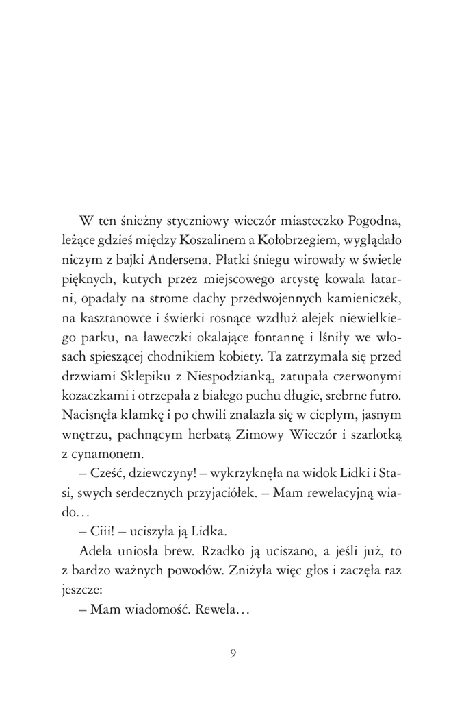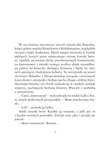 W ten śnieżny styczniowy wieczór miasteczko Pogodna, leżące gdzieś między Koszalinem a Kołobrzegiem, wyglądało niczym z bajki Andersena. Płatki śniegu wirowały w świetle pięknych, kutych przez miejscowego artystę kowala latarni, opadały na strome dachy przedwojennych kamieniczek, na kasztanowce i świerki rosnące wzdłuż alejek niewielkiego parku, na ławeczki okalające fontannę i lśniły we włosach spieszącej chodnikiem kobiety. Ta zatrzymała się przed drzwiami Sklepiku z Niespodzianką, zatupała czerwonymi kozaczkami i otrzepała z białego puchu długie, srebrne futro. Nacisnęła klamkę i po chwili znalazła się w ciepłym, jasnym wnętrzu, pachnącym herbatą Zimowy Wieczór i szarlotką z cynamonem. – Cześć, dziewczyny! – wykrzyknęła na widok Lidki i Sta si, swych serdecznych przyjaciółek. – Mam rewelacyjną wiado… – Ciii! – uciszyła ją Lidka. Adela uniosła brew. Rzadko ją uciszano, a jeśli już, to z bardzo ważnych powodów. Zniżyła więc głos i zaczęła raz jeszcze: – Mam wiadomość. Rewela… – A Bogusia ma gościa – przerwała jej Stasia, wskazując łyżką sufit. Adela uniosła wzrok i zaszeptała podekscytowana: – Wiktor? Jednak nie wyjechał? Starsza pani westchnęła, a Lidka pokręciła głową. – To Anna. Anna Potocka – rzekła, Adela zaś na dźwięk tego imienia aż się cofnęła. – Anna Potocka? – powtórzyła powoli, cedząc każdą zgłoskę. Nie patrzyła przy tym na Lidkę, ale na Stasię, która mieszkała tutaj, w Pogodnej, od kilkudziesięciu lat i znała sekrety wszystkich jej mieszkańców. – Ukochana, zaginiona, nieodżałowana żona Wiktora? – Ta właśnie – przytaknęła starsza pani, patrząc na przyjaciółkę z dziwnym współczuciem. W pierwszym momencie w oczach Adeli odmalował się szok – nic dziwnego, każdy na taką wiadomość reagował szokiem, bo też prędzej ducha by się spodziewano niż zaginionej przed trzema laty kobiety – ale już w następnym przybrała obojętny, niemal odpychający wyraz twarzy. – I siedzi tam sobie z Bogusią, popijając herbatkę? – Znów spojrzała w górę, tym razem wzrokiem tak ostrym, niemal nienawistnym, że Lidka pokręciła głową, niczego nie rozumiejąc. Czyżby między Adelą a Anną zaszło w przeszłości coś, o czym ona, Lidka, nie miała pojęcia? Czyżby… Wiktor Potocki? – Zaraz się dowiemy – odrzekła półgłosem Stasia, słysząc kroki na schodach. Wszystkie trzy spojrzały na drzwi prowadzące do korytarza, w których stanęła właśnie piękna, czarnowłosa kobie10 ta, przy której uroda Adeli, miejscowej femme fatale, wydała się… pospolita. – Dobry wieczór, Adelo. – Anna uśmiechnęła się chłodno. – I jednocześnie dobranoc. Nie czekając na odpowiedź, wyszła w mroźną noc. Ten sam mróz, może nawet większy, skuł serca trzech kobiet. Trwały przez moment w bezruchu, patrząc na znikającą w mroku kobietę. W następnej chwili biegły na górę, do Bogusi. – Hej, mała, co ona ci zrobiła?! – Pierwsza dopadła skulonej na kanapie dziewczyny Adela. Przysiadła obok i chwyciła łkającą przyjaciółkę w objęcia. – Głupie pytanie – szepnęła Lidka. Jeszcze pół godziny wcześniej darzyła zaginioną Annę niemal uwielbieniem, jak wszyscy mieszkańcy Pogodnej. Teraz jednak, widząc załamaną Bogusię, poczuła wściekłość, bez względu na to, czy Anna była winna swego zniknięcia, czy też nie. – Boguniu, dziecko drogie… – Stasia siedziała po drugiej stronie dziewczyny, gładząc ją bezradnie po ramieniu. – Przestań się mazać, kobieto! – Adela, sama przed chwilą zaszokowana, potrząsnęła przyjaciółką. – Mów, czego pani Potocka od ciebie chciała, i… – Właśnie tego chciała – wyszeptała Bogusia, ocierając łzy. – Przypomnieć, że nadal jest panią Potocką. Żoną Wik tora. – Żartujesz?! – wykrzyknęła Adela. – Przez trzy lata nie daje znaku życia, po czym zjawia się jakby nigdy nic, by cię uświadomić w kwestiach rodzinnych? Dziewczyna skinęła głową. 11 – Zawsze była tupeciarą! – syknęła Adela, mrużąc z nienawiścią brązowe oczy. Lidka, a i Bogusia także, spojrzały na nią ze zdumieniem. Pogodna skrywała chyba większe tajemnice, niż im się zdawało. – No co? Odbiła mi Wiktora, ot tak. – Kobieta pstryknęła palcami. – Mam chyba prawo nie darzyć jej miłością? – Byłaś przesłuchiwana przez policję – przypomniała sobie Lidka. – W związku z zaginięciem Anny. – Taaa, miałam ponoć zwabić ją do Podlipki i tam zamordować, a potem zakopać gdzieś w lesie w skutej lodem na dwa metry ziemi. – Ale nie ty ją zabiłaś? – upewniła się Bogusia. – Nikt jej nie zabił! Jak widziałaś, właśnie się pojawiła, cała i zdrowa! By zniszczyć tym razem twoje życie! – krzyknęła Adela, a i Bogusia, i Lidka po raz pierwszy, od kiedy znały Adelę, ujrzały łzy w oczach tej silnej, opanowanej kobiety. Wstrząsnęło to nimi. – Tak, dobrze się domyślacie, kochałam się w Wiktorze. Był moją pierwszą miłością, wielką, chyba największą. Boże, oszalałam na punkcie tego faceta! Snułam się za nim krok w krok, byle tylko zauważył obecność nastoletniej gówniary. I wreszcie zauważył. O tak, zauważył… – Adela zacisnęła powieki, by zdusić łzy. Nie, nie rozklei się do końca nawet przed nimi, przyjaciółkami, jakich nie miała nigdy przedtem. Później, gdy wróci do domu, będzie mogła skryć się pod kołdrą we własnej sypialni, ukryć rozpaloną twarz w poduszce i płakać, i krzyczeć, dopóki starczy sił. Teraz… teraz to ona jest panią radną, której jedyny problem stanowi dobór rękawiczek od- 12 powiednich do futra i kozaczków. I ekologiczna oczyszczalnia ścieków dla Pogodnej. – A właśnie, podpisałyście petycję? – zapytała surowo obu młodych kobiet. Te spojrzały na nią zdumione. – J-jaką…? – To macie podpisa