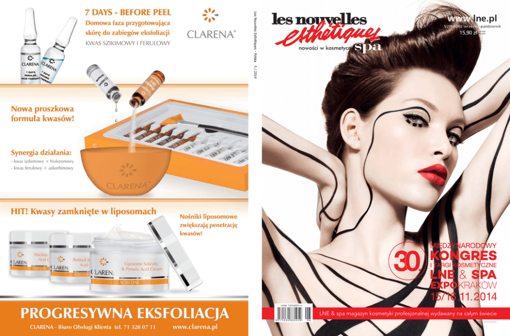 Les Nouvelles Esthétiques - Polska www.lne.pl 5/2014 (96) wrzesień-październik 15,90 zł w tym 8% VAT nowości w kosmetyce 5 / 2014 LNE & spa magazyn kosmetyki profesjonalnej wydawany na całym świecie Fot: MAKE UP FOR EVER ARKANA w Portugalii Na początku lipca Arkana miała zaszczyt i przyjemność uczestniczyć w targach kosmetycznych ExpoMadeira na portugalskiej wyspie Madera. Firma została tam zaproszona przez Ambasadę RP w Lizbonie, aby uświetnić swoją obecnością polskie stoisko, promować nasz przemysł kosmetyczny oraz przedstawić swoją ofertę. Szkoleniowiec marki – Anna Marcjasz – przeprowadziła warsztaty oraz pokazy dla portugalskich kosmetyczek i osób odwiedzających targi. Polską strefę zaszczycili swoją obecnością wysocy przedstawiciele władz Regionu Autonomicznego Madery oraz Ambasador RP w Lizbonie, prof. Bronisław Misztal. www.arkana.pl SEMINARIUM Dr. Belter 18–19 października w hotelu Medi SPA Mazowsze w Ustroniu odbędzie się dwudniowe seminarium poświęcone tegorocznym nowościom Dr. Beltera. Szkolenie poprowadzi Sarah White – międzynarodowy trener i wdrożeniowiec firmy. Uczestnicy zapoznają się z nowymi zabiegami: rozjaśniającym z witaminą C Lumination Secret, liftingującym Dermo-relax, luksusowym Pro-event Green SPA, kawiorowym Caviar Delux oraz nowym masażem punktowym twarzy. Podczas seminarium odbędzie się też wykład „ABC sprzedaży w gabinecie kosmetycznym”, prowadzony przez Martę Fiłoń, trenera branży beauty & spa. www.belter.pl 62 l DOSSIER HYDRA REPULP TREATMENT – ELLA BACHE Nowatorski zabieg intensywnie nawilżający, oparty na najwyższej jakości naturalnych składnikach. Głównym składnikiem linii jest kwas hialuronowy zatrzymujący wodę w naskórku, dzięki czemu skóra jest wygładzona, a drobne zmarszczki znikają. Dodatek esencji z kwiatu winogron dodaje skórze energii, fruktoza wygładza i chroni, a hydralina odbuduje płaszcz hydrolipidowy, poprawia komfort i nadaje cerze gładkość. www.ellabache.pl RE-CHARGE CONTOUR PUSH UP – BDR Serum intensywnie nawilżające z długotrwałym efektem kojacym. Dzięki zawartości kwasu hialuronowego skóra odzyskuje gładkość, jędrność i optymalne nawilżanie. Efekt wygładzenia drobnych zmarszczek i bruzd jest natychmiastowo odczuwalny i widoczny. Skóra staje się mocniejsza dzięki zwiększonym możliwościom wiązania wody. Kontury twarzy poprawiają się, skóra staje się odprężona i zrelaksowana. www.norel.pl ESSENTIAL B5 SERUM – DERMAQUEST Produkt z najwyższym otrzymywanym biotechnologicznie stężeniem kwasu hialuronowego (40%) doskonale nawilża i wygładza skórę. Wzbogacona w prowitaminę B5 (5%) formuła pozwala na szybką regenerację i przyspieszenie procesów gojenia się skóry. Preparat bardzo dobrze tolerowany przez skórę, wspomaga wnikanie innych substancji aktywnych. Doskonale sprawdza się w regeneracji skóry po inwazyjnych zabiegach eksfoliacyjnych. www.dermaquest.pl KOKTAJL DO MEZOTERAPII IGŁOWEJ Z KWASEM HIALURONOWYM F-HA+ – FUSION MESOTHERAPY Koktajl do mezoterapii z 3,5-procentowym kwasem hialuronowym o sterylnej formule posiada gładką, płynno-żelową konsystencję, dzięki której jest łatwo i płynnie aplikowany. Silnie higroskopijny, nieusieciowany produkt ma czas metabolizowania przedłużony nawet do 3 miesięcy. Zabieg uzupełnia linia z kwasem hialuronowym Hialuronic Acid Oxynergy Paris, w skład której wchodzą produkty do twarzy i ciała. www.aurumDG.pl LNE & spa AMPUŁKA – CZYNNIK HIALURONOWY 5 – DR. BELTER Zawarte w składzie ampułki do szybkiego liftingu różne formy kwasu hialuronowego wiążą wilgoć i zmniejszają przeznaskórkową utratę wody. Dodatek wyciągu z rośliny Alpinia galgant stymuluje produkcję kwasu hialuronowego w skórze. Produkt jest wolny od substancji zapachowych i barwiących, idealnie nadaje się do zabiegów ultradźwiękowych, mikroprądowych i z wykorzystaniem zimnego lasera. Przeznaczony do każdego rodzaju cery w każdym wieku. www.belter.pl ZABIEG „UGAŚ PRAGNIENIE” – BANDI Zabieg nawilżający opracowany z myślą o intensywnym nawodnieniu komórek skóry. Preparaty działają dwukierunkowo – wiążą cząsteczki wody w naskórku oraz odbudowują płaszcz hydrolipidowy. Głównymi składnikami kosmetyków są wysokozaawansowany, niskocząsteczkowy kwas hialuronowy o silnych właściwościach higroskopijnych oraz mukopolisacharydy. Efektem zabiegu jest doskonale nawodniona, napięta i gładka skóra. www.bandi.pl NOWOŚCI l 151 KAWITACJA I RF Cavifast 2 HD, medyczne urządzenie o najwyższej, międzynarodowej kategorii IIb, łączy lipolizę kawitacyjną z najmocniejszą falą radiową RF do zabiegów na twarz i ciało. Zastosowanie trzech rodzajów głowic z innowacyjnym sensorem temperatury pozwala na dynamiczne i kierunkowe definiowanie programów zabiegowych, co gwarantuje błyskawiczną skuteczność w wyszczuplaniu oraz w liftingu twarzy i szyi. www.aurumDG.pl DWUFAZOWE OCZYSZCZANIE MŁODSZA SKÓRA Triple Booster Fluid, koncentrat substancji czynnych anti-aging o kompleksowym działaniu regenerującym, zapobiega utracie wilgoci i likwiduje szorstkość skóry, stymuluje syntezę kwasu hialuronowego. Dzięki zawartości specjalnego składnika aktywnego EPOCYL-u preparat optycznie redukuje zmarszczki. www.babor.pl Dwufazowy zestaw do demakijażu jest inspirowany dalekowschodnim rytuałem oczyszczania skóry. Jedwabisty olejek do demakijażu doskonale usuwa zanieczyszczenia i nadmiar sebum oraz odbudowuje hydrolipidową barierę naskórka. Delikatna pianka myjąca zmywa warstwę tłuszczową, pozostawiając skórę doskonale oczyszczoną i świeżą. Zestaw przeznaczony do demakijażu każdego typu skóry. www.bandi.pl ODMŁADZANIE 4D Serum pod oczy z efektem 4D redukującym oznaki starzenia regeneruje, ujędrnia i nawilża. Innowacyjna kriotechnologia aplikacji serum w połączeniu z lekką formułą zapewnia wygładzanie zmarszczek oraz efe