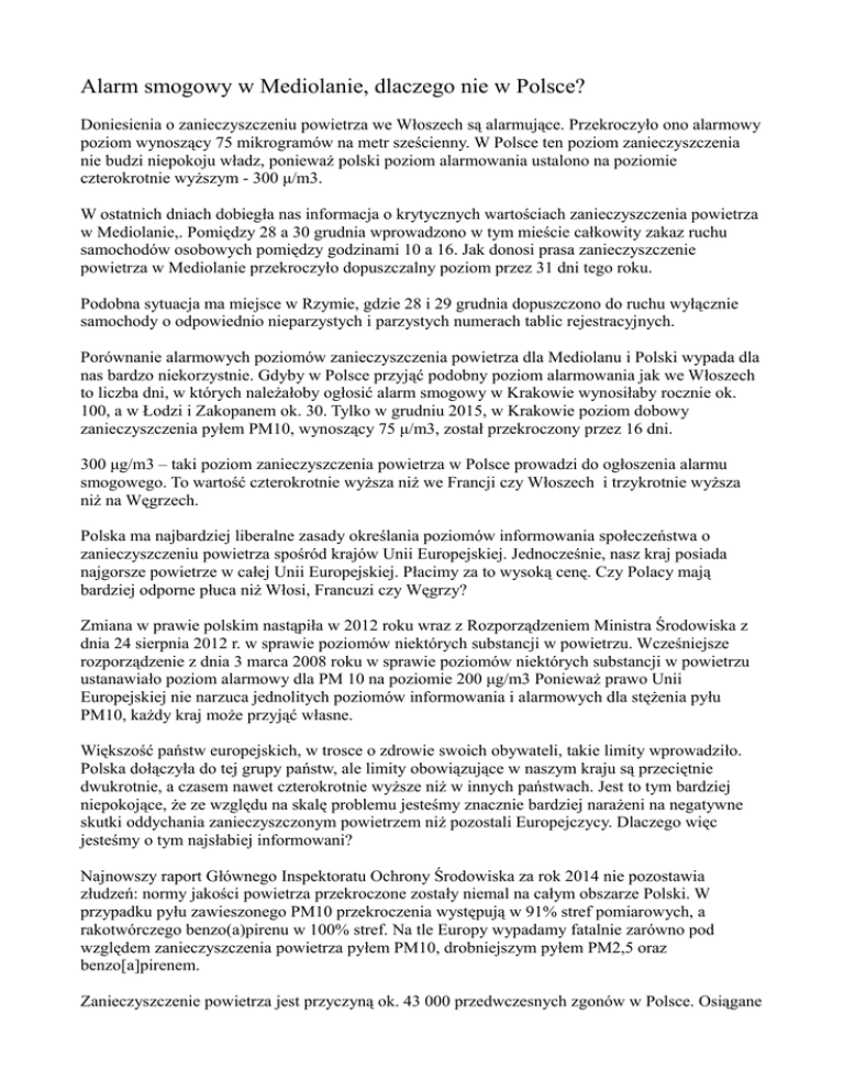 Alarm smogowy w Mediolanie, dlaczego nie w Polsce? Doniesienia o zanieczyszczeniu powietrza we Włoszech są alarmujące. Przekroczyło ono alarmowy poziom wynoszący 75 mikrogramów na metr sześcienny. W Polsce ten poziom zanieczyszczenia nie budzi niepokoju władz, ponieważ polski poziom alarmowania ustalono na poziomie czterokrotnie wyższym - 300 μ/m3. W ostatnich dniach dobiegła nas informacja o krytycznych wartościach zanieczyszczenia powietrza w Mediolanie,. Pomiędzy 28 a 30 grudnia wprowadzono w tym mieście całkowity zakaz ruchu samochodów osobowych pomiędzy godzinami 10 a 16. Jak donosi prasa zanieczyszczenie powietrza w Mediolanie przekroczyło dopuszczalny poziom przez 31 dni tego roku. Podobna sytuacja ma miejsce w Rzymie, gdzie 28 i 29 grudnia dopuszczono do ruchu wyłącznie samochody o odpowiednio nieparzystych i parzystych numerach tablic rejestracyjnych. Porównanie alarmowych poziomów zanieczyszczenia powietrza dla Mediolanu i Polski wypada dla nas bardzo niekorzystnie. Gdyby w Polsce przyjąć podobny poziom alarmowania jak we Włoszech to liczba dni, w których należałoby ogłosić alarm smogowy w Krakowie wynosiłaby rocznie ok. 100, a w Łodzi i Zakopanem ok. 30. Tylko w grudniu 2015, w Krakowie poziom dobowy zanieczyszczenia pyłem PM10, wynoszący 75 μ/m3, został przekroczony przez 16 dni. 300 μg/m3 – taki poziom zanieczyszczenia powietrza w Polsce prowadzi do ogłoszenia alarmu smogowego. To wartość czterokrotnie wyższa niż we Francji czy Włoszech i trzykrotnie wyższa niż na Węgrzech. Polska ma najbardziej liberalne zasady określania poziomów informowania społeczeństwa o zanieczyszczeniu powietrza spośród krajów Unii Europejskiej. Jednocześnie, nasz kraj posiada najgorsze powietrze w całej Unii Europejskiej. Płacimy za to wysoką cenę. Czy Polacy mają bardziej odporne płuca niż Włosi, Francuzi czy Węgrzy? Zmiana w prawie polskim nastąpiła w 2012 roku wraz z Rozporządzeniem Ministra Środowiska z dnia 24 sierpnia 2012 r. w sprawie poziomów niektórych substancji w powietrzu. Wcześniejsze rozporządzenie z dnia 3 marca 2008 roku w sprawie poziomów niektórych substancji w powietrzu ustanawiało poziom alarmowy dla PM 10 na poziomie 200 μg/m3 Ponieważ prawo Unii Europejskiej nie narzuca jednolitych poziomów informowania i alarmowych dla stężenia pyłu PM10, każdy kraj może przyjąć własne. Większość państw europejskich, w trosce o zdrowie swoich obywateli, takie limity wprowadziło. Polska dołączyła do tej grupy państw, ale limity obowiązujące w naszym kraju są przeciętnie dwukrotnie, a czasem nawet czterokrotnie wyższe niż w innych państwach. Jest to tym bardziej niepokojące, że ze względu na skalę problemu jesteśmy znacznie bardziej narażeni na negatywne skutki oddychania zanieczyszczonym powietrzem niż pozostali Europejczycy. Dlaczego więc jesteśmy o tym najsłabiej informowani? Najnowszy raport Głównego Inspektoratu Ochrony Środowiska za rok 2014 nie pozostawia złudzeń: normy jakości powietrza przekroczone zostały niemal na całym obszarze Polski. W przypadku pyłu zawieszonego PM10 przekroczenia występują w 91% stref pomiarowych, a rakotwórczego benzo(a)pirenu w 100% stref. Na tle Europy wypadamy fatalnie zarówno pod względem zanieczyszczenia powietrza pyłem PM10, drobniejszym pyłem PM2,5 oraz benzo[a]pirenem. Zanieczyszczenie powietrza jest przyczyną ok. 43 000 przedwczesnych zgonów w Polsce. Osiągane w Polsce poziomy zanieczyszczeń pyłami zawieszonymi PM10 i PM2.5 i rakotwórczymi węglowodorami aromatycznymi należą do najwyższych w państwach Unii Europejskiej. Jest zatem niezwykle ważne, aby społeczeństwo było rzetelnie informowane.