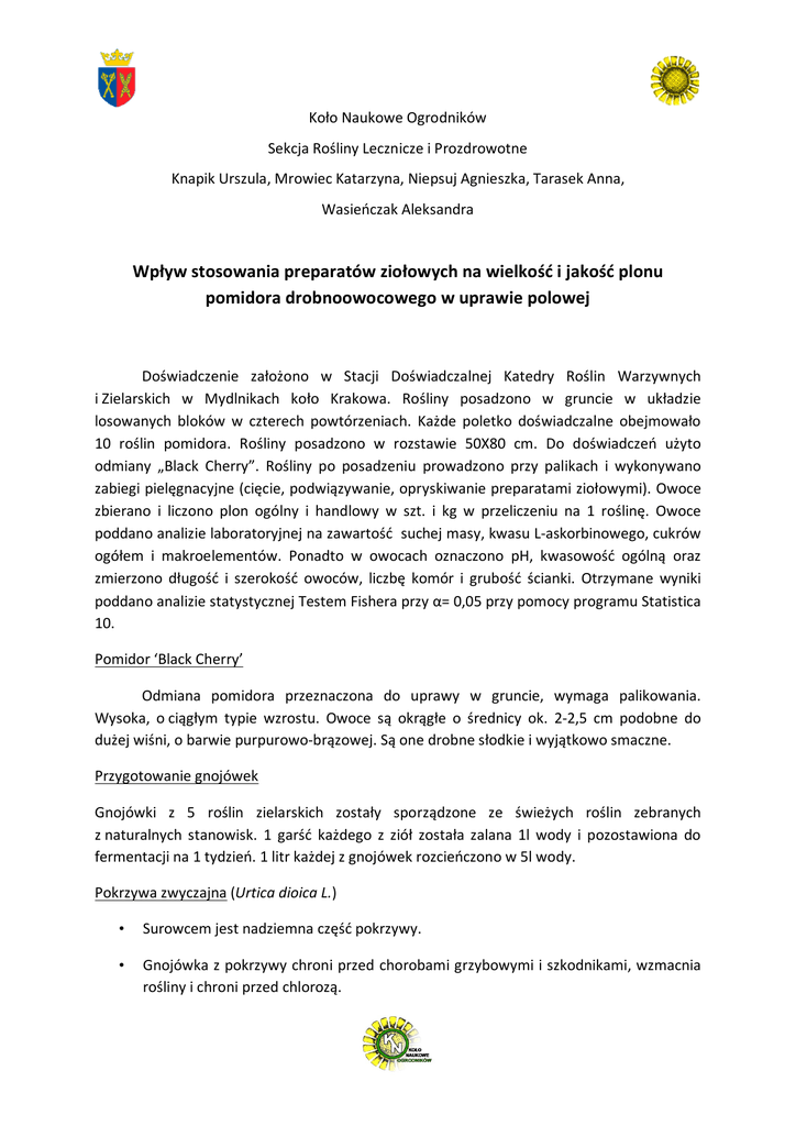 Koło Naukowe Ogrodników Sekcja Rośliny Lecznicze i Prozdrowotne Knapik Urszula, Mrowiec Katarzyna, Niepsuj Agnieszka, Tarasek Anna, Wasieńczak Aleksandra Wpływ stosowania preparatów ziołowych na wielkość i jakość plonu pomidora drobnoowocowego w uprawie polowej Doświadczenie założono w Stacji Doświadczalnej Katedry Roślin Warzywnych i Zielarskich w Mydlnikach koło Krakowa. Rośliny posadzono w gruncie w układzie losowanych bloków w czterech powtórzeniach. Każde poletko doświadczalne obejmowało 10 roślin pomidora. Rośliny posadzono w rozstawie 50X80 cm. Do doświadczeń użyto odmiany „Black Cherry”. Rośliny po posadzeniu prowadzono przy palikach i wykonywano zabiegi pielęgnacyjne (cięcie, podwiązywanie, opryskiwanie preparatami ziołowymi). Owoce zbierano i liczono plon ogólny i handlowy w szt. i kg w przeliczeniu na 1 roślinę. Owoce poddano analizie laboratoryjnej na zawartość suchej masy, kwasu L-askorbinowego, cukrów ogółem i makroelementów. Ponadto w owocach oznaczono pH, kwasowość ogólną oraz zmierzono długość i szerokość owoców, liczbę komór i grubość ścianki. Otrzymane wyniki poddano analizie statystycznej Testem Fishera przy α= 0,05 przy pomocy programu Statistica 10. Pomidor ‘Black Cherry’ Odmiana pomidora przeznaczona do uprawy w gruncie, wymaga palikowania. Wysoka, o ciągłym typie wzrostu. Owoce są okrągłe o średnicy ok. 2-2,5 cm podobne do dużej wiśni, o barwie purpurowo-brązowej. Są one drobne słodkie i wyjątkowo smaczne. Przygotowanie gnojówek Gnojówki z 5 roślin zielarskich zostały sporządzone ze świeżych roślin zebranych z naturalnych stanowisk. 1 garść każdego z ziół została zalana 1l wody i pozostawiona do fermentacji na 1 tydzień. 1 litr każdej z gnojówek rozcieńczono w 5l wody. Pokrzywa zwyczajna (Urtica dioica L.) • Surowcem jest nadziemna część pokrzywy. • Gnojówka z pokrzywy chroni przed chorobami grzybowymi i szkodnikami, wzmacnia rośliny i chroni przed chlorozą. • Zawiera dużo azotu, żelaza, wapnia, fosforu i magnezu oraz kwasy organiczne, witaminy (C, K, B2), flawonoidy, garbniki, karotenoidy, ksantofile, fitosterole, związki aminowe, chlorofile a i b (do 0,75%). Skrzyp polny (Equisetum arvense L.) • Stosuje się zielone pędy skrzypu polnego bez dolnej brunatnej części. • Kwas krzemowy zawarty w skrzypie wzmacnia rośliny, zapobiega i zwalcza wiele chorób grzybowych oraz niszczy szkodniki. • Zawiera krzemionkę, flawonoidy, karotenoidy, fitosterole, witaminy, saponiny o działaniu cytotoksycznym, wirusostatycznym i bakteriobójczym. Wrotycz pospolity (Tanacetum vulgare L.) • Wykorzystuje się części nadziemne • Zawiera olejki eteryczne, flawonoidy, garbniki, gorycze (β-tujon, izotujon), kwasy organiczne, monoterpenoidy oraz dużą zawartość potasu. Orzech włoski (Juglans regia L.) • Surowcem są liście. • W liściach występuje do 10 % garbników elagowych, związki naftochinonowe (juglon), flawonoidy, trójterpeny, witaminy i sole mineralne. • Wykazuje silne działanie przeciwbakteryjne, przeciwgrzybiczne i wirusostatyczne. Czosnek pospolity (Allium sativum L.) • Stosuje się cebule. • Zawiera mieszaninę pochodnych siarkowych (o działaniu bakteriobójczym - allicyna). Ponadto wykryto w nim cukry, fitosterole, flawonoidy, śluzy i pektyny, szereg witamin, sole mineralne, kwas nikotynowy i jego amid. • Działa bakteriobójczo, niszczy liczne drobnoustroje, drożdże, grzyby i wirusy. Wyniki Plon ogólny i plon handlowy 1,60 kg owoców / 1 roślinę 1,40 f d 1,20 1,00 e c 0,80 Plon ogólny średnie w kg 0,60 0,40 d c b b b wrotycz czosnek a a Plon handlowy w kg b 0,20 0,00 kontrola orzech włoski skrzyp pokrzywa a, b, c… - różne litery oznaczają różnice statystyczne Plon handlowy w sztukach 80,00 szt. owoców / 1 roślinę 70,00 f e 60,00 50,00 d 40,00 c 30,00 20,00 b a 10,00 0,00 kontrola orzech włoski wrotycz czosnek skrzyp pokrzywa Sucha masa 9,75 d 9,50 s.m. % 9,25 c bc bc b 9,00 8,75 a 8,50 8,25 kontrola orzech włoski wrotycz czosnek skrzyp pokrzywa pH 5,50 f 5,45 e 5,40 d 5,35 c 5,30 b a 5,25 5,20 kontrola orzech włoski wrotycz czosnek skrzyp pokrzywa Kwas L-askorbinowy 40,00 35,00 c c b c wrotycz czosnek skrzyp d mg 100 g-1 św. m. 30,00 a 25,00 20,00 15,00 10,00 5,00 0,00 kontrola orzech włoski pokrzywa Kwasowość 0,60 0,50 d 0,40 c d c b % a 0,30 0,20 0,10 0,00 kontrola orzech włoski wrotycz czosnek skrzyp pokrzywa Cukry 5,60 5,40 e mg 100 g-1 św. m. 5,20 d 5,00 4,80 cd bc b 4,60 a 4,40 4,20 4,00 kontrola orzech włoski wrotycz czosnek skrzyp pokrzywa Parametry owoców pomidora Obiekt Długość owocu (cm) Szerokość owocu (cm) Liczba komór (szt.) Grubość ścianek (mm) kontrola 32,54 bcd 33,49 abc 2,00 a 4,39 a orzech włoski 30,58 abc 31,52 a 2,00 a 4,52 a wrotycz 30,17 ab 32,09 ab 2,00 a 5,37 a czosnek 33,33 d 35,26 c 2,33 a 5,42 a skrzyp 28,63 a 31,17 a 2,33 a 3,59 a pokrzywa 32,93 cd 34,24 bc 2,00 a 3,84 a Zawartość makroelementów w owocach pomidora K Obiekt Mg Ca P (mg 100 g-1 s. m.) (mg 100 g-1 s. m.) (mg 100 g-1 s. m.) (mg 100 g-1 s. m.) kontrola 225,90 c 7,70 b 13,23 bc 26,42 c orzech włoski 212,32 ab 6,07 a 8,67 a 26,46 c wrotycz 209,94 a 6,07 a 14,47 c 21,86 ab czosnek 207,01 a 6,16 a 9,83 ab 23,45 b skrzyp 248,09 d 7,30 b 11,87 abc 26,64 c pokrzywa 216,15 b 5,62 a 8,67 a 19,44 a Wnioski 1. Najwyższy plon ogólny i handlowy uzyskano z roślin opryskanych preparatami z pokrzywy i orzecha włoskiego. Owoce z tych roślin zawierały również najwyższe zawartości suchej masy, cukrów i cechowały się najwyższą kwasowością. 2. Najniższym pH cechowały się owoce z kontroli, a najwyższym rośliny potraktowane gnojówką z pokrzywy. 3. Najwyższą zawartość kwasu L-askorbinowego zanotowano u roślin opryskanych pokrzywą, a najniższą u roślin opryskanych czosnkiem i orzechem włoskim. 4. Rośliny opryskane preparatem z czosnku wykształciły najszersze i najdłuższe owoce. 5