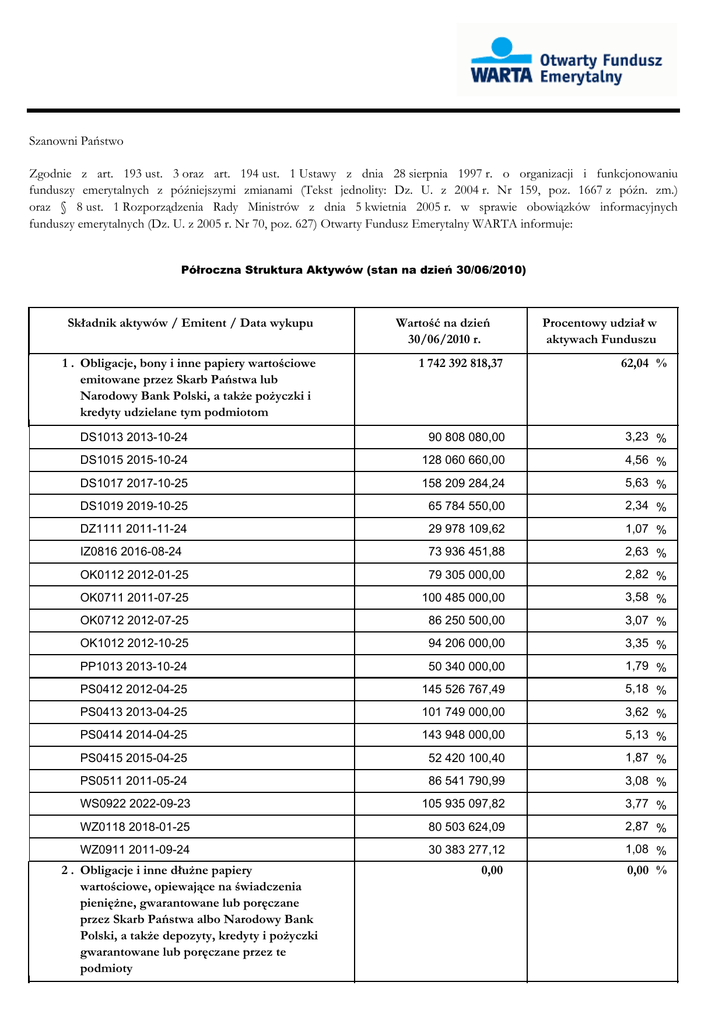 Szanowni Państwo Zgodnie z art. 193 ust. 3 oraz art. 194 ust. 1 Ustawy z dnia 28 sierpnia 1997 r. o organizacji i funkcjonowaniu funduszy emerytalnych z późniejszymi zmianami (Tekst jednolity: Dz. U. z 2004 r. Nr 159, poz. 1667 z późn. zm.) oraz § 8 ust. 1 Rozporządzenia Rady Ministrów z dnia 5 kwietnia 2005 r. w sprawie obowiązków informacyjnych funduszy emerytalnych (Dz. U. z 2005 r. Nr 70, poz. 627) Otwarty Fundusz Emerytalny WARTA informuje: Półroczna Struktura Aktywów (stan na dzień 30/06/2010) Składnik aktywów / Emitent / Data wykupu 1 . Obligacje, bony i inne papiery wartościowe emitowane przez Skarb Państwa lub Narodowy Bank Polski, a także pożyczki i kredyty udzielane tym podmiotom Wartość na dzień 30/06/2010 r. Procentowy udział w aktywach Funduszu 1 742 392 818,37 62,04 % DS1013 2013-10-24 90 808 080,00 3,23 % DS1015 2015-10-24 128 060 660,00 4,56 % DS1017 2017-10-25 158 209 284,24 5,63 % DS1019 2019-10-25 65 784 550,00 2,34 % DZ1111 2011-11-24 29 978 109,62 1,07 % IZ0816 2016-08-24 73 936 451,88 2,63 % OK0112 2012-01-25 79 305 000,00 2,82 % OK0711 2011-07-25 100 485 000,00 3,58 % OK0712 2012-07-25 86 250 500,00 3,07 % OK1012 2012-10-25 94 206 000,00 3,35 % PP1013 2013-10-24 50 340 000,00 1,79 % PS0412 2012-04-25 145 526 767,49 5,18 % PS0413 2013-04-25 101 749 000,00 3,62 % PS0414 2014-04-25 143 948 000,00 5,13 % PS0415 2015-04-25 52 420 100,40 1,87 % PS0511 2011-05-24 86 541 790,99 3,08 % WS0922 2022-09-23 105 935 097,82 3,77 % WZ0118 2018-01-25 80 503 624,09 2,87 % WZ0911 2011-09-24 30 383 277,12 1,08 % 0,00 0,00 % 2 . Obligacje i inne dłużne papiery wartościowe, opiewające na świadczenia pieniężne, gwarantowane lub poręczane przez Skarb Państwa albo Narodowy Bank Polski, a także depozyty, kredyty i pożyczki gwarantowane lub poręczane przez te podmioty Składnik aktywów / Emitent / Data wykupu 3 . Depozyty bankowe i bankowe papiery wartościowe, w walucie polskiej Wartość na dzień 30/06/2010 r. Procentowy udział w aktywach Funduszu 111 792 802,51 3,98 % 111 577 261,68 3,97 % 4 . Depozyty bankowe i bankowe papiery wartościowe, w walutach państw będących członkami OECD oraz innych państw, z którymi Rzeczpospolita Polska zawarła umowy o popieraniu i wzajemnej ochronie inwestycji, z tym że waluty te mogą być nabywane wyłącznie w celu rozliczenia bieżących zobowiązań funduszu 0,00 0,00 % 5 . Akcje spółek notowanych na regulowanym rynku giełdowym, a także notowane na regulowanym rynku giełdowym prawa poboru, prawa do akcji oraz obligacje zamienne na akcje tych spółek 803 336 719,03 28,60 % Bank Polska Kasa Opieki S.A. 62 385 014,97 2,22 % KGHM Polska Miedź S.A. 32 497 335,33 1,16 % Lubelski Węgiel Bogdanka S.A. 31 096 384,02 1,11 % Polski Koncern Naftowy ORLEN S.A. 43 883 054,83 1,56 % Powszechna Kasa Oszczędności Bank Polski S.A. 67 609 111,05 2,41 % 0,00 0,00 % 3 355 129,18 0,12 % 8 . Certyfikaty inwestycyjne emitowane przez fundusze inwestycyjne zamknięte 0,00 0,00 % 9 . Jednostki uczestnictwa zbywane przez fundusze inwestycyjne otwarte lub specjalistyczne fundusze inwestycyjne otwarte 0,00 0,00 % 0,00 0,00 % Bank Millennium S.A. 2010-07-01 6 . Akcje spółek notowanych na rynku pozagiełdowym lub zdematerializowane zgodnie z przepisami ustawy z dnia 29 lipca 2005 r. o obrocie instrumentami finansowymi akcje spółek niebędące przedmiotem obrotu na rynku regulowanym, a także notowane na regulowanym rynku pozagiełdowym lub zdematerializowane, lecz nienotowane na rynku regulowanym, prawa poboru, prawa do akcji oraz obligacje zamienne na akcje tych spółek 7 . Akcje narodowych funduszy inwestycyjnych 10 . Obligacje i inne dłużne papiery wartościowe emitowane przez jednostki samorządu terytorialnego, ich związki lub miasto stołeczne Warszawa, zdematerializowane zgodnie z przepisami ustawy, o której mowa w pkt 6 Składnik aktywów / Emitent / Data wykupu Wartość na dzień 30/06/2010 r. Procentowy udział w aktywach Funduszu 11 . Inne niż zdematerializowane obligacje i inne dłużne papiery wartościowe emitowane przez jednostki samorządu terytorialnego, ich związki lub miasto stołeczne Warszawa 0,00 0,00 % 12 . Obligacje przychodowe, o których mowa w ustawie z dnia 29 czerwca 1995 r. o obligacjach 0,00 0,00 % 13 . Zdematerializowane zgodnie z ustawą, o której mowa w pkt 6, obligacje emitowane przez podmioty inne niż jednostki samorządu terytorialnego, ich związki, miasto stołeczne Warszawa, które zostały zabezpieczone w wysokości odpowiadającej pełnej wartości nominalnej i ewentualnemu oprocentowaniu 0,00 0,00 % 14 . Inne niż zdematerializowane obligacje i inne dłużne papiery wartościowe emitowane przez inne podmioty niż jednostki samorządu terytorialnego, ich związki, miasto stołeczne Warszawa, które zostały zabezpieczone w wysokości odpowiadającej wartości nominalnej wraz z ewentualnym oprocentowaniem 0,00 0,00 % 15 . Obligacje i inne dłużne papiery wartościowe emitowane przez spółki publiczne, inne niż papiery wartościowe, o których mowa w pkt 13 i 14 90 497 779,00 3,22 % 16 . Zdematerializowane zgodnie z przepisami ustawy, o której mowa w pkt 6, obligacje i inne dłużne papiery wartościowe, inne niż w pkt 10 i 13 0,00 0,00 % 20 041 200,00 0,71 % 0,00 0,00 % 26 566 000,00 0,95 % 9 000 907,81 0,32 % 1 427 111,14 0,05 % 17 . Listy zastawne 18 . Kwity depozytowe, w rozumieniu ustawy z dnia 29 lipca 2005 r. o obrocie instrumentami finansowymi, dopuszczone do obrotu na rynku regulowanym na terytorium Rzeczpospolitej Polskiej 19 . Obligacje emitowane przez Bank Gospodarstwa Krajowego na zasadach określonych w ustawie z dnia 27 października 1994 r. o autostradach płatnych oraz o Krajowym Funduszu Drogowym 20 . Należności 21 . Środki pieniężne Aktywa razem 2 808 410 467,04 100,00 % Składnik aktywów / Emitent / Data wykupu Wartość na dzień 30/06/2010 r. Procentowy udział w aktywach Funduszu Łączymy wyrazy szacunku Zarząd PTE WARTA S.A.