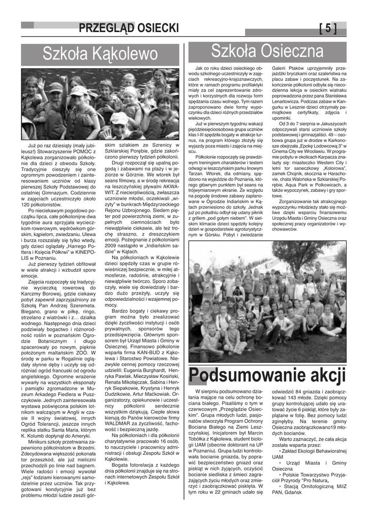 PRZEGLĄD OSIECKI Szkoła Kąkolewo Już po raz dziesiąty (mały jubileusz!) Stowarzyszenie POMOC z Kąkolewa zorganizowało półkolonie dla dzieci z obwodu Szkoły. Tradycyjnie cieszyły się one ogromnym powodzeniem i zainteresowaniem uczniów od klasy pierwszej Szkoły Podstawowej do ostatniej Gimnazjum. Codziennie w zajęciach uczestniczyło około 120 półkolonistów. Po nieciekawym pogodowo początku lipca, całe półkolonijne dwa tygodnie aura sprzyjała wycieczkom rowerowym, wędrówkom górskim, kąpielom, zwiedzaniu. Ulewa i burza rozszalały się tylko wtedy, gdy dzieci oglądały „Harrego Pottera i Księcia Półkrwi” w KINEPOLIS w Poznaniu. Już pierwszy tydzień obfitował w wiele atrakcji i wzbudził spore emocje. Zajęcia rozpoczęły się tradycyjnie wycieczką rowerową do Karczmy Borowej, gdzie ciekawy pobyt zapewnił zaprzyjaźniony ze Szkołą Pan Andrzej Szeremeta. Biegano, grano w piłkę, ringo, strzelano z wiatrówki i z… działka wodnego. Następnego dnia dzieci podziwiały bogactwo i różnorodność roślin w poznańskim Ogrodzie Botanicznym i długo spacerowały po nowym, pięknie położonym maltańskim ZOO. W środę w parku w Rogalinie oglądały słynne dęby i uczyły się odróżniać ogród francuski od ogrodu angielskiego. Ogromne wrażenie wywarły na wszystkich eksponaty i pamiątki zgromadzone w Muzeum Arkadego Fiedlera w Puszczykowie. Jednych zainteresowała wystawa poświęcona polskim lotnikom walczącym w Anglii w czasie II wojny światowej, innych Ogród Tolerancji, jeszcze innych replika statku Santa Maria, którym K. Kolumb dopłynął do Ameryki. Minikurs szkoły przetrwania zapewniono półkolnistom w Brzedni. Zdecydowana większość pokonała tor przeszkód, ale już nieliczni przechodzili po linie nad bagnem. Wiele radości i emocji wywołał „rejs” łodziami kierowanymi samodzielnie przez uczniów. Tak przygotowani kondycyjnie już bez problemu młodzi ludzie zeszli gór- skim szlakiem ze Szrenicy w Szklarskiej Porębie, gdzie zakończono pierwszy tydzień półkolonii. Drugi rozpoczął się upalną pogodą i zabawami na plaży i w jeziorze w Górznie. We wtorek był seans filmowy, a w środę rekreacja na leszczyńskiej pływalni AKWAWIT. Z niecierpliwością, zwłaszcza uczniowie młodsi, oczekiwali „wizyty” w bunkrach Międzyrzeckiego Rejonu Uzbrojonego. Siedem pięter pod powierzchnią ziemi, w zupełnych ciemnościach było niewątpliwie ciekawie, ale też trochę straszno, z dreszczykiem emocji. Pożegnanie z półkoloniami 2009 nastąpiło w „Indiańskim sadzie” w Kątach. Na półkoloniach w Kąkolewie dzieci spędziły czas w grupie rówieśniczej bezpiecznie, w miłej atmosferze, radośnie, atrakcyjnie i niewątpliwie twórczo. Sporo zobaczyły, wiele się dowiedziały i bardzo dużo przeżyły, uczyły się odpowiedzialności i wzajemnej pomocy. Bardzo bogaty i ciekawy program można było zrealizować dzięki życzliwości instytucji i osób prywatnych, sponsorów tego przedsięwzięcia. Głównym sponsorem był Urząd Miasta i Gminy w Osiecznej. Finansowo półkolonie wsparła firma KAN-BUD z Kąkolewa i Starostwo Powiatowe. Niezwykle cennej pomocy rzeczowej udzielili: Eugenia Burghardt, Henryka Pawlak, Mieczysław Kosiński, Renata Mikołajczak, Sabina i Henryk Siepakowie, Krystyna i Henryk Dudzikowie, Artur Maćkowiak. Organizatorzy, opiekunowie i uczestnicy półkolonii serdecznie wszystkim dziękują. Ciepłe słowa kierują do Panów kierowców firmy WALDMAR za życzliwość, fachowość i bezpieczną jazdę. Na półkoloniach i dla półkolonii charytatywnie pracowało 16 osób, to nauczyciele i pracownicy administracji i obsługi Zespołu Szkół w Kąkolewie. Bogata fotorelacja z każdego dnia półkolonii znajduje się na stronach internetowych Zespołu Szkół i Kąkolewa. [5] Szkoła Osieczna Jak co roku dzieci osieckiego obwodu szkolnego uczestniczyły w zajęciach rekreacyjno-krajoznawczych, które w ramach programu profilaktyki miały za cel zaprezentowanie zdrowych i korzystnych dla rozwoju form spędzania czasu wolnego. Tym razem zaproponowano dwie formy wypoczynku dla dzieci różnych przedziałów wiekowych. Już w pierwszym tygodniu wakacji pięćdziesięcioosobowa grupa uczniów klas I-III spędziła bogaty w atrakcje turnus, na program którego złożyły się wyjazdy poza miasto i zajęcia na miejscu. Półkolonie rozpoczęły się prawdziwym treningiem charakterów i testem odwagi w leszczyńskim parku linowym Tarzan. Wtorek, dla odmiany, spędzono na wyjeździe do Poznania, którego głównym punktem był seans na trójwymiarowym ekranie. Ze względu na pogodę środowe zabawy zaplanowane w Ogrodzie Indiańskim w Kątach przeniesiono do szkoły. Jednak już po południu odbył się udany piknik z grillem „pod gołym niebem”. W sielskim klimacie dzieci spędziły kolejny dzień w gospodarstwie agroturystycznym w Górsku. Pobyt i zwiedzanie Galerii Ptaków uprzyjemniły przejażdżki bryczkami oraz szaleństwa na placu zabaw i poczęstunek. Na zakończenie półkolonii odbyła się niecodzienna lekcja w osieckim wiatraku poprowadzona przez pana Stanisława Lenartowicza. Podczas zabaw w Kangurku w Lesznie dzieci otrzymały pamiątkowe certyfikaty, zdjęcia i upominki. Od 3 do 7 sierpnia w Jakuszycach odpoczywali starsi uczniowie szkoły podstawowej i gimnazjaliści. 49 – osobowa grupa już w drodze w Karkonosze obejrzała „Epokę Lodowcową 3” w Cinema City we Wrocławiu. W programie pobytu w okolicach Karpacza znalazły się: miasteczko Western City i letni tor saneczkowy „Kolorowa”, zamek Chojnik, skocznia w Harachovie, chata Walońska w Szklarskiej Porębie, Aqua Park w Polkowicach, a także wypoczynek, zabawy i gry sportowe. Zorganizowanie tak atrakcyjnego wypoczynku młodzieży stało się możliwe dzięki wsparciu finansowemu Urzędu Miasta i Gminy Osieczna oraz społecznej pracy organizatorów i wychowawców. Podsumowanie akcji W sierpniu podsumowano działan