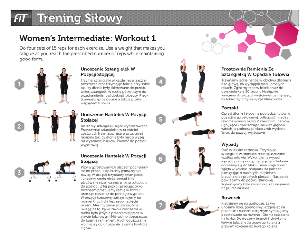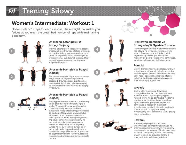 Trening Siłowy Women’s Intermediate: Workout 1 Do four sets of 15 reps for each exercise. Use a weight that makes you fatigue as you reach the prescribed number of reps while maintaining good form. Prostownie Ramienia Ze Sztangielką W Opadzie Tułowia Unoszenie Sztangielek W Pozycji Stojącej 1 Trzymaj sztangielki w każdej ręce, zacznij prostować ręce trzymając łokcie przy sobie tak, by dłonie były skierowane do przodu. Unieś sztangielki w ruchu półkolistym do przedramienia, byś dotknął bicepsy. Plecy trzymaj wyprostowane a łokcie proste względem tułowia. 4 Trzymamy jedną hantle w obydwu dłoniach nad głową, na wyciągniętych i prostych rękach. Zginamy ręce w łokciach aż do uzyskania kąta 90 stopni. Następnie wracamy do pozycji wyjściowej pamiętając, by łokieć był trzymany był blisko ucha. Pompki 2 Unoszenie Hantelek W Pozycji Stojącej Bierzemy sztangielki. Ręce wyprostowane. Przytrzymaj sztangielkę w przedniej części ud. Trzymając ręce prosto, unieś ramiona tak, by dłonie były nieco wyżej od wysokości barków. Powróć do pozycji wyjściowej. Unoszenie Hantelek W Pozycji Stojącej 3 5 Przy wyprostowanych plecach pochylamy się do przodu i opieramy jedną ręką o ławkę. W drugiej trzymamy sztangielkę i unosimy ramię nieco ponad linię pleców(nie niżej)-przedramię prostopadle do podłogi. Z tej pozycji pracując tylko tricepsem prostujemy ramię w łokciu unosząc ciężar aż do pełnego wyprostu. W pozycji końcowej zatrzymujemy na moment ruch dla lepszego napięcia mięśni. Musimy zwracać szczególną uwagę na to, by w trakcie ćwiczenia w ruchu było jedynie przedramię(praca w stawie łokciowym).Nie wolno dopuszczać do bujania ramieniem. Ruch opuszczania wolniejszy od unoszenia, z pełną kontrolą ciężaru. Oprzyj dłonie i stopy na podłodze, tułów w pozycji wyprostowanej. odległość między rękoma wynosi około 2 szerokości barków, ugnij ręce i opuszczając się weź głęboki wdech, a podnosząc ciało zrób wydech. Wróć do pozycji wyjściowej. Wypady 6 Stań w lekkim rozkroku. Trzymając sztangielki w dłoniach ręce opuszczone wzdłuż tułowia. Wykonujemy wypad wprzód prawą nogą, zginając ją w kolanie obniżamy się do klęku. Lewa noga lekko zgięta w kolanie, podparta na palcach. pamiętając o napiętych mięśniach brzucha oraz prostych plecach. Następnie powracamy do pozycji startowej. Wykonujemy klęki zamiennie, raz na prawą nogę, raz na lewą. Rowerek 7 Kładziemy się na podłodze. Lekko unosimy nogi, podnosimy je zginając na przemian i ruchem okrężnym symulujemy pedałowanie na rowerze. Dłonie splecione na karku. Dokręcamy brzuch i dotykamy lewym łokciem do prawego kolana a prawym łokciem do lewego kolana.