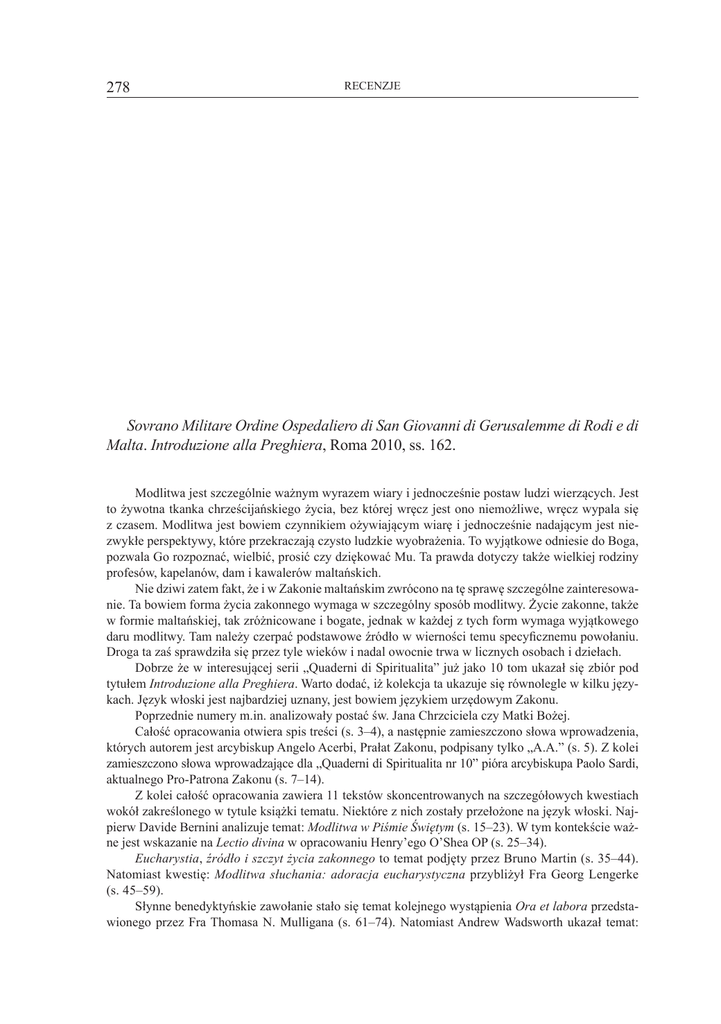 278 recenzje Sovrano Militare Ordine Ospedaliero di San Giovanni di Gerusalemme di Rodi e di Malta. Introduzione alla Preghiera, Roma 2010, ss. 162. Modlitwa jest szczególnie ważnym wyrazem wiary i jednocześnie postaw ludzi wierzących. Jest to żywotna tkanka chrześcijańskiego życia, bez której wręcz jest ono niemożliwe, wręcz wypala się z czasem. Modlitwa jest bowiem czynnikiem ożywiającym wiarę i jednocześnie nadającym jest niezwykłe perspektywy, które przekraczają czysto ludzkie wyobrażenia. To wyjątkowe odniesie do Boga, pozwala Go rozpoznać, wielbić, prosić czy dziękować Mu. Ta prawda dotyczy także wielkiej rodziny profesów, kapelanów, dam i kawalerów maltańskich. Nie dziwi zatem fakt, że i w Zakonie maltańskim zwrócono na tę sprawę szczególne zainteresowanie. Ta bowiem forma życia zakonnego wymaga w szczególny sposób modlitwy. Życie zakonne, także w formie maltańskiej, tak zróżnicowane i bogate, jednak w każdej z tych form wymaga wyjątkowego daru modlitwy. Tam należy czerpać podstawowe źródło w wierności temu specyficznemu powołaniu. Droga ta zaś sprawdziła się przez tyle wieków i nadal owocnie trwa w licznych osobach i dziełach. Dobrze że w interesującej serii „Quaderni di Spiritualita” już jako 10 tom ukazał się zbiór pod tytułem Introduzione alla Preghiera. Warto dodać, iż kolekcja ta ukazuje się równolegle w kilku językach. Język włoski jest najbardziej uznany, jest bowiem językiem urzędowym Zakonu. Poprzednie numery m.in. analizowały postać św. Jana Chrzciciela czy Matki Bożej. Całość opracowania otwiera spis treści (s. 3–4), a następnie zamieszczono słowa wprowadzenia, których autorem jest arcybiskup Angelo Acerbi, Prałat Zakonu, podpisany tylko „A.A.” (s. 5). Z kolei zamieszczono słowa wprowadzające dla „Quaderni di Spiritualita nr 10” pióra arcybiskupa Paolo Sardi, aktualnego Pro-Patrona Zakonu (s. 7–14). Z kolei całość opracowania zawiera 11 tekstów skoncentrowanych na szczegółowych kwestiach wokół zakreślonego w tytule książki tematu. Niektóre z nich zostały przełożone na język włoski. Najpierw Davide Bernini analizuje temat: Modlitwa w Piśmie Świętym (s. 15–23). W tym kontekście ważne jest wskazanie na Lectio divina w opracowaniu Henry’ego O’Shea OP (s. 25–34). Eucharystia, źródło i szczyt życia zakonnego to temat podjęty przez Bruno Martin (s. 35–44). Natomiast kwestię: Modlitwa słuchania: adoracja eucharystyczna przybliżył Fra Georg Lengerke (s. 45–59). Słynne benedyktyńskie zawołanie stało się temat kolejnego wystąpienia Ora et labora przedstawionego przez Fra Thomasa N. Mulligana (s. 61–74). Natomiast Andrew Wadsworth ukazał temat: recenzje 279 Krótki przewodnik dla medytacji (s. 75–85). Nie można oczywiście pominąć analizy kwestii Różaniec ukazanej przez Fra Costantino Gilardi OP (s. 87–104). Modlitwę dla rozwoju powołań i formacji ukazał Fra Duncan Gallie (s. 105–116). Dobrze, że nie zabrakło tematu: Modlitwa i aktywność szpitalna podjętego przez Dominique de la Rochefoucauld de Montbel (s. 117–128). Z kolei Propozycja modlitwy dla młodzieży to kwestia ukazana przez Michelangelo Ranuzzi de’Bianchi (s. 129–139). Jeszcze Reflektując nad „Ojcze nasz” omówił arcybiskup Angelo Acerbi (s. 141–157). Całość książki zamyka In memoriam poświęcone kardynałowi Pio Laghi, autorem jest arcybiskup Angelo Acerbi, podpisany A.A. (s. 159–162). Jest to interesujące przywołanie krótkiego curriculum vitae wybitnego dyplomaty i Kardynała, wieloletniego Patrona Zakonu i Prefekta Kongregacji Edukacji Katolickiej. Był on symbolem umiłowania Zakonu Maltańskiego ze strony Kościoła, a zwłaszcza Jana Pawła II. Oto interesująca publikacja wokół problematyki modlitwy w Zakonie Maltańskim. Praca wyraźnie ukazuje, że jest ona szczególnie wyraźnie wpisana w dzieła spełnianie w duchu starożytnej maksymy maltańskiej: Tuitio fidei et obsequium pauperum. Zatem to nie jest tylko zawołanie czy teoretyczny slogan. To jest ciągle aktualne i żywe zobowiązanie, dostosowywane nieustannie do okoliczności miejsca i czasu, do owego hic et nunc. Modlitwa zaś jest niezbędnym, wręcz koniecznym i życiodajnym duchowo środowiskiem tych dzieł oraz ich owocnym gwarantem. Jak wskazują teksty informacyjne niniejsza publikacja jest swoistym pokłosiem Międzynarodowej Konferencji Zakonnej, która obradował na Malcie w 2004 r. Warto jeszcze dodać, że problematyka modlitwy wybrzmiała także wyraźnie podczas Międzynarodowego Seminarium, które obradowało w Wenecji w styczniu 2008 r. To bardzo ważne, że Zakon chętnie pochyla się nad problematyką modlitwy, widzianej w tak bogatych formach, a w tym i tradycyjnych, choćby różaniec. Jest to dobre rozpoznanie oczekiwanej owocności tej drogi chrześcijańskiego życia. Przekazane w prezentowanej książce teksty przemyśleń są szczególnie interesujące, wyszły bowiem w znacznej większości spod pióra członków Zakonu albo osób z nim związanych w różnych formach. Reprezentują oni różne stopnie przynależności, co dodatkowo czyni ogląd modlitwy jeszcze bardziej wszechstronny i wiarygodny. Są to zatem eksperci, a jak wskazuje lektura nie tylko teoretycy, ale ludzie, którym jest bliska systematyczna praktyka modlitwy. Dobre jest także wychylenie propozycji ku różnym członkom Kościoła, którzy interesując się Zakonem. Cała tradycja wyraźnie wskazuje, że Zakon zawsze łączył modlitwę i działanie. Wręcz duch modlitwy winien animować wszelkie posługi wobec potrzebujących (s. 5). To jest swoista dynamika maltańska, która została pozytywnie zweryfikowana na przestrzeni tylu wieków i zapewne dlatego Zakon owocnie trwa nadal i jednocześnie niesie w sobie perspektywę. To innym znak rozeznania ora et labora, niż m.in. prezentują to zakony wywodzące się z charyzmatu benedyktyńskiego. Prezentowana