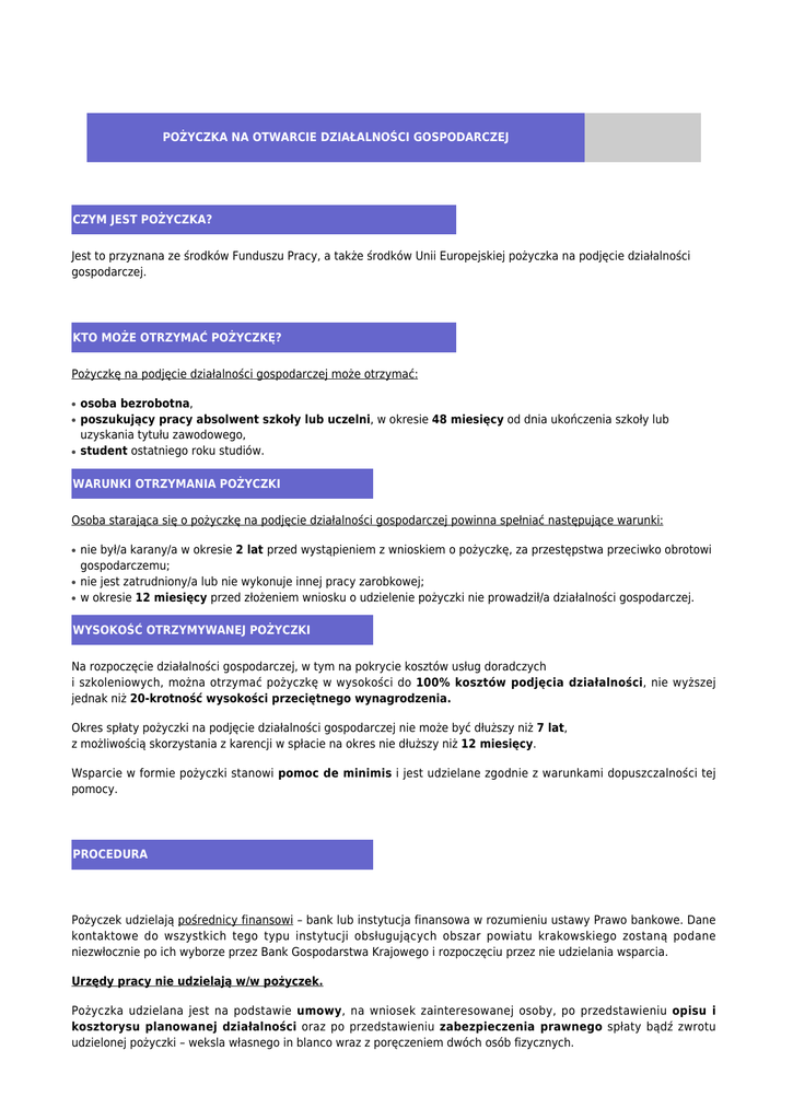 POŻYCZKA NA OTWARCIE DZIAŁALNOŚCI GOSPODARCZEJ CZYM JEST POŻYCZKA? Jest to przyznana ze środków Funduszu Pracy, a także środków Unii Europejskiej pożyczka na podjęcie działalności gospodarczej. KTO MOŻE OTRZYMAĆ POŻYCZKĘ? Pożyczkę na podjęcie działalności gospodarczej może otrzymać: ● ● ● osoba bezrobotna, poszukujący pracy absolwent szkoły lub uczelni, w okresie 48 miesięcy od dnia ukończenia szkoły lub uzyskania tytułu zawodowego, student ostatniego roku studiów. WARUNKI OTRZYMANIA POŻYCZKI Osoba starająca się o pożyczkę na podjęcie działalności gospodarczej powinna spełniać następujące warunki: ● ● ● nie był/a karany/a w okresie 2 lat przed wystąpieniem z wnioskiem o pożyczkę, za przestępstwa przeciwko obrotowi gospodarczemu; nie jest zatrudniony/a lub nie wykonuje innej pracy zarobkowej; w okresie 12 miesięcy przed złożeniem wniosku o udzielenie pożyczki nie prowadził/a działalności gospodarczej. WYSOKOŚĆ OTRZYMYWANEJ POŻYCZKI Na rozpoczęcie działalności gospodarczej, w tym na pokrycie kosztów usług doradczych i szkoleniowych, można otrzymać pożyczkę w wysokości do 100% kosztów podjęcia działalności, nie wyższej jednak niż 20-krotność wysokości przeciętnego wynagrodzenia. Okres spłaty pożyczki na podjęcie działalności gospodarczej nie może być dłuższy niż 7 lat, z możliwością skorzystania z karencji w spłacie na okres nie dłuższy niż 12 miesięcy. Wsparcie w formie pożyczki stanowi pomoc de minimis i jest udzielane zgodnie z warunkami dopuszczalności tej pomocy. PROCEDURA Pożyczek udzielają pośrednicy finansowi – bank lub instytucja finansowa w rozumieniu ustawy Prawo bankowe. Dane kontaktowe do wszystkich tego typu instytucji obsługujących obszar powiatu krakowskiego zostaną podane niezwłocznie po ich wyborze przez Bank Gospodarstwa Krajowego i rozpoczęciu przez nie udzielania wsparcia. Urzędy pracy nie udzielają w/w pożyczek. Pożyczka udzielana jest na podstawie umowy, na wniosek zainteresowanej osoby, po przedstawieniu opisu i kosztorysu planowanej działalności oraz po przedstawieniu zabezpieczenia prawnego spłaty bądź zwrotu udzielonej pożyczki – weksla własnego in blanco wraz z poręczeniem dwóch osób fizycznych. Środki finansowe z tytułu pożyczki na podjęcie działalności gospodarczej wypłacane są przez pośrednika finansowego na podstawie harmonogramu, po zarejestrowaniu przez pożyczkobiorcę działalności gospodarczej. Spłata pożyczki jest dokonywana w równych ratach, płatnych na rachunek bankowy właściwego pośrednika finansowego. KONTAKT KOMÓRKA ORGANIZACYJNA BIURO ROZWOJU PRZEDSIĘBIORCZOŚCI ul. Mazowiecka 21, pok. 36 Z, 30-019 Kraków, TEL. Tel.: (12) 633 83 80 PODSTAWA PRAWNA art. 61e-x ustawy z dnia 20 kwietnia 2004r. o promocji zatrudnienia i instytucjach rynku pracy (tekst jednolity: Dz. U. z 2016 r. poz. 645 ze zm.) Artykuł utworzono: dn. 2016-10-28, autor: CMS. Artykuł zaktualizowano: dn. 2017-01-27, autor: Admin . Link do tej strony: http://www.uppk.pl/171 Drukuj, Zapisz jako PDF, wyświetleń strony: 4805 Wydruk strony: www.uppk.pl/4,klienci/13,finansowe-formy-wsparcia/320,rozwoj-przedsiebiorczosci/171,pozyczki-na-otwarcie-dzialalno sci-gospodarczej/ Data wydruku: 2017-03-02 17:56:06
