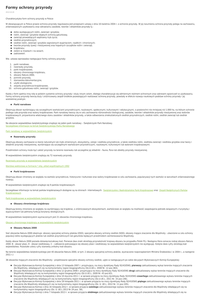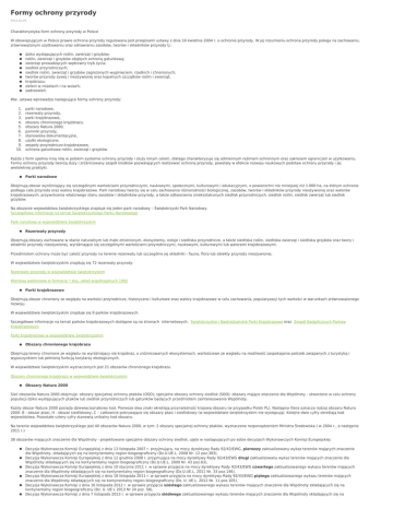 Formy ochrony przyrody 2013-10-29 Charakterystyka form ochrony przyrody w Polsce W obowiązującym w Polsce prawie ochrona przyrody regulowana jest przepisami ustawy z dnia 16 kwietnia 2004 r. o ochronie przyrody. W jej rozumieniu ochrona przyrody polega na zachowaniu, zrównoważonym użytkowaniu oraz odnawianiu zasobów, tworów i składników przyrody tj.: dziko występujących roślin, zwierząt i grzybów; roślin, zwierząt i grzybów objętych ochroną gatunkową; zwierząt prowadzących wędrowny tryb życia; siedlisk przyrodniczych; siedlisk roślin, zwierząt i grzybów zagrożonych wyginięciem, rzadkich i chronionych; tworów przyrody żywej i nieożywionej oraz kopalnych szczątków roślin i zwierząt; krajobrazu; zieleni w miastach i na wsiach; zadrzewień. Ww. ustawa wprowadza następujące formy ochrony przyrody: 1. 2. 3. 4. 5. 6. 7. 8. 9. 10. parki narodowe, rezerwaty przyrody, parki krajobrazowe, obszary chronionego krajobrazu, obszary Natura 2000, pomniki przyrody, stanowiska dokumentacyjne, użytki ekologiczne, zespoły przyrodniczo-krajobrazowe, ochrona gatunkowa roślin, zwierząt i grzybów. Każda z form spełnia inną rolę w polskim systemie ochrony przyrody i służy innym celom, dlatego charakteryzuje się odmiennym reżimem ochronnym oraz zakresem ograniczeń w użytkowaniu. Formy ochrony przyrody tworzą duży i zróżnicowany zespół środków pozwalających realizować ochronę przyrody, powstały w efekcie rozwoju naukowych podstaw ochrony przyrody i jej wieloletniej praktyki. Parki narodowe Obejmują obszar wyróżniający się szczególnymi wartościami przyrodniczymi, naukowymi, społecznymi, kulturowymi i edukacyjnymi, o powierzchni nie mniejszej niż 1.000 ha, na którym ochronie podlega cała przyroda oraz walory krajobrazowe. Park narodowy tworzy się w celu zachowania różnorodności biologicznej, zasobów, tworów i składników przyrody nieożywionej oraz walorów krajobrazowych, przywrócenia właściwego stanu zasobów i składników przyrody, a także odtworzenia zniekształconych siedlisk przyrodniczych, siedlisk roślin, siedlisk zwierząt lub siedlisk grzybów. Na obszarze województwa świętokrzyskiego znajduje się jeden park narodowy – Świętokrzyski Park Narodowy. Szczegółowe informacje na temat Świętokrzyskiego Parku Narodowego Park narodowy w województwie świętokrzyskim Rezerwaty przyrody Obejmują obszary zachowane w stanie naturalnym lub mało zmienionym, ekosystemy, ostoje i siedliska przyrodnicze, a także siedliska roślin, siedliska zwierząt i siedliska grzybów oraz twory i składniki przyrody nieożywionej, wyróżniające się szczególnymi wartościami przyrodniczymi, naukowymi, kulturowymi lub walorami krajobrazowymi. Przedmiotem ochrony może być całość przyrody na terenie rezerwatu lub szczególne jej składniki - fauna, flora lub obiekty przyrody nieożywionej. W województwie świętokrzyskim znajdują się 72 rezerwaty przyrody. Rezerwaty przyrody w województwie świętokrzyskim Warstwa wektorowa w formacie *.shp, układ współrzędnych 1992 Parki krajobrazowe Obejmują obszar chroniony ze względu na wartości przyrodnicze, historyczne i kulturowe oraz walory krajobrazowe w celu zachowania, popularyzacji tych wartości w warunkach zrównoważonego rozwoju. W województwie świętokrzyskim znajduje się 9 parków krajobrazowych. Szczegółowe informacje na temat parków krajobrazowych dostępne są na stronach internetowych: Świętokrzyskie i Nadnidziańskie Parki Krajobrazowe oraz Zespół Nadpilicznych Parków Krajobrazowych Parki krajobrazowe w województwie świętokrzyskim Obszary chronionego krajobrazu Obejmują tereny chronione ze względu na wyróżniający się krajobraz, o zróżnicowanych ekosystemach, wartościowe ze względu na możliwość zaspokajania potrzeb związanych z turystyką i wypoczynkiem lub pełnioną funkcją korytarzy ekologicznych. W województwie świętokrzyskim wyznaczonych jest 21 obszarów chronionego krajobrazu. Obszary chronionego krajobrazu w województwie świętokrzyskim Obszary Natura 2000 Sieć obszarów Natura 2000 obejmuje: obszary specjalnej ochrony ptaków (OSO); specjalne obszary ochrony siedlisk (SOO); obszary mające znaczenie dla Wspólnoty - utworzone w celu ochrony populacji dziko występujących ptaków lub siedlisk przyrodniczych lub gatunków będących przedmiotem zainteresowania Wspólnoty. Każdy obszar Natura 2000 posiada dziewięcioznakowy kod. Pierwsze dwa znaki określają przynależność krajową obszaru (w przypadku Polski PL). Następna litera oznacza rodzaj obszaru Natura 2000: B - obszar ptasi, H - obszar siedliskowy, C – całkowicie pokrywające się obszary ptasi i siedliskowy (w województwie świętokrzyskim nie występują). Kolejne dwie cyfry określają kod województwa. Pozostałe cztery cyfry stanowią unikalny kod obszaru. Na terenie województwa świętokrzyskiego jest 40 obszarów Natura 2000, w tym: 2 obszary specjalnej ochrony ptaków, wyznaczone rozporządzeniem Ministra Środowiska ( w 2004 r., a następnie 2011 r.) 38 obszarów mających znaczenie dla Wspólnoty - projektowane specjalne obszary ochrony siedlisk, ujęte w następujących po sobie decyzjach Wykonawczych Komisji Europejskiej: Decyzja Wykonawcza Komisji Europejskiej z dnia 13 listopada 2007 r. przyjmująca, na mocy dyrektywy Rady 92/43/EWG, pierwszy zaktualizowany wykaz terenów mających znaczenie dla Wspólnoty, składających się na kontynentalny region biogeograficzny (Dz.U.UE.L. 2008 Nr. 12 poz.383), Decyzja Wykonawcza Komisji Europejskiej z dnia 12 grudnia 2008 r. przyjmująca na mocy dyrektywy Rady 92/43/EWG drugi zaktualizowany wykaz terenów mających znaczenie dla Wspólnoty składających się na kontynentalny region biogeograficzny (Dz.U.UE.L. 2009 Nr. 43 poz.63), Decyzja Wykonawcza Komisji Europejskiej z dnia 10 stycznia 2011 r. w sprawie przyjęcia na mocy dyrektywy Rady 92/43/EWG czwartego zaktualizowanego wykazu terenów mających 