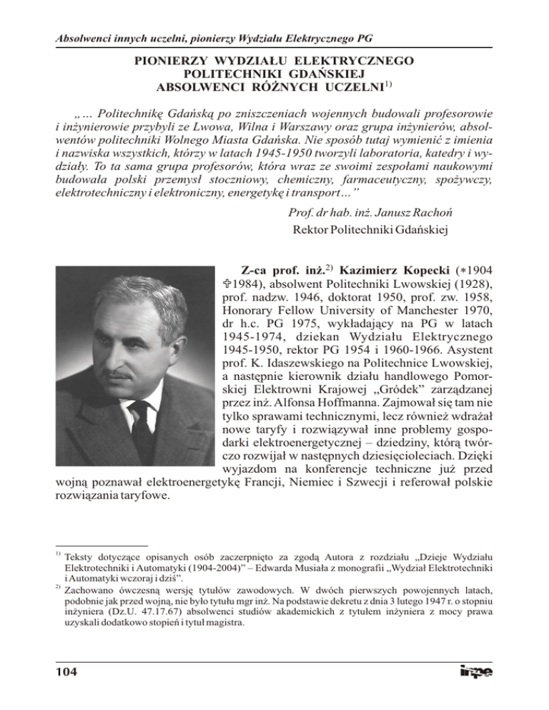 Absolwenci innych uczelni, pionierzy Wydziału Elektrycznego PG PIONIERZY WYDZIAŁU ELEKTRYCZNEGO POLITECHNIKI GDAŃSKIEJ ABSOLWENCI RÓŻNYCH UCZELNI1) „… Politechnikę Gdańską po zniszczeniach wojennych budowali profesorowie i inżynierowie przybyli ze Lwowa, Wilna i Warszawy oraz grupa inżynierów, absolwentów politechniki Wolnego Miasta Gdańska. Nie sposób tutaj wymienić z imienia i nazwiska wszystkich, którzy w latach 1945-1950 tworzyli laboratoria, katedry i wydziały. To ta sama grupa profesorów, która wraz ze swoimi zespołami naukowymi budowała polski przemysł stoczniowy, chemiczny, farmaceutyczny, spożywczy, elektrotechniczny i elektroniczny, energetykę i transport…” Prof. dr hab. inż. Janusz Rachoń Rektor Politechniki Gdańskiej Z-ca prof. inż.2) Kazimierz Kopecki (* 1904 U 1984), absolwent Politechniki Lwowskiej (1928), prof. nadzw. 1946, doktorat 1950, prof. zw. 1958, Honorary Fellow University of Manchester 1970, dr h.c. PG 1975, wykładający na PG w latach 1945-1974, dziekan Wydziału Elektrycznego 1945-1950, rektor PG 1954 i 1960-1966. Asystent prof. K. Idaszewskiego na Politechnice Lwowskiej, a następnie kierownik działu handlowego Pomorskiej Elektrowni Krajowej „Gródek” zarządzanej przez inż. Alfonsa Hoffmanna. Zajmował się tam nie tylko sprawami technicznymi, lecz również wdrażał nowe taryfy i rozwiązywał inne problemy gospodarki elektroenergetycznej – dziedziny, którą twórczo rozwijał w następnych dziesięcioleciach. Dzięki wyjazdom na konferencje techniczne już przed wojną poznawał elektroenergetykę Francji, Niemiec i Szwecji i referował polskie rozwiązania taryfowe. 1) 2) Teksty dotyczące opisanych osób zaczerpnięto za zgodą Autora z rozdziału „Dzieje Wydziału Elektrotechniki i Automatyki (1904-2004)” – Edwarda Musiała z monografii „Wydział Elektrotechniki i Automatyki wczoraj i dziś”. Zachowano ówczesną wersję tytułów zawodowych. W dwóch pierwszych powojennych latach, podobnie jak przed wojną, nie było tytułu mgr inż. Na podstawie dekretu z dnia 3 lutego 1947 r. o stopniu inżyniera (Dz.U. 47.17.67) absolwenci studiów akademickich z tytułem inżyniera z mocy prawa uzyskali dodatkowo stopień i tytuł magistra. 104 Absolwenci innych uczelni, pionierzy Wydziału Elektrycznego PG Z-ca prof. dr hab. inż. Ignacy Malecki (* 1912 U 2004), absolwent Politechniki Warszawskiej (1935), doktorat 1941, habilitacja 1943, prof. nadzw. 1946, prof. zw. 1952, członek korespondent PAN 1954, członek rzeczywisty PAN 1958, dr h.c. PG 2002, wykładający na PG w latach 1945-1951. Przed wojną kierownik laboratorium elektroakustycznego Polskiego Radia, w czasie okupacji wykładowca na konspiracyjnym Wydziale Architektury Politechniki Warszawskiej. Specjalista w dziedzinie akustyki wnętrz, hydroakustyki i techniki ultradźwiękowej, inicjator i autor fundamentalnych prac badawczych oraz monografii: Akustyka budowlana (1947), Akustyka radiowa i filmowa (1950), Technika utrwalania i odtwarzania dźwięku (1953), Naukowe podstawy zastosowania metod ultradźwiękowych w górnictwie i geologii, Rozchodzenie się fal ultradźwiękowych w ośrodkach uziarnionych, Teoria fal i układów akustycznych (1964), Physical foundations of technical acoustics (Oxford, 1969), Podstawy teoretyczne akustyki kwantowej (1972). Prof. zw. dr inż. Leon Staniewicz (* 1871 U 1951), wykładający na PG w latach 1945-1951, absolwent Wydziału Fizyko-Matematycznego Uniwersytetu Petersburskiego (1903), absolwent Instytutu Elektrotechnicznego w Sankt-Petersburgu (1903) na rok przed powstaniem politechniki w Gdańsku, pierwszy Polak, który uzyskał doktorat z elektrotechniki (1915, dysertacja na temat nagrzewania się przewodów), tytuł profesora w 1918. Pracować zaczął przed ukończeniem studiów jako nauczyciel gimnazjum (1896-1901), potem asystent, a następnie profesor Instytutu Elektrotechnicznego w Sankt-Petersburgu (1901-1919), tamże prorektor (1918-1919), równocześnie asystent, a następnie profesor politechniki w Sankt-Petersburgu (1903-1919). W 1919 przybył do odrodzonej Polski, w lutym 1920 został mianowany przez Naczelnika Państwa profesorem zwyczajnym, otrzymał Katedrę Elektrotechniki Teoretycznej na Wydziale Budowy Maszyn i Elektrotechniki Politechniki Warszawskiej i został wybrany na dziekana tego wydziału na rok 1920/1921. Po wydzieleniu z początkiem roku 1921/1922 Wydziału Elektrycznego został wybrany na pierwszego jego dziekana (ponownie 1929-1933) oraz rektora uczelni (1921-1923). Prezes Warszawskiego Towarzystwa Politechnicznego (od 1921), członek Akademii Nauk Technicznych (od 1923), prezes Polskiego Nr 68-69 105 Absolwenci innych uczelni, pionierzy Wydziału Elektrycznego PG Komitetu Elektrotechnicznego (1924-1932), członek zwyczajny Towarzystwa Naukowego Warszawskiego (od 1930). W 1932 naraził się ministrowi wyznań religijnych i oświecenia publicznego Januszowi Jędrzejewiczowi forsującemu sanacyjny nadzór w oświacie kosztem poziomu i drożności systemu kształcenia, polityczną indoktrynację młodzieży (Legion Młodych) i ograniczenie autonomii szkół wyższych3). Do roku 1933 profesora, który nie popełnił przestępstwa, można było usunąć tylko likwidując jego katedrę. Ministrowi nie drgnęła ręka, kiedy podpisywał akt likwidacji Katedry Elektrotechniki Teoretycznej. Nie trzeba komunizmu ani faszyzmu, aby szykanować uczonych, wystarczy polityczne zaślepienie dowolnej maści. W 1933 prof. L. Staniewicz został przeniesiony „w stan nieczynny”, na politechnice wykładał tylko instalacje elektryczne na Wydziale Architektury. Nadal pracował naukowo, w 1935 wydał po raz pierwszy monografię Teoria prądów zmiennych. Prof. nadzw. inż. Łukasz Dorosz (* 1897 U 1954), absolwent Politechniki Lwowskiej (1926), wykładający na PG w latach 1945-1954, dziekan Wydziału Elektrycznego 1950/1951. Był asystentem Katedry Fizyki Politechniki Lwowskiej (1924-1928), a póź