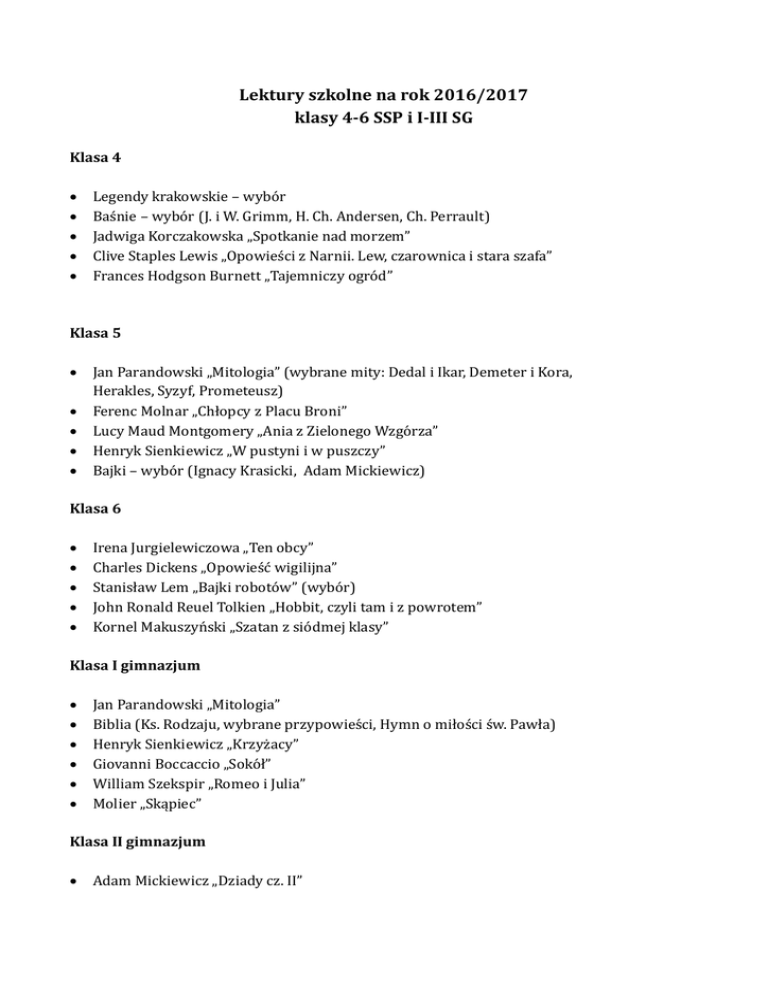 Lekturyszkolnenarok2016/2017 klasy4-6SSPiI-IIISG Klasa4 Legendy krakowskie – wybó r Baś nie – wybó r (J. i W. Grimm, H. Ch. Andersen, Ch. Perrault) Jadwiga Korczakowska „Spotkanie nad morzem” Clive Staples Lewis „Opowieś ci z Narnii. Lew, czarownica i stara szafa” Frances Hodgson Burnett „Tajemniczy ogró d” Klasa5 Jan Parandowski „Mitologia” (wybrane mity: Dedal i Ikar, Demeter i Kora, Herakles, Syzyf, Prometeusz) Ferenc Molnar „Chłopcy z Placu Broni” Lucy Maud Montgomery „Ania z Zielonego Wzgó rza” Henryk Sienkiewicz „W pustyni i w puszczy” Bajki – wybó r (Ignacy Krasicki, Adam Mickiewicz) Klasa6 Irena Jurgielewiczowa „Ten obcy” Charles Dickens „Opowieś ć wigilijna” Stanisław Lem „Bajki robotó w” (wybó r) John Ronald Reuel Tolkien „Hobbit, czyli tam i z powrotem” Kornel Makuszyń ski „Szatan z sió dmej klasy” KlasaIgimnazjum Jan Parandowski „Mitologia” Biblia (Ks. Rodzaju, wybrane przypowieś ci, Hymn o miłoś ci ś w. Pawła) Henryk Sienkiewicz „Krzyż acy” Giovanni Boccaccio „Sokó ł” William Szekspir „Romeo i Julia” Molier „Skąpiec” KlasaIIgimnazjum Adam Mickiewicz „Dziady cz. II” Juliusz Słowacki „Balladyna” Aleksander Fredro „Zemsta” Henryk Sienkiewicz „Latarnik” Bolesław Prus „Kamizelka” Agata Christie „Morderstwo w Orient Ekspresie” KlasaIIIgimnazjum Ernest Hemingway „Stary człowiek i morze” Aleksander Kamiń ski „Kamienie na szaniec” Miron Białoszewski „Pamiętnik z powstania warszawskiego” Antoine de Saint-Exupery „Mały Książ ę” Sławomir Mroż ek – wybó r opowiadań Lekturauzupełniającadlaklas4-6szkołypodstawowej Edmund Amicis „Serce” Josef Berdier „Dzieje Tristana i Izoldy” Marian Brandys „Sladami Stasia i Nel” Artur Connan-Doyle „Przygody Sherlocka Holmesa” Daniel Defoe „Przypadki Robinsona Kruzoe” Frances Hodgson Burnett „Tajemniczy ogró d” Roald Dahl „Charlie i fabryka czekolady” Antonina Domań ska „Historia ż ółtej ciż emki” Eva Ibbotson „Pies i jego chłopiec” Irena Jurgielewiczowa „Inna?” Rudyard Kipling „Księga dż ungli” Eric Knight „Lassie, wró ć !” Rafał Kosik „Felix, Net i Nika” Jó zef Ignacy Kraszewski „Stara baś ń” „Kwiatki ś więtego Franciszka z Asyż u” Astrid Lindgren „Bracia Lwie Serce” Aleksander Minkowski „Dolina Swiatła” Małgorzata Musierowicz „Język Trolli” Małgorzata Musierowicz „Kłamczucha” Zbigniew Nienacki „Pan Samochodzik i templariusze” Edmund Niziurski „Niewiarygodne przygody Marka Piegusa” Edmund Niziurski „Sposó b na Alcybiadesa” Joanna Olech „Dynastia Miziołkó w” Joanna Onichimowska „Duch starej kamienicy” Joanna Onichimowska „Daleki rejs” Hanna Oż ogowska „Tajemnica zielonej pieczęci” Jan Parandowski „Mitologia” Jan Parandowski „Przygody Odyseusza” Halina Rudnicka „Uczniowie Spartakusa” Sat-Okh „Biały mustang” Alfred Szklarski „Tomek w krainie kanguró w” Eric Emmanuel Schmitt „Oskar i pani Ró ż a” Eric Emmanuel Schmitt „Dzieci Noego” Robert Louis Stevenson „Wyspa skarbó w” Seweryna Szmaglewska „Czarne Stopy” Dorota Terakowska „Władca Lewawu” Mark Twain „Pamiętniki Adama i Ewy” Jan Twardowski „Zeszyt w kratkę” Juliusz Verne „W 80 dni dookoła ś wiata” Maciej Wojtyszko „Bromba i inni” Lekturauzupełniającadlaklasgimnazjalnych Douglas Adams „Autostopem przez Galaktykę” Jay Asher „Trzynaś cie powodó w” Paulo Coelho „Alchemik” Janusz Domagalik „Koniec wakacji” Arkady Fiedler „Dywizjon 303” John Flanagan „Zwiadowcy” Jostein Gaarder „Swiat Zofii” Halina Gó rska „Druga brama” Beecher Stowe Harriet „Chata wuja Toma” Anna Kamień ska „Deszczowe lato” Anna Kamień ska „Książ ka nad książ kami” Nancy H. Kleinbaum „Stowarzyszenie umarłych poetó w” Zofia Kossak-Szczucka „Bursztyny” Leon Kruczkowski „Niemcy” Karolina Lanckoroń ska „Wspomnienia wojenne” Jack London „Zew krwi” Margaret Mitchell „Przeminęło z wiatrem” Sławomir Mroż ek „Wesele w Atomicach” i inne opowiadania George Orwell „Folwark zwierzęcy” Małgorzata Karolina Piekarska „Klasa pani Czajki” Bolesław Prus „Faraon” Maria Rodziewiczó wna „Lato leś nych ludzi” Barbara Rosiek „Pamiętnik narkomanki” Jerome David Selinger „Buszujący w zboż u” Henryk Sienkiewicz „Pan Wołodyjowski” Henryk Sienkiewicz „Quo vadis” Krystyna Siesicka „Beethoven i dż insy” Krystyna Siesicka „Zapałka na zakręcie” William Szekspir „Hamlet” Dorota Terakowska „Tam gdzie spadają Anioły” Melchior Wań kowicz „Szkice spod Monte Cassino” Melchior Wań kowicz „Ziele na kraterze” Paweł Zuchniewicz „Wujek Karol. Kapłań skie lata Papież a”
