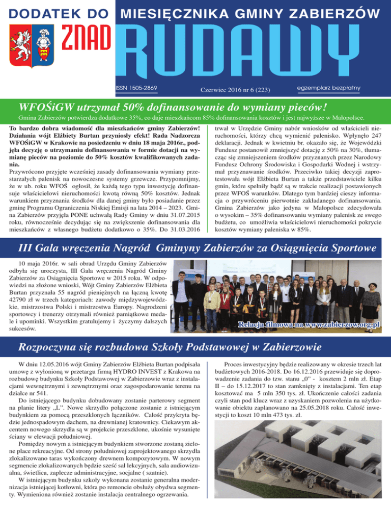 DODATEK DO MIESIĘCZNIKA GMINY ZABIERZÓW Czerwiec 2016 nr 6 (223) WFOŚiGW utrzymał 50% dofinansowanie do wymiany pieców! Gmina Zabierzów potwierdza dodatkowe 35%, co daje mieszka•com 85% do•nansowania kosztów i jest najwy•sze w Ma•opolsce. To bardzo dobra wiadomość dla mieszkańców gminy Zabierzów! Działania wójt Elżbiety Burtan przyniosły efekt! Rada Nadzorcza WFOŚiGW w Krakowie na posiedzeniu w dniu 18 maja 2016r., podjęła decyzję o utrzymaniu dofinansowania w formie dotacji na wymianę pieców na poziomie do 50% kosztów kwalifikowanych zadania. Przywrócono przyjęte wcześniej zasady dofinansowania wymiany przestarzałych palenisk na nowoczesne systemy grzewcze. Przypomnijmy, że w ub. roku WFOŚ ogłosił, że każdą tego typu inwestycję dofinansuje właścicielowi nieruchomości kwotą równą 50% kosztów. Jednak warunkiem przyznania środków dla danej gminy było posiadanie przez gminę Programu Ograniczenia Niskiej Emisji na lata 2014 – 2023. Gmina Zabierzów przyjęła PONE uchwałą Rady Gminy w dniu 31.07.2015 roku, równocześnie decydując się na zwiększenie dofinansowania dla mieszkańców z własnego budżetu dodatkowo o 35%. Do 31.03.2016 trwał w Urzędzie Gminy nabór wniosków od właścicieli nieruchomości, którzy chcą wymienić palenisko. Wpłynęło 247 deklaracji. Jednak w kwietniu br. okazało się, że Wojewódzki Fundusz postanowił zmniejszyć dotację z 50% na 30%, tłumacząc się zmniejszeniem środków przyznanych przez Narodowy Fundusz Ochrony Środowiska i Gospodarki Wodnej i wstrzymał przyznawanie środków. Przeciwko takiej decyzji zaprotestowała wójt Elżbieta Burtan a także przedstawiciele kilku gmin, które spełniły bądź są w trakcie realizacji postawionych przez WFOŚ warunków. Dlatego tym bardziej cieszy informacja o przywróceniu pierwotnie zakładanego dofinansowania. Gmina Zabierzów jako jedyna w Małopolsce zdecydowała o wysokim – 35% dofinansowaniu wymiany palenisk ze swego budżetu, co umożliwia właścicielowi nieruchomości pokrycie kosztów wymiany paleniska w 85%. III Gala wręczenia Nagród Gminyny Zabierzów za Osiągnięcia Sportowe 10 maja 2016r. w sali obrad Urzędu Gminy Zabierzów odbyła się uroczysta, III Gala wręczenia Nagród Gminy Zabierzów za Osiągnięcia Sportowe w 2015 roku. W odpowiedzi na złożone wnioski, Wójt Gminy Zabierzów Elżbieta Burtan przyznała 55 nagród pieniężnych na łączną kwotę 42790 zł w trzech kategoriach: zawody międzywojewódzkie, mistrzostwa Polski i mistrzostwa Europy. Nagrodzeni sportowcy i trenerzy otrzymali również pamiątkowe medale i upominki. Wszystkim gratulujemy i życzymy dalszych sukcesów. Relacja filmowa na www.zabierzow.org.pl Rozpoczyna się rozbudowa Szkoły Podstawowej w Zabierzowie W dniu 12.05.2016 wójt Gminy Zabierzów Elżbieta Burtan podpisała umowę z wyłonioną w przetargu firmą HYDRO INVEST z Krakowa na rozbudowę budynku Szkoły Podstawowej w Zabierzowie wraz z instalacjami wewnętrznymi i zewnętrznymi oraz zagospodarowanie terenu na działce nr 541. Do istniejącego budynku dobudowany zostanie parterowy segment na planie litery „L”. Nowe skrzydło połączone zostanie z istniejącym budynkiem za pomocą przeszklonych łączników. Całość przykryta będzie jednospadowym dachem, na drewnianej kratownicy. Ciekawym akcentem nowego skrzydła są w projekcie przeszklone, ukośnie wysunięte ściany w elewacji południowej. Pomiędzy nowym a istniejącym budynkiem stworzone zostaną zielone place rekreacyjne. Od strony południowej zaprojektowanego skrzydła zlokalizowano taras wykończony drewnem kompozytowym. W nowym segmencie zlokalizowanych będzie sześć sal lekcyjnych, sala audiowizualna, świetlica, zaplecze administracyjne, socjalne ( szatnie). W istniejącym budynku szkoły wykonana zostanie generalna modernizacja istniejącej kotłowni, która po remoncie obsłuży obydwa segmenty. Wymieniona również zostanie instalacja centralnego ogrzewania. Proces inwestycyjny będzie realizowany w okresie trzech lat budżetowych 2016-2018. Do 16.12.2016 przewiduje się doprowadzenie zadania do tzw. stanu „0” - kosztem 2 mln zł. Etap II – do 15.12.2017 to stan zamknięty z instalacjami. Ten etap kosztować ma 5 mln 350 tys. zł. Ukończenie całości zadania czyli stan pod klucz wraz z uzyskaniem pozwolenia na użytkowanie obiektu zaplanowano na 25.05.2018 roku. Całość inwestycji to koszt 10 mln 473 tys. zł. Co zrobić z bezdomnymi zwierzętami? Pytają Czytelnicy, co zrobić, gdy spotkają bezdomne ranne zwierzę, np. potrącone przez samochód. Zwierzęta bezdomne: domowe, gospodarcze, łowne, dzikie, chronione – ranne, wałęsające się lub stwarzające zagrożenie należy zgłosić to do pracownika Wydziału Ochrony Środowiska Urzędu Gminy Zabierzów w godzinach pracy Urzędu tel. 12 285 07 55, 12 285 21 16, a poza godzinami pracy Urzędu do Komisariatu Policji w Zabierzowie tel. 12 258 03 50. Urząd lub Policja powiadamiają o takim zdarzeniu lekarza weterynarii, który zapewnia całodobowo opiekę rannym zwierzętom. Po udzieleniu pomocy ranne zwierzę domowe, np. pies lub kot przewożony jest do schroniska w Racławicach. Zwierzę gospodarskie (owca, koza, koń, krowa) po udzieleniu mu pomocy weterynaryjnej transportowane jest przez firmę ABAJ do gospodarstwa rolnego w Rudawie, zwierzęta dzikie łowne lub chronione przewożone są natomiast przez firmę ABAJ do Ośrodka rehabilitacji dzikich zwierząt w Mikołowie lub do miejsca ich stałego bytowania wg wskazań zarządcy koła łowieckiego. Jeśli zauważymy błąkającego się bezdomnego psa czy kota, także powiadamiamy Urząd Gminy, a poza godzinami pracy Urzędu – policję. Zwierzęta bezdomne domowe wyłapywane są przez firmę PLAMA i przewożone do Schroniska w Racławicach w celu zapewnienia im bezterminowej opieki. Tak samo postępujemy, gdy zauważymy bezdomne zwierzę zdrowe, lecz stwarzające zagrożenie, np. agr