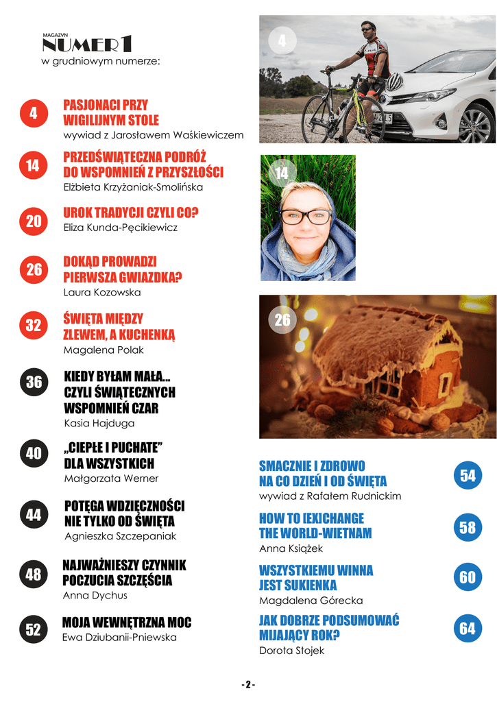 4 NUMER1 MAGAZYN w grudniowym numerze: 4 PASJONACI PRZY WIGILIJNYM STOLE wywiad z Jarosławem Waśkiewiczem 14 PRZEDŚWIĄTECZNA PODRÓŻ DO WSPOMNIEŃ Z PRZYSZŁOŚCI 14 Elżbieta Krzyżaniak-Smolińska 20 26 UROK TRADYCJI CZYLI CO? Eliza Kunda-Pęcikiewicz DOKĄD PROWADZI PIERWSZA GWIAZDKA? Laura Kozowska 32 26 ŚWIĘTA MIĘDZY ZLEWEM, A KUCHENKĄ Magalena Polak 36 KIEDY BYŁAM MAŁA... CZYLI ŚWIĄTECZNYCH WSPOMNIEŃ CZAR Kasia Hajduga 40 „CIEPŁE I PUCHATE” DLA WSZYSTKICH Małgorzata Werner 44 POTĘGA WDZIĘCZNOŚCI NIE TYLKO OD ŚWIĘTA HOW TO [EX]CHANGE THE WORLD-WIETNAM 58 WSZYSTKIEMU WINNA JEST SUKIENKA 60 JAK DOBRZE PODSUMOWAĆ MIJAJĄCY ROK? 64 Anna Książek NAJWAŻNIESZY CZYNNIK POCZUCIA SZCZĘŚCIA Anna Dychus 52 54 wywiad z Rafałem Rudnickim Agnieszka Szczepaniak 48 SMACZNIE I ZDROWO NA CO DZIEŃ I OD ŚWIĘTA Magdalena Górecka MOJA WEWNĘTRZNA MOC Ewa Dziubanii-Pniewska Dorota Stojek -2-