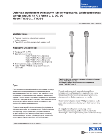 Osłona termometryczna Osłona z przyłączem gwintowym lub do wspawania, (wieloczęściowa) Wersja wg DIN 43 772 forma 2, 3, 2G, 3G Model TW35-2 ... TW35-5 Karta katalogowa WIKA TW 95.35 Zastosowanie Przemysł chemiczny, inżynieria procesowa, budowa aparatury Przy niskich i średnich obciążeniach procesowych Specjalne właściwości Wersja wg DIN 43 772 Osłona termometryczna: Model TW35-2: Forma 2 (prosta) Model TW35-3: Forma 3 (zwężana) Model TW35-4: Forma 2G (prosta) Model TW35-5: Forma 3G (zwężana) Ze zintegrowaną szyjką przedłużeniową Model TW35-3 i TW35-5: wersje z szybki czasem odpowiedzi Opis Osłona termometryczna jest ważnym elementem każdego punktu pomiarowego temperatury. Stosowana jest do oddzielania procesu od otoczenia, a tym samym ochrony środowiska i użytkowników przed wpływem agresywnych mediów. Chroni również czujnik temperatury przed wysokiem ciśnieniem oraz natężeniem przepływu. Zastosowanie osłony termometrycznej pozwala na wymiane termometru bez konieczości zatrzymywania procesu. Ze względu na szeroki zakres zastosowania dostępne są różne warianty osłon termometrycznych. Rodzaj przyłącza procesowego oraz podstawowe metody wytwarzania są ważnymi kryteriami wyboru osłony termometrycznej. Możemy dokonać wyboru, między osłoną do wspawania a osłoną z przyłączem gwintowy lub kołnierzowym. Karta katalogowa WIKA TW 95.35 · 06/2012 Rys. lewy: Osłona termometryczna z przyłączem gwintowym model TW35-4 (Forma 2G) Rys. prawy: Osłona termometryczna do wspawania model TW35-3 (Forma 3) Ponadto można wyróżnić osłony jednoczęściowe i wieloczęściowe. Wieloczęściowe są zbudowane z rury, która jest zamknięta na stałe przez spawaną końcówkę. Jednoczęściowe drążone wykonane są z pręta. Osłony termometryczne model TW35 przeznaczone są do pracy z termometrami mechanicznymi i elektrycznymi firmy WIKA. Ze względu na wytrzymałą konstrukcję, osłony termometryczne znajdują zastosowanie w przemyśle chemicznym i inżynierii procesowej oraz w budowie instalacji. Strona 1 z 3 Wersja standardowa Materiały osłon Stal CrNi 1.4571 Przyłącze procesowe Gwint zew. G ½ B, G 1 B, M20 x 1.5, ½ NPT lub bez przyłącza gwintowego do wsunęcia lub do wspawania Przyłącze termometru M24 x 1.5 nakrętka Opcjonalnie Średnica otworu Ø 6.1 mm, Ø 7 mm, Ø 9 mm ■■ Inne kołnierze, wymiary ■■ Certyfikaty jakości ■■ W aplikacjach krytycznych zaleca się dokonanie kalkulacji Długość całkowita L Model TW35-4: długość zanurzeniowa U1 + 145 mm Model TW35-5: długość zanurzeniowa U1 + 147 mm TW35-2 TW35-3 Legenda: E Przyłącze procesowe K1 Długość gwintu L Długość całkowita M Szyjka przedłużeniowa U1 Długość zanurzeniowa Strona 2 z 3 osłony wg ASME PTC 19.3-2010. Opcja ta jest oferowana przez firmę WIKA. Więcej informacji można znaleźć w informacji technicznej IN 00.15 „Obliczenia wytrzymałościowe dla osłon“. TW35-4 TW35-5 11318831.01 Długość zanurzeniowa U1 DIN 43772 wg specyfikacji klienta Wymiary w mm Maksymalna temperatura i ciśnienie procesowe Zależy od ■■ Diagramu obciążenia DIN 43772 ■■ Konstrukcji osłony - Wymiaru - Materiału ■■ Warunki procesowe - Przepływu - Gęstości medium N Przyłącze do termometru Ø d1 Otwór Ø F1 Średnica zew. osłony termometrycznej S Grubość ściany S1 Grubość końcówki Karta katalogowa WIKA TW 95.35 · 06/2012 Wymiary w mm Ød1 Ø F1 S S1 E Waga w kg L = 305 mm 7 7 9 6,1 0,23 0,35 0,23 0,23 11 12 14 12 2 2,5 2,5 2,5 3 3,5 3,5 5 G ½ B, G 1 B, M20 x 1,5 oder ½ NPT G ½ B, G 1 B, M20 x 1,5 oder ½ NPT G ½ B, G 1 B, M20 x 1,5 oder ½ NPT G ½ B, G 1 B, M20 x 1,5 oder ½ NPT Odpowiednie długości zanurzeniowe dla termometrów mechanicznych Forma budowy złącza Długość czujnika l1 S / 3 / 4 / 5 2 l1 = L - 10 mm lub l1 = U1 + M - 10 mm l1 = L - 30 mm lub l1 = U1 + M - 30 mm Specyfikacje i wymiary podane w niniejszej karcie przedstawiają stan konstrukcyjny aktualny w momencie wydruku. Istnieje możliwość wprowadzenia modyfikacji i zmian specyfikacji materiałowej bez wcześniejszego powiadomienia.. Strona 3 z 3 Karta katalogowa WIKA TW 95.10 · 06/2012 WIKA Polska spółka z ograniczoną odpowiedzialnością sp. k. Ul. Łęgska 29/35, 87-800 Włocławek Tel.: (+48) 54 23 01 100 Fax: (+48) 54 23 01 101 E-mail: [email protected] www.wikapolska.pl 06/2012 PL based on 06/2012 GB Dane do zamówienia Model / Forma osłony / Materiał osłony / Przyłącze procesowe / Złącze termometru / Długość zanurzeniowa U1 /Długość całkowita L / Średnica rury / Montaż termometru / Certyfikaty / Opcjonalnie