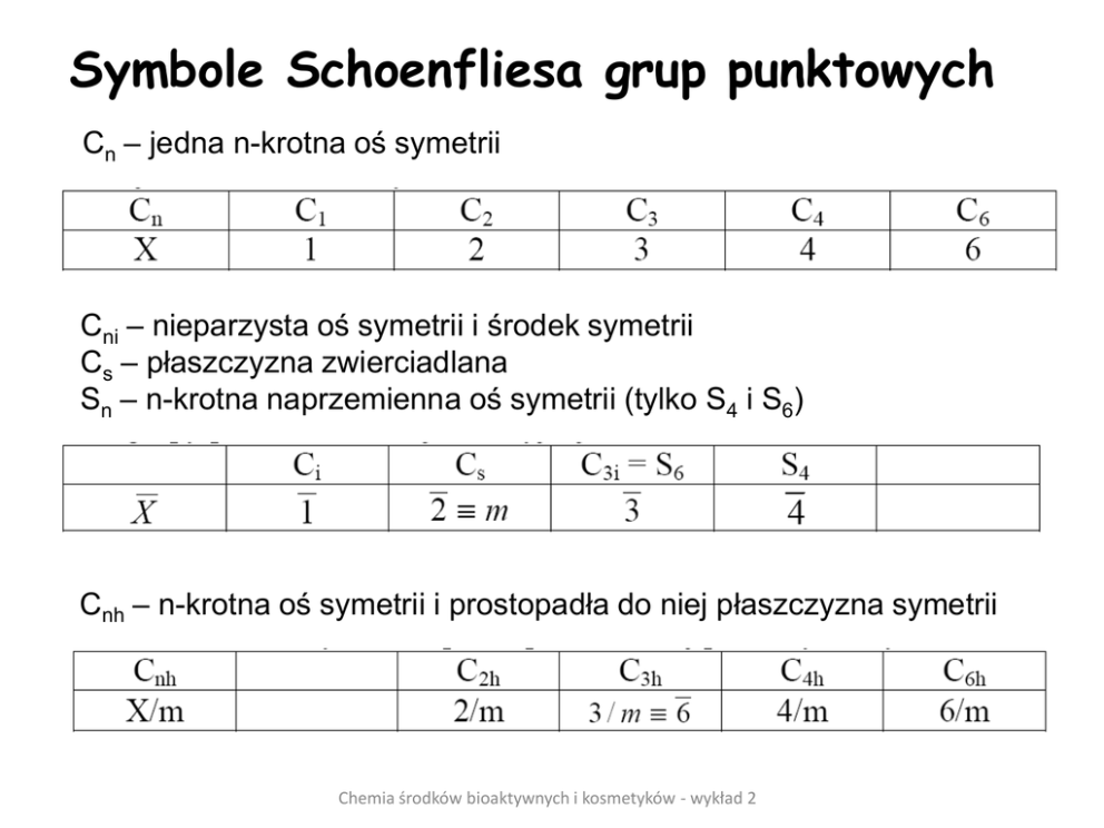 Symbole Schoenfliesa grup punktowych Cn – jedna n-krotna oś symetrii Cni – nieparzysta oś symetrii i środek symetrii Cs – płaszczyzna zwierciadlana Sn – n-krotna naprzemienna oś symetrii (tylko S4 i S6) Cnh – n-krotna oś symetrii i prostopadła do niej płaszczyzna symetrii Chemia środków bioaktywnych i kosmetyków - wykład 2 Cnv – n-krotna oś symetrii i n płaszczyzn symetrii do niej równoległych Dn – n-krotna oś symetrii i n osi dwukrotnych prostopadłych do niej Dnh – n-krotna oś symetrii i prostopadła do niej płaszczyzna symetrii oraz n płaszczyzn do niej równoległych Chemia środków bioaktywnych i kosmetyków - wykład 2 Dnd – n-krotna oś symetrii i n osi dwukrotnych prostopadłych do niej oraz płaszczyzny symetrii leżące w połowie pomiędzy osiami dwukrotnymi T – grupy tetraedru i O – grupy oktaedru Chemia środków bioaktywnych i kosmetyków - wykład 2