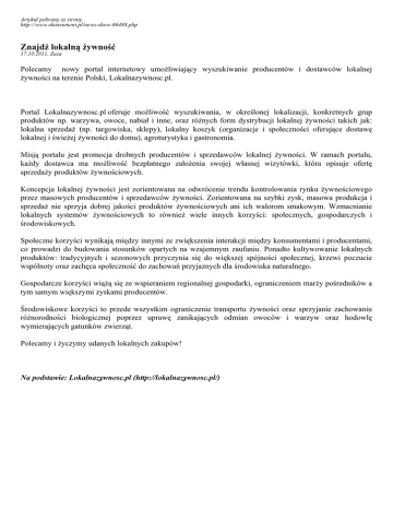 Artykuł pobrany ze strony http://www.ekonsument.pl/news-show-66488.php Znajdź lokalną żywność 17.10.2011, Zuza Polecamy nowy portal internetowy umożliwiający wyszukiwanie producentów i dostawców lokalnej żywności na terenie Polski, Lokalnazywnosc.pl. Portal Lokalnazywnosc.pl oferuje możliwość wyszukiwania, w określonej lokalizacji, konkretnych grup produktów np. warzywa, owoce, nabiał i inne, oraz różnych form dystrybucji lokalnej żywności takich jak: lokalna sprzedaż (np. targowiska, sklepy), lokalny koszyk (organizacje i społeczności oferujące dostawę lokalnej i świeżej żywności do domu), agroturystyka i gastronomia. Misją portalu jest promocja drobnych producentów i sprzedawców lokalnej żywności. W ramach portalu, każdy dostawca ma możliwość bezpłatnego założenia swojej własnej wizytówki, która opisuje ofertę sprzedaży produktów żywnościowych. Koncepcja lokalnej żywności jest zorientowana na odwrócenie trendu kontrolowania rynku żywnościowego przez masowych producentów i sprzedawców żywności. Zorientowana na szybki zysk, masowa produkcja i sprzedaż nie sprzyja dobrej jakości produktów żywnościowych ani ich walorom smakowym. Wzmacnianie lokalnych systemów żywnościowych to również wiele innych korzyści: społecznych, gospodarczych i środowiskowych. Społeczne korzyści wynikają między innymi ze zwiększenia interakcji między konsumentami i producentami, co prowadzi do budowania stosunków opartych na wzajemnym zaufaniu. Ponadto kultywowanie lokalnych produktów: tradycyjnych i sezonowych przyczynia się do większej spójności społecznej, krzewi poczucie wspólnoty oraz zachęca społeczność do zachowań przyjaznych dla środowiska naturalnego. Gospodarcze korzyści wiążą się ze wspieraniem regionalnej gospodarki, ograniczeniem marży pośredników a tym samym większymi zyskami producentów. Środowiskowe korzyści to przede wszystkim ograniczenie transportu żywności oraz sprzyjanie zachowaniu różnorodności biologicznej poprzez uprawę zanikających odmian owoców i warzyw oraz hodowlę wymierających gatunków zwierząt. Polecamy i życzymy udanych lokalnych zakupów! Na podstawie: Lokalnazywnosc.pl (http://lokalnazywnosc.pl/)