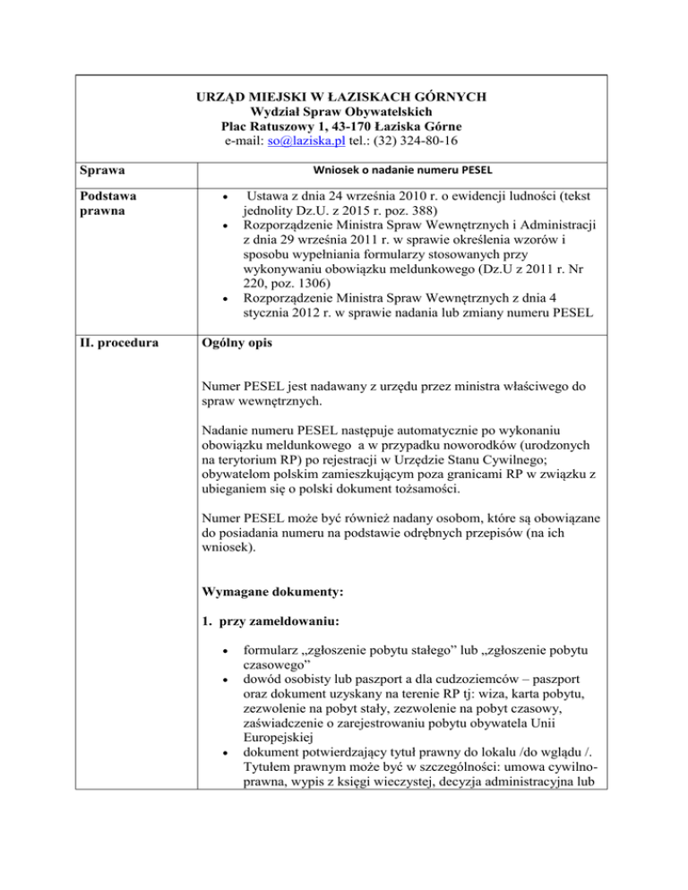 URZĄD MIEJSKI W ŁAZISKACH GÓRNYCH Wydział Spraw Obywatelskich Plac Ratuszowy 1, 43-170 Łaziska Górne e-mail: [email protected] tel.: (32) 324-80-16 Wniosek o nadanie numeru PESEL Sprawa Podstawa prawna II. procedura Ustawa z dnia 24 września 2010 r. o ewidencji ludności (tekst jednolity Dz.U. z 2015 r. poz. 388) Rozporządzenie Ministra Spraw Wewnętrznych i Administracji z dnia 29 września 2011 r. w sprawie określenia wzorów i sposobu wypełniania formularzy stosowanych przy wykonywaniu obowiązku meldunkowego (Dz.U z 2011 r. Nr 220, poz. 1306) Rozporządzenie Ministra Spraw Wewnętrznych z dnia 4 stycznia 2012 r. w sprawie nadania lub zmiany numeru PESEL Ogólny opis Numer PESEL jest nadawany z urzędu przez ministra właściwego do spraw wewnętrznych. Nadanie numeru PESEL następuje automatycznie po wykonaniu obowiązku meldunkowego a w przypadku noworodków (urodzonych na terytorium RP) po rejestracji w Urzędzie Stanu Cywilnego; obywatelom polskim zamieszkującym poza granicami RP w związku z ubieganiem się o polski dokument tożsamości. Numer PESEL może być również nadany osobom, które są obowiązane do posiadania numeru na podstawie odrębnych przepisów (na ich wniosek). Wymagane dokumenty: 1. przy zameldowaniu: formularz „zgłoszenie pobytu stałego” lub „zgłoszenie pobytu czasowego” dowód osobisty lub paszport a dla cudzoziemców – paszport oraz dokument uzyskany na terenie RP tj: wiza, karta pobytu, zezwolenie na pobyt stały, zezwolenie na pobyt czasowy, zaświadczenie o zarejestrowaniu pobytu obywatela Unii Europejskiej dokument potwierdzający tytuł prawny do lokalu /do wglądu /. Tytułem prawnym może być w szczególności: umowa cywilnoprawna, wypis z księgi wieczystej, decyzja administracyjna lub orzeczenie sądu 2. przy złożeniu wniosku na dowód osobisty: wniosek o wydanie dowodu osobistego wniosek o nadanie numeru PESEL 1 aktualna, kolorowa fotografia o wymiarach 35X45 mm, odzwierciedlająca w sposób niebudzący uzasadnionych wątpliwości, wizerunek twarzy osoby ubiegającej się o wydanie dowodu osobistego przedstawiający ją bez nakrycia głowy i okularów z ciemnymi szkłami. Fotografia powinna być wykonana nie wcześniej niż 6 miesięcy przed dniem złożenia wniosku paszport lub inny dokument stwierdzający tożsamość dokument poświadczający obywatelstwo polskie odpis skrócony aktu urodzenia (osoby, które zawarły związek małżeński dodatkowo załączają odpis skrócony aktu małżeństwa) – do wglądu 3. dla osób obowiązanych do posiadania numeru na podstawie odrębnych przepisów wniosek o nadanie numeru PESEL dowód osobisty lub paszport, a w przypadku cudzoziemców – dokument podróży lub inny dokument potwierdzający tożsamość i obywatelstwo Sposób dostarczania dokumentów Urząd Miejski w Łaziskach Górnych Wydział Spraw Obywatelskich Plac Ratuszowy 1, 43-170 Łaziska Górne e-mail: [email protected] tel.: (32) 224-80-16 Godziny przyjmowania dokumentów: Poniedziałek: 7.30 – 17.00 Wtorek - Piątek: 7.30 – 15.30 1. W przypadku braków formalnych w dostarczonych dokumentach Wnioskodawca zostanie pisemnie wezwany do ich uzupełnienia w terminie 7 dni. wniosek /do pobrania/ opłaty Termin i sposób załatwienia sprawy 1. Nie pobiera się opłat za nadanie numeru PESEL. 2. 17 zł - opłata skarbowa za złożenie pełnomocnictwa (w przypadku, gdy osoba wnioskująca o nadanie numeru PESEL działa przez pełnomocnika). tryb odwoławczy uwagi 1.Wniosek składa się w formie pisemnej. 2.Osoba podlegająca na podstawie odrębnych przepisów obowiązkowi posiadania numeru PESEL składa wniosek o nadanie numeru PESEL w organie gminy właściwym dla miejsca zameldowania na pobyt stały lub czasowy, a w przypadku braku meldunku – w organie gminy właściwym dla siedziby pracodawcy. W razie niemożności ustalenia właściwego organu gminy – wniosek składa się w organie gminy właściwym dla Dzielnicy Śródmieście m.st. Warszawy. 3.Wniosek o nadanie numeru PESEL musi zawierać wskazanie podstawy prawnej do konieczności uzyskania numeru PESEL oraz dokumentację potwierdzającą dane zawarte we wniosku. 4.Jeżeli wniosek nie spełnia wymogów, wnioskodawca jest wzywany do usunięcia braków w terminie 7 dni z pouczeniem, że ich nieusunięcie spowoduje pozostawienie wniosku bez rozpoznania. 5.Wnioskodawca może działać przez pełnomocnika, legitymującego się pełnomocnictwem udzielonym w formie, o której mowa w art. 33 § 2 ustawy z dnia 14 czerwca 1960 r. – Kodeks postępowania administracyjnego (Dz. U. z 2013 r. poz. 267) po okazaniu przez pełnomocnika do wglądu jego dowodu osobistego lub ważnego paszportu.