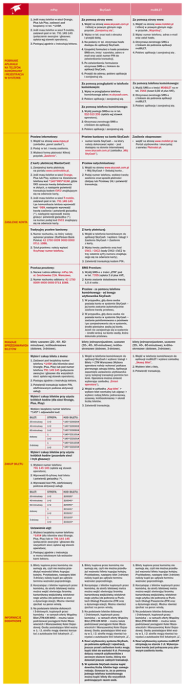 mPay SkyCash 1. Jeœli masz telefon w sieci Orange, Plus lub Play, zadzwoñ pod bezp³atny nr tel. *145#, 2. Jeœli masz telefon w sieci T-mobile, zadzwoñ pod nr tel. 791 145 145 (po³¹czenie awaryjne i g³osowe; op³ata wg stawek operatora), 3. Postêpuj zgodnie z instrukcj¹ lektora. Za pomoc¹ strony www: Za pomoc¹ strony www: 1. WejdŸ na stronê www.skycash.com.pl i kliknij w prawym górnym rogu przycisk „Zarejestruj siê”, 1. WejdŸ na stronê www.mobilet.pl i kliknij w prawym górnym rogu w przycisk „Wypróbuj”, 2. Wpisz nr tel. oraz kod z obrazka i przejdŸ dalej, 2. Wpisz numer telefonu, adres e-mail oraz ustal has³o, 3. Na podany nr tel. otrzymasz has³o dostêpu do aplikacji SkyCash, 3. Otrzymasz zwrotnego SMS-a z linkiem do pobrania aplikacji moBILET, 4. Uzupe³nij formularz o has³o przes³ane SMS-em, imiê i nazwisko, adres email oraz ustal numer PIN do zatwierdzania transakcji, POBRANIE APLIKACJI NA TELEFON KOMÓRKOWY I REJESTRACJA W SYSTEMIE moBILET 4. Pobierz aplikacjê i zarejestruj siê . 5. Po zatwierdzeniu formularza otrzymasz SMS-a z linkiem do aplikacji SkyCash, 6. PrzejdŸ do adresu, pobierz aplikacjê i zarejestruj siê. Za pomoc¹ przegl¹darki w telefonie komórkowym: 1. Wpisz w przegl¹darce telefonu komórkowego adres m.skycash.com, Za pomoc¹ telefonu komórkowego: 1. Wyœlij SMS-a o treœci MOBILET na nr tel. 7055 (koszt 0,50 z³ plus VAT), 2. Pobierz aplikacjê i zarejestruj siê. 2. Otrzymasz zwrotnego SMS-a z linkiem do pobrania aplikacji moBILET, Za pomoc¹ telefonu komórkowego: 3. Pobierz aplikacjê i zarejestruj siê. 1. Wyœlij pustego SMS-a na nr tel. 510 510 205 (op³ata wg stawek operatora), 2. Otrzymasz zwrotnego SMS-a z linkiem do aplikacji, 3. Pobierz aplikacjê i zarejestruj siê. Przelew internetowy: Przelew bankowy na konto SkyCash: Zasilenie ekspresowe: 1. WejdŸ na stronê www.mpay.pl (zak³adka „panel zasileñ”), ? numer konta SkyCash – na który ? wejdŸ na stronê www.mobilet.pl na 2. Podaj nr tel. i kwotê zasilenia, 3. Wybierz formê p³atnoœci Kliknij przycisk „Zasilenie”. ZASILENIE KONTA nale¿y dokonywaæ wp³at – jest dostêpny na stronie internetowej www.skycash.com.pl (zak³adka „Mój SkyCash”). Z karty p³atniczej MasterCard: Przelew natychmiastowy: 1. Zarejestruj kartê p³atnicz¹ na portalu www.cardmobile.pl, 1. WejdŸ na stronê www.skycash.com.pl > Mój SkyCash > Do³aduj konto , 2. Jeœli masz telefon w sieci Orange, Plus lub Play, wybierz na klawiaturze telefonu kod *145*999*XXX#, gdzie XXX oznacza kwotê do³adowania w z³otych, a nastêpnie potwierdŸ transakcjê kodem CVC2 znajduj¹cym siê na odwrocie karty, 2. Podaj numer telefonu, wybierz kwotê zasilenia oraz sposób p³atnoœci (dotpay lub Przelewy 24) i potwierdŸ transakcjê. Portal u¿ytkownika i skorzystaj z serwisu P³atnoœci.pl. 3. Jeœli masz telefon w sieci T-mobile, zadzwoñ pod nr tel. 791 145 145 i po komunikacie lektora wprowadŸ kod *999, nastêpnie wprowadŸ kwotê zasilenia i potwierdŸ gwiazdk¹ (*), nastêpnie wprowadŸ kwotê groszy i potwierdŸ gwiazdk¹ (*); na koniec podaj kod CVC2 znajduj¹cy siê na odwrocie karty. Tradycyjny przelew bankowy: Z karty p³atniczej: 1. Numer rachunku, na który nale¿y wykonaæ przelew: (Raiffeisen Bank Polska) 42 1750 0009 0000 0000 0711 1088, 1. WejdŸ w telefonie komórkowym do aplikacji SkyCash i wybierz: Us³ugi > Zasilenia SkyCash > Zasilenie z karty, 2. Tytu³ przelewu: nale¿y wpisaæ 9-cyfrowy numer telefonu. 2. Wpisz kwotê zasilenia oraz kod CVV2 / CVC2 (kody CVV2 i CVC2 to trzy ostatnie cyfry numeru znajduj¹cego siê na odwrocie karty), 3. ZatwierdŸ transakcjê kodem PIN . Przekaz pocztowy: SMS Premium: 1. Nazwa i adres odbiorcy: mPay SA, ul. Grochowska 21A, Warszawa, 1. Wyœlij SMS-a o treœci „ZTM” pod nr tel. 7355 (op³ata 3 z³ plus VAT), 2. Numer rachunku odbiorcy: 42 1750 0009 0000 0000 0711 1088. 2. Konto zostanie do³adowane kwot¹ 1,5 z³ netto . Przelew - za pomoc¹ telefonu komórkowego - od innego u¿ytkownika SkyCash: 1. W przypadku, gdy dana osoba posiada konto w systemie SkyCash – jej konto zostanie automatycznie zasilone kwot¹ przelewu, 2. W przypadku, gdy dana osoba nie posiada konta w systemie SkyCash – zostanie poinformowana o przelewie i po zarejestrowaniu siê w systemie, œrodki pieniê¿ne zasil¹ jej konto. Je¿eli nie zarejestruje siê w systemie – œrodki wróc¹ na konto osoby, która dokona³a przelewu. bilety czasowe (20-, 40-, 60RODZAJE SPRZEDAWANYCH minutowe), krótkookresowe (dobowe, 3-dniowe). BILETÓW Wybór i zakup biletu z menu: 1. Zadzwoñ pod bezp³atny numer telefonu *145# (dla klientów sieci Orangle, Plus, Play) lub pod numer telefonu 791 145 145 (po³¹czenie awaryjne i g³osowe dla wszystkich sieci; op³ata wg stawek operatora), 2. Postêpu zgodnie z instrukcj¹ lektora, 3. PotwierdŸ transakcjê kodem PIN, zdefiniowanym podczas aktywacji us³ugi. Wybór i zakup biletów przy u¿yciu krótkich kodów (dla sieci Orange, Plus, Play): bilety jednoprzejazdowe, czasowe (20-, 40-, 60-minutowe), krótkookresowe (dobowe, 3-dniowe). bilety jednoprzejazdowe, czasowe (20-, 40-, 60-minutowe), krótkookresowe (dobowe, 3-dniowe). 1. WejdŸ w telefonie komórkowym do aplikacji SkyCash i wybierz: Us³ugi > Bilety > ZTM Warszawa (Wyboru operatora nale¿y wykonaæ podczas pierwszego zakupu biletu. Aplikacja zapamiêta ustawienia u¿ytkownika i przy kolejnej transakcji pominie ten krok. Operatora mo¿na zmieniæ wybieraj¹c zak³adkê „Zmieñ operatora”), 1. WejdŸ w telefonie komórkowym do aplikacji moBILET i wybierz zak³adkê „Skasuj Bilet”, 2. Wybierz bilet z listy, 3. PotwierdŸ transakcjê. 2. WejdŸ w zak³adkê „Kup bilet” > wybierz bilet normalny lub ulgowy > wybierz rodzaj biletu: jednorazowy, czasowy, krótkookresowy > okreœl liczbê biletów, 3. ZatwierdŸ transakcjê. Wzbierz bezp³atny numer telefonu *145* i odpowiedni kod: BILET: STREFA: KOD BILETU: 20-minutowy 1+2 *145*220020# 40-minutowy 1+2 *145*2200