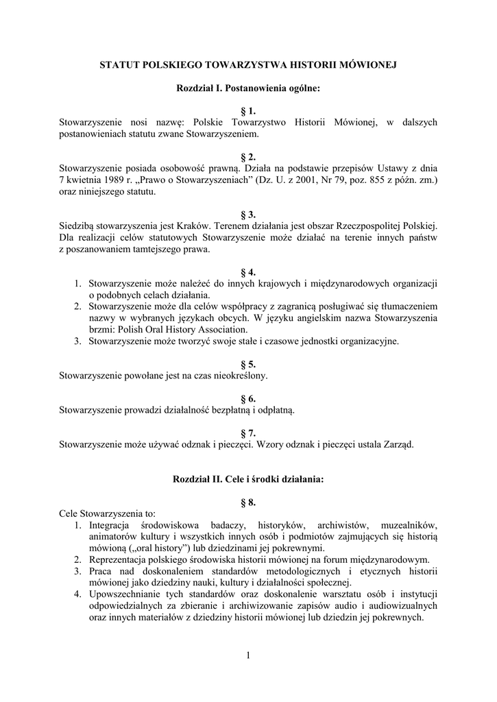 STATUT POLSKIEGO TOWARZYSTWA HISTORII MÓWIONEJ Rozdział I. Postanowienia ogólne: § 1. Stowarzyszenie nosi nazwę: Polskie Towarzystwo Historii Mówionej, w dalszych postanowieniach statutu zwane Stowarzyszeniem. § 2. Stowarzyszenie posiada osobowość prawną. Działa na podstawie przepisów Ustawy z dnia 7 kwietnia 1989 r. „Prawo o Stowarzyszeniach” (Dz. U. z 2001, Nr 79, poz. 855 z późn. zm.) oraz niniejszego statutu. § 3. Siedzibą stowarzyszenia jest Kraków. Terenem działania jest obszar Rzeczpospolitej Polskiej. Dla realizacji celów statutowych Stowarzyszenie może działać na terenie innych państw z poszanowaniem tamtejszego prawa. § 4. 1. Stowarzyszenie może należeć do innych krajowych i międzynarodowych organizacji o podobnych celach działania. 2. Stowarzyszenie może dla celów współpracy z zagranicą posługiwać się tłumaczeniem nazwy w wybranych językach obcych. W języku angielskim nazwa Stowarzyszenia brzmi: Polish Oral History Association. 3. Stowarzyszenie może tworzyć swoje stałe i czasowe jednostki organizacyjne. § 5. Stowarzyszenie powołane jest na czas nieokreślony. § 6. Stowarzyszenie prowadzi działalność bezpłatną i odpłatną. § 7. Stowarzyszenie może używać odznak i pieczęci. Wzory odznak i pieczęci ustala Zarząd. Rozdział II. Cele i środki działania: § 8. Cele Stowarzyszenia to: 1. Integracja środowiskowa badaczy, historyków, archiwistów, muzealników, animatorów kultury i wszystkich innych osób i podmiotów zajmujących się historią mówioną („oral history”) lub dziedzinami jej pokrewnymi. 2. Reprezentacja polskiego środowiska historii mówionej na forum międzynarodowym. 3. Praca nad doskonaleniem standardów metodologicznych i etycznych historii mówionej jako dziedziny nauki, kultury i działalności społecznej. 4. Upowszechnianie tych standardów oraz doskonalenie warsztatu osób i instytucji odpowiedzialnych za zbieranie i archiwizowanie zapisów audio i audiowizualnych oraz innych materiałów z dziedziny historii mówionej lub dziedzin jej pokrewnych. 1 5. Wspieranie działań na rzecz rozwiązań prawnych wspomagających rozwój historii mówionej. 6. Rozwijanie w społeczeństwie zainteresowań historią mówioną, dziejami najnowszymi, kulturą i historią lokalną. 7. Aktywizacja społeczności lokalnych wokół inicjatyw podejmowanych przez Stowarzyszenie. § 9. Stowarzyszenie swoje cele realizuje poprzez: 1. Wspieranie wymiany myśli i doświadczeń osób i instytucji zajmujących się historią mówioną poprzez organizację dorocznych spotkań członków Stowarzyszenia. 2. Prowadzenie warsztatów, szkoleń i kursów zgodnych z celami statutowymi Stowarzyszenia. 3. Inicjowanie, organizowanie i wspieranie przedsięwzięć naukowych, kulturalnych i edukacyjnych zgodnych z celami działalności Stowarzyszenia, w tym konferencji, debat, paneli dyskusyjnych, wykładów itp. 4. Działalność publikacyjną zgodną z celami statutowymi Stowarzyszenia. 5. Współpracę z podobnymi organizacjami działającymi w kraju i za granicą. 6. Współpracę z mediami, jednostkami administracji państwowej i samorządowej na rzecz realizacji celów statutowych Stowarzyszenia. Rozdział III. Członkowie Stowarzyszenia, ich prawa i obowiązki: § 10. Członkami Stowarzyszenia mogą być osoby fizyczne i prawne. Osoba prawna może być jedynie członkiem wspierającym Stowarzyszenia. § 11. 1. Członkowie Stowarzyszenia dzielą się na: a) członków zwyczajnych b) członków wspierających c) członków honorowych § 12. 1. Członkiem Zwyczajnym Stowarzyszenia może być każda osoba fizyczna, która opłaci składkę członkowską i złoży deklarację członkowską na piśmie. 2. Przyjęcie członka zwyczajnego następuje na podstawie uchwały Zarządu. 3. Członkiem wspierającym Stowarzyszenia może zostać osoba fizyczna i prawna deklarująca pomoc finansową, rzeczową lub merytoryczną w realizacji celów Stowarzyszenia. 4. Członkiem wspierającym staje się po złożeniu pisemnej deklaracji na podstawie uchwały Zarządu, podjętej nie później niż w ciągu dwóch miesięcy od daty złożenia deklaracji. 5. Członkiem honorowym Stowarzyszenia może być osoba fizyczna szczególnie zasłużona dla Stowarzyszenia lub wnosząca wybitny wkład w rozwój idei propagowanych przez Stowarzyszenie i realizację jego celów statutowych, która wyrazi na to zgodę. 6. Tytuł członka honorowego nadaje Walne Zgromadzenie Członków na wniosek Zarządu lub grupy co najmniej 5 członków Stowarzyszenia. 2 § 13. 1. Członek zwyczajny Stowarzyszenia ma prawo do: a) czynnego i biernego prawa wyborczego w wyborach do wszystkich władz Stowarzyszenia, b) wypowiadania się i wyrażania opinii we wszelkich kwestiach dotyczących działalności Stowarzyszenia, c) udziału w kształtowaniu i realizacji programu Stowarzyszenia, d) zaskarżania do Walnego Zgromadzenia Członków uchwały Zarządu Stowarzyszenia o wykluczeniu ze Stowarzyszenia. e) korzystania z dorobku, majątku i wszelkich form działalności Stowarzyszenia, f) korzystania z opieki, pomocy i rekomendacji Stowarzyszenia w zakresie działalności polegającej na realizacji celów statutowych Stowarzyszenia. 2. Członek zwyczajny Stowarzyszenia ma obowiązek: a) brania aktywnego udziału w działalności Stowarzyszenia i realizacji jego celów, b) przestrzegania statutu, regulaminów i uchwał władz Stowarzyszenia, regularnego opłacania składek. W szczególnych przypadkach na prośbę członka Zarząd może odstąpić od pobrania składki w danym roku. c) uczestniczenia w Walnym Zgromadzeniu Członków. § 14 1.Członkowie wspierający i honorowi Stowarzyszenia mają wszystkie prawa przysługujące członkom zwyczajnym za wyjątkiem czynnego i biernego prawa wyborczego. 2.Członkowie wspierający i honorowi mają prawo brać udział – z głosem doradczym – w obradach statutowych władz Stowarzyszenia. 3.Członkowie wspierający i honorowi zobowi