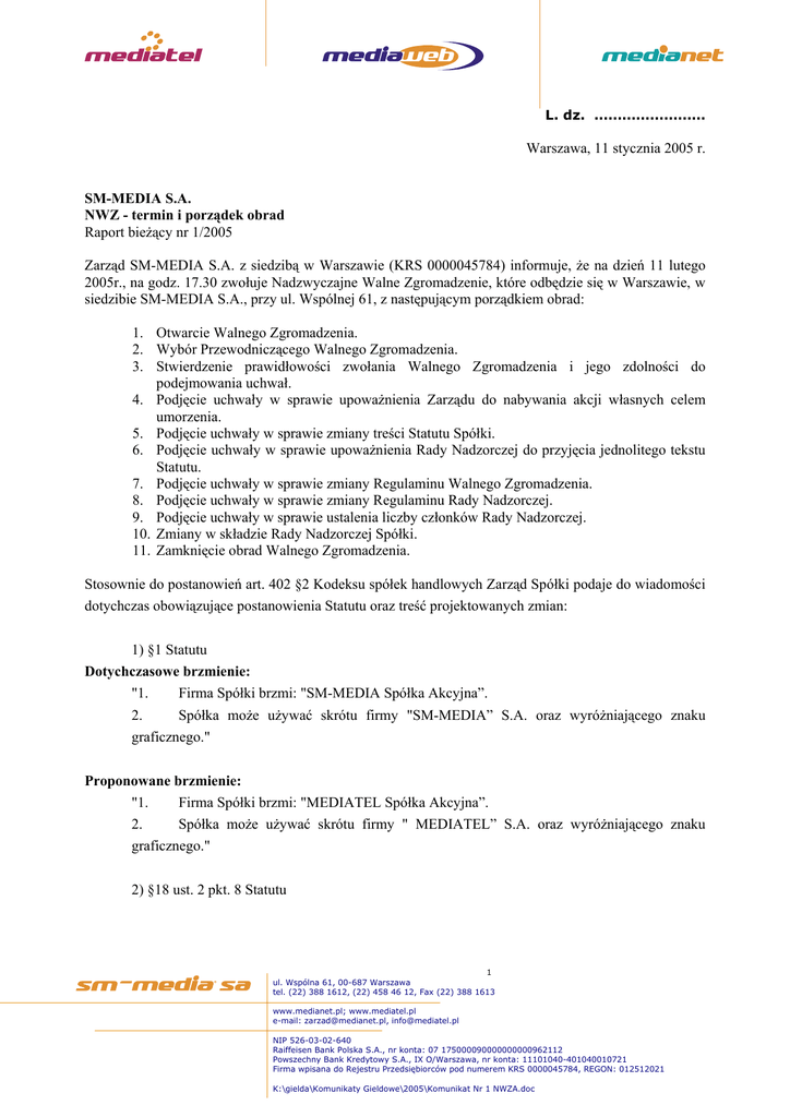 L. dz. …………………… Warszawa, 11 stycznia 2005 r. SM-MEDIA S.A. NWZ - termin i porządek obrad Raport bieżący nr 1/2005 Zarząd SM-MEDIA S.A. z siedzibą w Warszawie (KRS 0000045784) informuje, że na dzień 11 lutego 2005r., na godz. 17.30 zwołuje Nadzwyczajne Walne Zgromadzenie, które odbędzie się w Warszawie, w siedzibie SM-MEDIA S.A., przy ul. Wspólnej 61, z następującym porządkiem obrad: 1. Otwarcie Walnego Zgromadzenia. 2. Wybór Przewodniczącego Walnego Zgromadzenia. 3. Stwierdzenie prawidłowości zwołania Walnego Zgromadzenia i jego zdolności do podejmowania uchwał. 4. Podjęcie uchwały w sprawie upoważnienia Zarządu do nabywania akcji własnych celem umorzenia. 5. Podjęcie uchwały w sprawie zmiany treści Statutu Spółki. 6. Podjęcie uchwały w sprawie upoważnienia Rady Nadzorczej do przyjęcia jednolitego tekstu Statutu. 7. Podjęcie uchwały w sprawie zmiany Regulaminu Walnego Zgromadzenia. 8. Podjęcie uchwały w sprawie zmiany Regulaminu Rady Nadzorczej. 9. Podjęcie uchwały w sprawie ustalenia liczby członków Rady Nadzorczej. 10. Zmiany w składzie Rady Nadzorczej Spółki. 11. Zamknięcie obrad Walnego Zgromadzenia. Stosownie do postanowień art. 402 §2 Kodeksu spółek handlowych Zarząd Spółki podaje do wiadomości dotychczas obowiązujące postanowienia Statutu oraz treść projektowanych zmian: 1) §1 Statutu Dotychczasowe brzmienie: "1. Firma Spółki brzmi: "SM-MEDIA Spółka Akcyjna”. 2. Spółka może używać skrótu firmy "SM-MEDIA” S.A. oraz wyróżniającego znaku graficznego." Proponowane brzmienie: "1. Firma Spółki brzmi: "MEDIATEL Spółka Akcyjna”. 2. Spółka może używać skrótu firmy " MEDIATEL” S.A. oraz wyróżniającego znaku graficznego." 2) §18 ust. 2 pkt. 8 Statutu 1 ul. Wspólna 61, 00-687 Warszawa tel. (22) 388 1612, (22) 458 46 12, Fax (22) 388 1613 www.medianet.pl; www.mediatel.pl e-mail: [email protected], [email protected] NIP 526-03-02-640 Raiffeisen Bank Polska S.A., nr konta: 07 175000090000000000962112 Powszechny Bank Kredytowy S.A., IX O/Warszawa, nr konta: 11101040-401040010721 Firma wpisana do Rejestru Przedsiębiorców pod numerem KRS 0000045784, REGON: 012512021 K:\gielda\Komunikaty Gieldowe\2005\Komunikat Nr 1 NWZA.doc L. dz. …………………… Dotychczasowe brzmienie: „ustalanie wynagrodzenia dla członków Zarządu, wypłacanego przez Spółkę z dowolnego tytułu oraz reprezentowanie Spółki w umowach i sporach z członkami Zarządu, także zajmowanie się interesami konkurencyjnymi przez członka Zarządu,” Proponowane brzmienie: „ustalanie wynagrodzenia dla członków Zarządu, wypłacanego przez Spółkę z dowolnego tytułu oraz reprezentowanie Spółki w umowach i sporach z członkami Zarządu, także wyrażanie zgody na zajmowanie się interesami konkurencyjnymi przez członka Zarządu,” 3) §18 ust. 4 lit. a Statutu „ust. 2 pkt. 8” zastępuje się „ust. 2 pkt. 12” 4) § 18 ust. 5 Statutu „ust. 2 lit. b” zastępuje się „ust. 2 pkt. 8” Zarząd SM-MEDIA S.A. informuje, że zgodnie z art. 11 ustawy z dnia 21 sierpnia 1997 roku Prawo o publicznym obrocie papierami wartościowymi, prawo do uczestnictwa w Walnym Zgromadzeniu przysługuje akcjonariuszom, którzy najpóźniej na tydzień przed terminem Walnego Zgromadzenia złożą w siedzibie SM-MEDIA S.A. świadectwa potwierdzające legitymację do uczestnictwa w Walnym Zgromadzeniu. Świadectwa należy złożyć w siedzibie SM-MEDIA S.A. w Warszawie, przy ul. Wspólnej 61 do dnia 4 lutego 2005 r. w godz. 9.00-17.00. Podstawa prawna: §49 ust. 1 pkt. 1 i 2 Rozporządzenia Rady Ministrów z dnia 16.10.2001 r. w sprawie informacji bieżących i okresowych przekazywanych przez Emitentów papierów wartościowych. Wojciech Gawęda EUR ING Prezes Zarządu SM-MEDIA S.A. 2 ul. Wspólna 61, 00-687 Warszawa tel. (22) 388 1612, (22) 458 46 12, Fax (22) 388 1613 www.medianet.pl; www.mediatel.pl e-mail: [email protected], [email protected] NIP 526-03-02-640 Raiffeisen Bank Polska S.A., nr konta: 07 175000090000000000962112 Powszechny Bank Kredytowy S.A., IX O/Warszawa, nr konta: 11101040-401040010721 Firma wpisana do Rejestru Przedsiębiorców pod numerem KRS 0000045784, REGON: 012512021 K:\gielda\Komunikaty Gieldowe\2005\Komunikat Nr 1 NWZA.doc