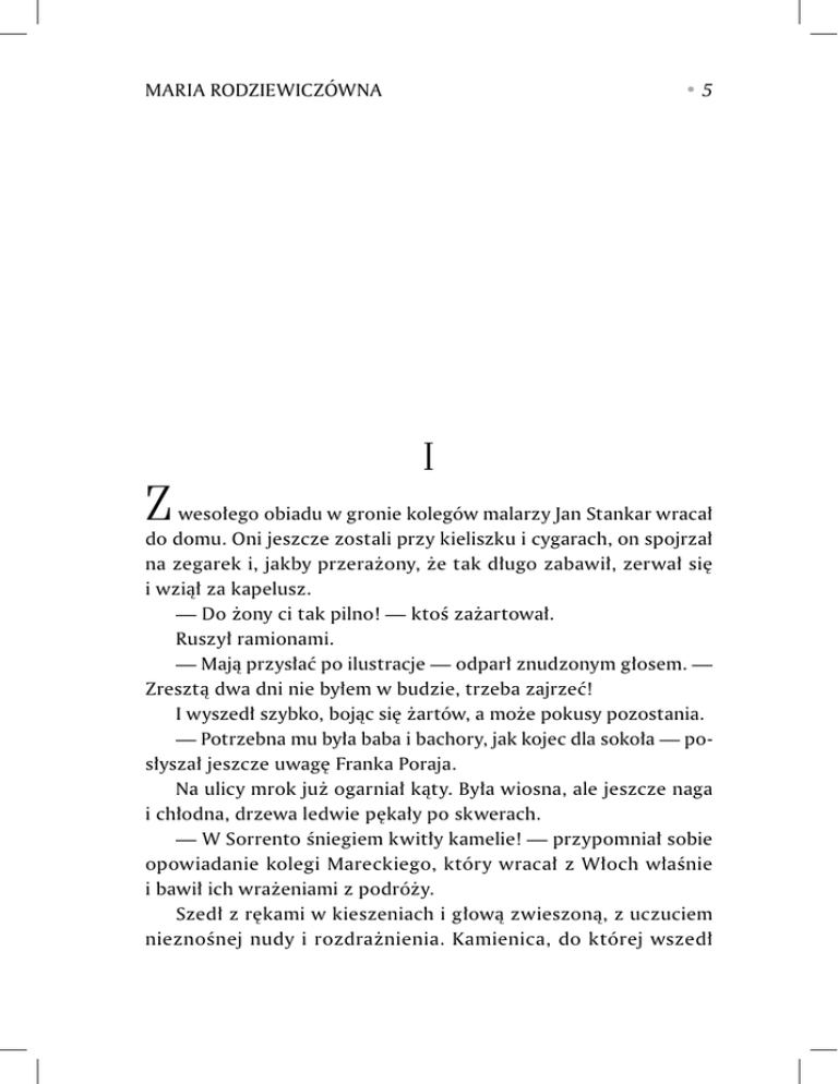 •5 maria rodziewiczówna Z I wesołego obiadu w gronie kolegów malarzy Jan Stankar wracał do domu. Oni jeszcze zostali przy kieliszku i cygarach, on spojrzał na zegarek i, jakby przerażony, że tak długo zabawił, zerwał się i wziął za kapelusz. — Do żony ci tak pilno! — ktoś zażartował. Ruszył ramionami. — Mają przysłać po ilustracje — odparł znudzonym głosem. — Zresztą dwa dni nie byłem w budzie, trzeba zajrzeć! I wyszedł szybko, bojąc się żartów, a może pokusy pozostania. — Potrzebna mu była baba i bachory, jak kojec dla sokoła — posłyszał jeszcze uwagę Franka Poraja. Na ulicy mrok już ogarniał kąty. Była wiosna, ale jeszcze naga i chłodna, drzewa ledwie pękały po skwerach. — W Sorrento śniegiem kwitły kamelie! — przypomniał sobie opowiadanie kolegi Mareckiego, który wracał z Włoch właśnie i bawił ich wrażeniami z podróży. Szedł z rękami w kieszeniach i głową zwieszoną, z uczuciem nieznośnej nudy i rozdrażnienia. Kamienica, do której wszedł 6 • nieoswojone ptaki wreszcie, stała w ciasnej uliczce, była odrapana i brudna, schody wąskie, strome, ciemne. Zewsząd wydzierały się na nie wyziewy ubogich kuchen, mydlin i pleśni, spotykał kucharki mniej niż eleganckie i czyste, wiodące z sąsiadkami rozhowory i kłótnie o klucz od strychu, i piął się wyżej i wyżej, aż na trzecie piętro. Tam zadzwonił do prawych drzwi, spoza których rozlegał się wrzask dziecka, tak przeraźliwy, że świdrował w uszach. — Ja ją uspokoję! — zamruczał, marszcząc brwi. Otworzono drzwi. W ciemnej sionce zamajaczyła postać kobieca, która, ujrzawszy go, cofnęła się bez powitania. — Czy to dziecko nigdy nie cichnie! — zawołał niecierpliwie. — Można je znienawidzić lub oszaleć. Zdjął palto i cisnął je na kufer, stanowiący całe umeblowanie sionki, i wszedł na prawo do dużego ciemnego pokoju. Tam to, w jakimś mrocznym kącie, wrzeszczało dziecko. Ucichło w tej chwili jak czarem, widocznie na ręku matki. — Gdzie lampa? — zawołał w ciemności. Wtedy kobieta przemówiła, wychodząc do drugiego pokoju: — Masz ją na twoim stole. Zapal sam. Głos był wdzięczny, młody, ale brzmiał bezmiarem znużenia i apatią. Mrucząc gniewnie, zapalił lampę. Pokój był duży, wąski, zastawiony różnymi sprzętami, gdyż służył jednocześnie za jadalnię, salon i pracownię. Wraz z sypialnią i kuchnią stanowił całe mieszkanie rodziny Stankarów, składającej się z męża, żony i dwuletniej córki. Malarz spojrzał na stół, zarzucony przyborami malarskimi, i sięgnął po list, który snadź przyniesiono w czasie jego nieobecności. Czytał, twarz mu się poczęła rozjaśniać, promienieć, zapał napełniał oczy. — Tolu, wiesz kto przyniósł ten list? — zawołał, zwracając się ku drzwiom sypialni. maria rodziewiczówna •7 — Listonosz, wczoraj! — odparła młoda kobieta, ukazując się w progu. Nie wiadomo, jakim cudem uśpiła dziecko. — Tyś dopiero stworzona na Egerię! — wybuchnął niecierpliwie. — Otóż, jak zwykle, mylisz się. List ten przyniósł mój dobry geniusz. Kobieta zbliżyła się w krąg światła. Była bardzo młoda, smukła, zgrabna i uderzającej piękności twarzy, gdyby nie wielka chudość i bladość i wyraz znudzenia i zmęczenia, który ją szpecił i postarzał. — Więc to pieniądze? — rzekła obojętnie. Zaśmiał się pogardliwie. — Pieniądze! Więc ty znajdujesz, że mój geniusz nosi zatłuszczony mieszek, a moje marzenie — liczyć brudne asygnaty. Trochę krwi wystąpiło na mizerną twarz kobiety. Chciała coś odpowiedzieć żywo, ale zmarszczyła tylko brwi i odparła prozaicznym pytaniem: — Czy podać ci obiad? — Dziękuję. Dosyć wąchać na schodach te preparaty, żeby stracić smak, a dostać wstrętu! Kobieta jak automat zwróciła się do sypialni. Wtedy on, rozdrażniony jej chłodem, zerwał się, zmiął list gwałtownie i cisnął go jej pod nogi. — Masz, depcz, jakeś mi wszystko podeptała! — krzyknął z wybuchem wściekłości. Kobieta usunęła się — stanęła — i nie straciła cierpliwości. — Dobij mnie zatem, niech raz będzie tej męce koniec! — zawołała rozpacznie. — Będziemy oboje wyzwoleni! — Ty! Więc i ty masz aspiracje jakieś, więc ja ciebie krępuję. Duch zapoznany i udręczony! Cha, cha! Więc to ty jesteś ofiarą. Dałaś mi takie bajeczne szczęście, a ja jestem nienasycony tyran, ludożerca, kat! — Nie, tylko lekkomyślnik, fantastyk i egoista. Kłamałeś mi kiedyś miłość — wierzyłam ci; przysięgałeś mi opiekę i szczęście, 8 • nieoswojone ptaki nie dotrzymałeś przysiąg. Teraz niczego od ciebie nie pragnę, nie wymagam, tylko najelementarniejszej delikatności i spokoju, i tego mi nie dajesz! Czegóż wreszcie chcesz ode mnie, com ci zawiniła, w czym ci dokuczam? Widujesz mnie tylko wtedy, gdy sam chcesz, nie słyszałeś dotąd słowa skargi lub wyrzutu. — To się skarż, wyrzucaj, mów! Albo ci bronię! Nawet ciekawy jestem, co ty możesz mieć do mnie za pretensje. — A jakichże mieć nie mogę? Coś ty mi dał? — Dałem ci moją swobodę i wolność. Coś ty z tego zrobiła, co ja mam w zamian. Tę przeklętą, brudną budę, to wściekłe, wrzeszczące dziecko i twoją wiecznie skrzywioną twarz. Ze zgrozą myślę, że do tego domu muszę iść! — Gorsza zgroza z tego domu nigdy nie wychodzić, jak ja. Buda jest przeklęta i brudna, bo w niej mieszka niedostatek, dziecko jest płaczące, bo chore ze złego odżywiania i powietrza, a ja mam twarz jak to otoczenie, życie i ściany, wśród których lata mi płyną. Słońce tu nie bywa! Ale to mieszkanie, dziecko i byt — tyś mi stworzył — i tak wygląda szczęście i raj, o którym mi opowiadałeś kiedyś — tam — w Ługach. A ja temu co winna? Wrócić tam nie mogę, iść nie mam gdzie, uwolnić ciebie od siebie, jak? Tylko śmiercią! W tej chwili d