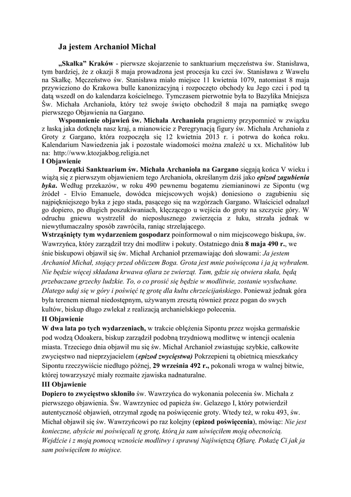 Ja jestem Archanioł Michał „Skałka” Kraków - pierwsze skojarzenie to sanktuarium męczeństwa św. Stanisława, tym bardziej, że z okazji 8 maja prowadzona jest procesja ku czci św. Stanisława z Wawelu na Skałkę. Męczeństwo św. Stanisława miało miejsce 11 kwietnia 1079, natomiast 8 maja przywieziono do Krakowa bulle kanonizacyjną i rozpoczęto obchody ku Jego czci i pod tą datą wszedł on do kalendarza kościelnego. Tymczasem pierwotnie była to Bazylika Mniejsza Św. Michała Archanioła, który też swoje święto obchodził 8 maja na pamiątkę swego pierwszego Objawienia na Gargano. Wspomnienie objawień św. Michała Archanioła pragniemy przypomnieć w związku z łaską jaka dotknęła nasz kraj, a mianowicie z Peregrynacją figury św. Michała Archanioła z Groty z Gargano, która rozpoczęła się 12 kwietnia 2013 r. i potrwa do końca roku. Kalendarium Nawiedzenia jak i pozostałe wiadomości można znaleźć u xx. Michalitów lub na: http://www.ktozjakbog.religia.net I Objawienie Początki Sanktuarium św. Michała Archanioła na Gargano sięgają końca V wieku i wiążą się z pierwszym objawieniem tego Archanioła, określanym dziś jako epizod zagubienia byka. Według przekazów, w roku 490 pewnemu bogatemu ziemianinowi ze Sipontu (wg źródeł - Elvio Emanuele, dowódca miejscowych wojsk) doniesiono o zagubieniu się najpiękniejszego byka z jego stada, pasącego się na wzgórzach Gargano. Właściciel odnalazł go dopiero, po długich poszukiwaniach, klęczącego u wejścia do groty na szczycie góry. W odruchu gniewu wystrzelił do nieposłusznego zwierzęcia z łuku, strzała jednak w niewytłumaczalny sposób zawróciła, raniąc strzelającego. Wstrząśnięty tym wydarzeniem gospodarz poinformował o nim miejscowego biskupa, św. Wawrzyńca, który zarządził trzy dni modlitw i pokuty. Ostatniego dnia 8 maja 490 r., we śnie biskupowi objawił się św. Michał Archanioł przemawiając doń słowami: Ja jestem Archanioł Michał, stojący przed obliczem Boga. Grota jest mnie poświęcona i ja ją wybrałem. Nie będzie więcej składana krwawa ofiara ze zwierząt. Tam, gdzie się otwiera skała, będą przebaczane grzechy ludzkie. To, o co prosić się będzie w modlitwie, zostanie wysłuchane. Dlatego udaj się w góry i poświęć tę grotę dla kultu chrześcijańskiego. Ponieważ jednak góra była terenem niemal niedostępnym, używanym zresztą również przez pogan do swych kultów, biskup długo zwlekał z realizacją archanielskiego polecenia. II Objawienie W dwa lata po tych wydarzeniach, w trakcie oblężenia Sipontu przez wojska germańskie pod wodzą Odoakera, biskup zarządził podobną trzydniową modlitwę w intencji ocalenia miasta. Trzeciego dnia objawił mu się św. Michał Archanioł zwiastując szybkie, całkowite zwycięstwo nad nieprzyjacielem (epizod zwycięstwa) Pokrzepieni tą obietnicą mieszkańcy Sipontu rzeczywiście niedługo późnej, 29 września 492 r., pokonali wroga w walnej bitwie, której towarzyszyć miały rozmaite zjawiska nadnaturalne. III Objawienie Dopiero to zwycięstwo skłoniło św. Wawrzyńca do wykonania polecenia św. Michała z pierwszego objawienia. Św. Wawrzyniec od papieża św. Gelazego I, który potwierdził autentyczność objawień, otrzymał zgodę na poświęcenie groty. Wtedy też, w roku 493, św. Michał objawił się św. Wawrzyńcowi po raz kolejny (epizod poświęcenia), mówiąc: Nie jest konieczne, abyście mi poświęcali tę grotę, którą ja sam uświęciłem moją obecnością. Wejdźcie i z moją pomocą wznoście modlitwy i sprawuj Najświętszą Ofiarę. Pokażę Ci jak ja sam poświęciłem to miejsce. W trakcie procesji ku nowej świątyni, nad głowami idących biskupów miały się unosić dwa orły, aby swoimi skrzydłami chronić ich od silnych promieni słonecznych. Na miejscu, zastali kamienny ołtarz przykryty szkarłatnym suknem i nad nim krzyż. Obok w skale odbita była stopa dziecka. Św. Wawrzyniec odprawił w tym miejscu ofiarę eucharystyczną. Było to 29 września 493 r. Dzień ten pozostał oficjalnym wspomnieniem św. Michała Archanioła do czasów obecnych, a Grota zyskała sobie miano Niebiańskiej Bazyliki – jedynej świątyni na świecie poświęconej nie przez człowieka. IV Objawienie Dopełnieniem archanielskich objawień na Gargano jest historia z roku 1656, gdy na terenie Włoch szalała epidemia dżumy, a miejscowy biskup Alfons Pucinelli zwrócił się do św. Michała z prośbą o pomoc. Włożył on nawet w ręce figury św. Michała sformułowaną w imieniu wszystkich mieszkańców miasta modlitwę. 22 września o świcie, podczas modlitwy w pałacu biskupim, Archanioł objawił się biskupowi i powiedział: Ja jestem Michał Archanioł. Ktokolwiek użyje kamieni z tej groty będzie uzdrowiony z zarazy. Pobłogosław kamienie i wyryj na nich znak Krzyża i inicjały mojego imienia. Ci, którzy posiedli owe kamyki i oddawali im należytą cześć, przetrwali epidemię. Na pamiątkę tego cudu biskup zarządził wzniesienie pomnika św. Michała na placu przed swoim pałacem biskupim, w miejscu objawienia. Pomnik ów stoi tam do dziś, a wyżłobiony na nim napis głosi: Księciu Aniołów, Zwycięzcy zarazy, Patronowi i Opiekunowi pomnik na wieczną wdzięczność. Alfonso Puccinelli 1656. Począwszy od pierwszego objawienia Grota Objawień na górze Gargano stała się celem podróży pielgrzymów z całego świata. Wokół Groty powstawać zaczęły z czasem zabudowania mieszkalne, które ostatecznie uformowały się w miasto nazwane Monte Sant’ Angelo – „Góra św. Anioła”. Wśród pątników, którzy tu przybyli znalazło się wielu cesarzy, królów, a przede wszystkim świętych Kościoła Katolickiego i papieży, gościł tu m.in. Ojciec Święty Jan Paweł II. Rocznie Grotę odwiedza wciąż ok. 2 mln osób, wielu z nich nawiedza również pobliskie San Giovanni Rotondo, gdzie posługiwał i zmarł o. Pio. Opiek