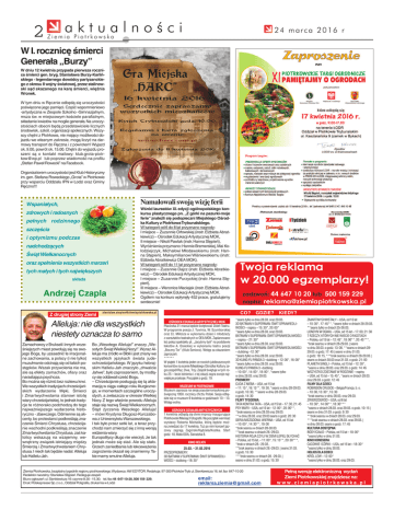 2 aktualności 24 marca 2016 r Ziemia Piotrkowska W I. rocznicę śmierci Generała „Burzy” W dniu 12 kwietnia przypada pierwsza rocznica śmierci gen. bryg. Stanisława Burzy-Karlińskiego - legendarnego dowódcy partyzanckiego z okresu II wojny światowej, przez stalinowski sąd skazanego na karę śmierci, więźnia Wronek. W tym dniu w Ręcznie odbędą się uroczystości poświęcone jego pamięci. Część wspomnieniowo -artystyczna w Zespole Szkolno -Gimnazjalnym, msza św. w miejscowym kościele parafialnym, składanie kwiatów na mogile generała. Na uroczystościach obecni będą przedstawiciele licznych środowisk, szkół, organizacji społecznych. Wszyscy chętni z Piotrkowa, nie mający możliwości dojazdu we własnym zakresie, mogą liczyć na darmowy transport do Ręczna i z powrotem! Wyjazd ok. 9.00, powrót ok. 15.00. Chętni do wyjazdu proszeni są o kontakt mailowy: [email protected] lub poprzez wiadomość na profilu „Stefan Paweł Rowecki” na Facebook. Organizatorem uroczystości jest Klub Historyczny im. gen. Stefana Roweckiego „Grota” w Piotrkowie przy wsparciu Oddziału IPN w Łodzi oraz Gminy Ręczno!!! Namalowali swoją wizję ferii Wspaniałych, zdrowych i radosnych pełnych rodzinnego szczęścia i optymizmu podczas nadchodzących Świąt Wielkanocnych oraz spełnienia wszystkich marzeń tych małych i tych największych składa Andrzej Czapla Z drugiej strony Ziemi Wśród laureatów XI. edycji ogólnopolskiego konkursu plastycznego pn. „Z górki na pazurki-moje ferie” znaleźli się podopieczni Miejskiego Ośrodka Kultury z Piotrkowa Trybunalskiego. W kategorii od 6 do 8 lat przyznano nagrody: I miejsce – Zuzannie Orłowskiej (instr. Elżbieta Abratkiewicz) – Ośrodek Edukacji Artystycznej MOK, II miejsce – Nikoli Pawlak (instr. Hanna Stępień), Wyróżnienia przyznano:Hannie Bremerskiej, Mai Kołodziejczyk, Michałowi Młodawskiemu (instr. Hanna Stępień), Maksymilianowi Wiśniewskiemu (instr. Elżbieta Abratkiewicz OEA MOK). W kategorii od 9 do 11 lat przyznano nagrody: I miejsce – Zuzannie Dajcz (instr. Elżbieta Abratkiewicz) – Ośrodek Edukacji Artystycznej MOK, I miejsce – Zuzannie Purzyckiej (instr. Hanna Stępień), III miejsce – Weronice Maciejak (instr. Elżbieta Abratkiewicz) – Ośrodek Edukacji Artystycznej MOK. Ogółem na konkurs wpłynęły 452 prace, gratulujemy serdecznie! Zamachowcy z Brukseli i innych wcześniejszych miast powołują się na swojego Boga, by uzasadnić te irracjonalne zachowania, a polscy (i nie tylko) muzułmanie odcinają się od takich postępków. Wszak przywolenia nie ma, ale są efekty zamachów, ofiary oraz narastająca psychoza. Bo można się różnić bez rozlewu krwi. We wszystkich tradycjach chrześcijańskich wydarzenie Męki, Śmierci i Zmartwychwstania stanowi istotę wiary chrześcijańskiej, to jednak tradycje te różnorako podchodzą do tego najważniejszego wydarzenia historyczno - zbawczego. Odmienne są akcenty, bo protestanci podkreślają znaczenie Śmierci Chrystusa, chrześcijanie wschodni podkreślają znaczenie Zmartwychwstania Chrystusa, zaś katolicy wskazują na wzajemny, wewnętrzny związek istniejący między Śmiercią i Zmartwychwstaniem Chrystusa. I niech tak będzie nadal. Alleluja lub Hallelu-Jah. CO? [email protected] Alleluja: nie dla wszystkich niestety oznacza to samo Bo „Wesołego Alleluja!” znaczy „Wesołych Świąt Wielkiej Nocy!”.Wyraz Alleluja ma źródło w Biblii i jest znany we wszystkich językach świata judeochrześcijańskiego. W języku hebrajskim Hallelu-Jah znaczyło „chwalcie Jahwe”, było zaproszeniem, by modlący się oddawali cześć Bogu. – Chrześcijanie posługują się tą aklamacją w ciągu całego roku liturgicznego, w momentach szczególne uroczystych, a zwłaszcza w okresie Wielkiej Nocy. Z tego właśnie powodu Alleluja staje się nazwą Świąt Wielkanocnych. Stąd życzenia Wesołego Alleluja! – mówi Krystyna Długosz-Kurczabowa z Uniwersytetu Warszawskiego. I tak było przez setki lat, a teraz przychodzi nam zmierzyć się z inną wersją widzenia wiary. Europolitycy długo nie wierzyli, że tak jednak może się stać. Ale się stało. Grzech zaniedbania lub lekceważenia zagrożenia okazał się znamienny. Takie mamy smutne Alleluja. 500 159 229 OŚRODEK EDUKACJI ARTYSTYCZNEJ MOK Placówka 31 marca będzie świętować Dzień Teatru. W programie poezja J. Tuwima, W. Szymborskiej oraz Cz. Miłosza w wykonaniu dzieci i młodzieży z warsztatów teatralnych w OEA MOK. Zaplanowano też pokaz spektaklu pt. „Jacyśmy byli” na podstawie tekstów A. Osieckiej w wykonaniu teatru poezji „Boczny Tor” (Klub Seniora). Wstęp za okazaniem zaproszeń. ****** W piątek 1 kwietnia jeden ze swoich jubileuszowych koncertów na scenie Miejskiego Ośrodka Kultury zagra zespół Raz, Dwa, Trzy. Zespół świętuje w tym roku 25 – lecie istnienia i z tej okazji zagra swoje największe przeboje. Początek o godz. 19. MUZEUM W PIOTRKOWIE Muzeum zaprasza na sesję popularnonaukową poświęconą 1050. rocznicy chrztu Polski. Sesja odbędzie się w muzeum 9 kwietnia w godzinach 10 – 13. Wstęp wolny. OŚRODEK DZIAŁAŃ ARTYSTYCZNYCH 1 kwietnia odbędą się dwie imprezy inaugurujące Piotrkowski Miesiąc Fotografii. Na początek wernisaż wystawy Roberta Michalika, którą będzie można zwiedzać do 17 kwietnia. Tuż po nim koncert jazzowy zagrają Zagórski/Kądziela/Kostka. Start godz. 18, Mała ODA, Sieradzka 8. KINO HELIOS 25.03. – 31.03.2016 PRZEDPREMIERY: 3D BATMAN V SUPERMAN: ŚWIT SPRAWIEDLIWOŚCI – dubbing –18: 30* GDZIE? KIEDY? *seans tylko w dniu 28.03. oraz 29.03. 3D BATMAN V SUPERMAN: ŚWIT SPRAWIEDLIWOŚCI – napisy – 15: 30*, 20: 00* *seans tylko w dniu 28.03. oraz 29.03. BATMAN V SUPERMAN: ŚWIT SPRAWIEDLIWOŚCI – napisy – 21: 30* *seans tylko w dniu 28.03. oraz 29.03. BATMAN V SUPERMAN: ŚWIT SPRAWIEDLIWOŚCI – dubbing –12: 30* *seans tylko w dniu 28.03. oraz 29.03. 3D KUNG-F