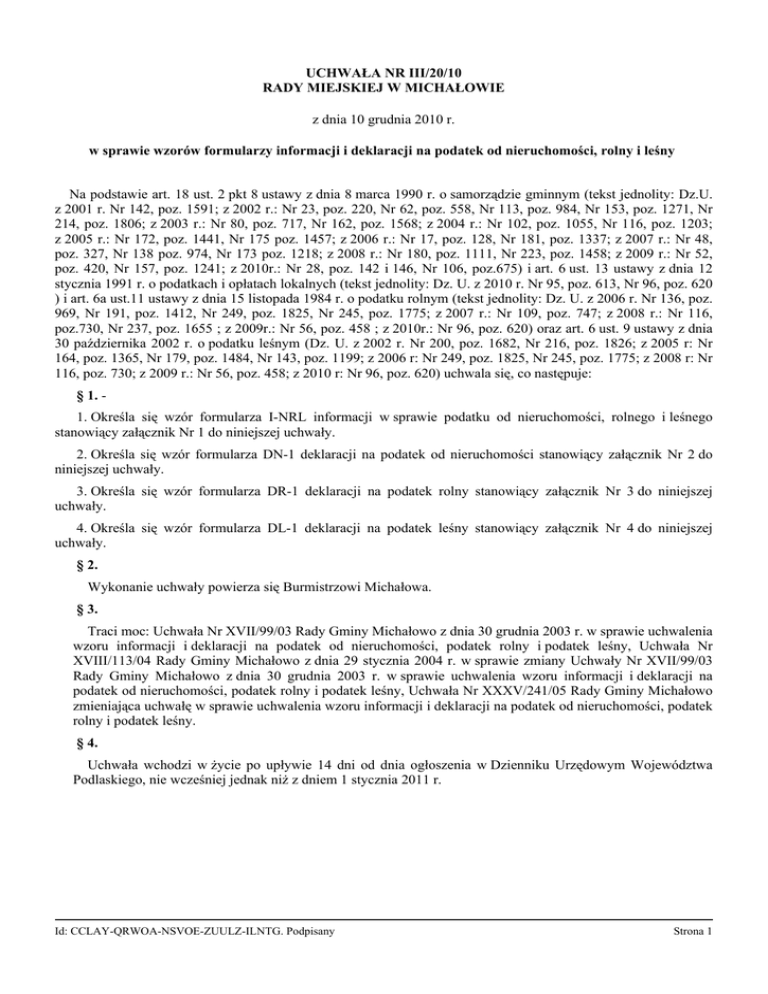 UCHWAŁA NR III/20/10 RADY MIEJSKIEJ W MICHAŁOWIE z dnia 10 grudnia 2010 r. w sprawie wzorów formularzy informacji i deklaracji na podatek od nieruchomości, rolny i leśny Na podstawie art. 18 ust. 2 pkt 8 ustawy z dnia 8 marca 1990 r. o samorządzie gminnym (tekst jednolity: Dz.U. z 2001 r. Nr 142, poz. 1591; z 2002 r.: Nr 23, poz. 220, Nr 62, poz. 558, Nr 113, poz. 984, Nr 153, poz. 1271, Nr 214, poz. 1806; z 2003 r.: Nr 80, poz. 717, Nr 162, poz. 1568; z 2004 r.: Nr 102, poz. 1055, Nr 116, poz. 1203; z 2005 r.: Nr 172, poz. 1441, Nr 175 poz. 1457; z 2006 r.: Nr 17, poz. 128, Nr 181, poz. 1337; z 2007 r.: Nr 48, poz. 327, Nr 138 poz. 974, Nr 173 poz. 1218; z 2008 r.: Nr 180, poz. 1111, Nr 223, poz. 1458; z 2009 r.: Nr 52, poz. 420, Nr 157, poz. 1241; z 2010r.: Nr 28, poz. 142 i 146, Nr 106, poz.675) i art. 6 ust. 13 ustawy z dnia 12 stycznia 1991 r. o podatkach i opłatach lokalnych (tekst jednolity: Dz. U. z 2010 r. Nr 95, poz. 613, Nr 96, poz. 620 ) i art. 6a ust.11 ustawy z dnia 15 listopada 1984 r. o podatku rolnym (tekst jednolity: Dz. U. z 2006 r. Nr 136, poz. 969, Nr 191, poz. 1412, Nr 249, poz. 1825, Nr 245, poz. 1775; z 2007 r.: Nr 109, poz. 747; z 2008 r.: Nr 116, poz.730, Nr 237, poz. 1655 ; z 2009r.: Nr 56, poz. 458 ; z 2010r.: Nr 96, poz. 620) oraz art. 6 ust. 9 ustawy z dnia 30 października 2002 r. o podatku leśnym (Dz. U. z 2002 r. Nr 200, poz. 1682, Nr 216, poz. 1826; z 2005 r: Nr 164, poz. 1365, Nr 179, poz. 1484, Nr 143, poz. 1199; z 2006 r: Nr 249, poz. 1825, Nr 245, poz. 1775; z 2008 r: Nr 116, poz. 730; z 2009 r.: Nr 56, poz. 458; z 2010 r: Nr 96, poz. 620) uchwala się, co następuje: § 1. 1. Określa się wzór formularza I-NRL informacji w sprawie podatku od nieruchomości, rolnego i leśnego stanowiący załącznik Nr 1 do niniejszej uchwały. 2. Określa się wzór formularza DN-1 deklaracji na podatek od nieruchomości stanowiący załącznik Nr 2 do niniejszej uchwały. 3. Określa się wzór formularza DR-1 deklaracji na podatek rolny stanowiący załącznik Nr 3 do niniejszej uchwały. 4. Określa się wzór formularza DL-1 deklaracji na podatek leśny stanowiący załącznik Nr 4 do niniejszej uchwały. § 2. Wykonanie uchwały powierza się Burmistrzowi Michałowa. § 3. Traci moc: Uchwała Nr XVII/99/03 Rady Gminy Michałowo z dnia 30 grudnia 2003 r. w sprawie uchwalenia wzoru informacji i deklaracji na podatek od nieruchomości, podatek rolny i podatek leśny, Uchwała Nr XVIII/113/04 Rady Gminy Michałowo z dnia 29 stycznia 2004 r. w sprawie zmiany Uchwały Nr XVII/99/03 Rady Gminy Michałowo z dnia 30 grudnia 2003 r. w sprawie uchwalenia wzoru informacji i deklaracji na podatek od nieruchomości, podatek rolny i podatek leśny, Uchwała Nr XXXV/241/05 Rady Gminy Michałowo zmieniająca uchwałę w sprawie uchwalenia wzoru informacji i deklaracji na podatek od nieruchomości, podatek rolny i podatek leśny. § 4. Uchwała wchodzi w życie po upływie 14 dni od dnia ogłoszenia w Dzienniku Urzędowym Województwa Podlaskiego, nie wcześniej jednak niż z dniem 1 stycznia 2011 r. Id: CCLAY-QRWOA-NSVOE-ZUULZ-ILNTG. Podpisany Strona 1 Przewodniczący Rady Miejskiej w Michałowie Bogusław Ostaszewski Załącznik Nr 1 do Uchwały Nr III/20/10 Rady Miejskiej w Michałowie z dnia 10 grudnia 2010 r. Zalacznik1.pdf nrl Załącznik Nr 2 do Uchwały Nr III/20/10 Rady Miejskiej w Michałowie z dnia 10 grudnia 2010 r. Zalacznik2.pdf dn-1 Załącznik Nr 3 do Uchwały Nr III/20/10 Rady Miejskiej w Michałowie z dnia 10 grudnia 2010 r. Zalacznik3.pdf dr-1 Załącznik Nr 4 do Uchwały Nr III/20/10 Rady Miejskiej w Michałowie z dnia 10 grudnia 2010 r. Zalacznik4.pdf dl-1 Id: CCLAY-QRWOA-NSVOE-ZUULZ-ILNTG. Podpisany Strona 2