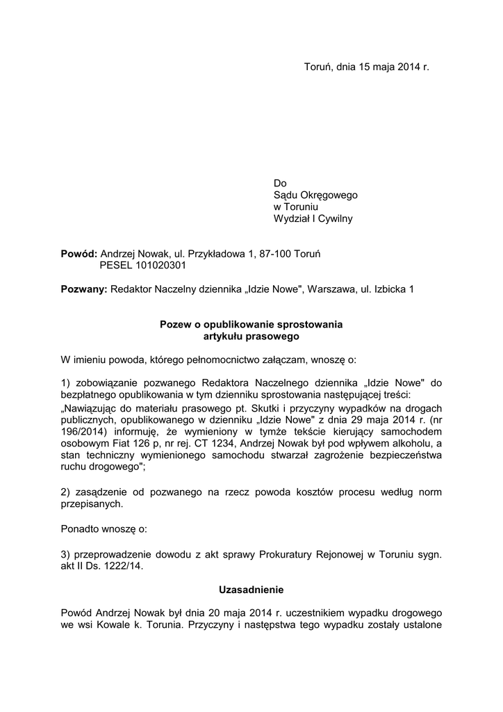 Toruń, dnia 15 maja 2014 r. Do Sądu Okręgowego w Toruniu Wydział I Cywilny Powód: Andrzej Nowak, ul. Przykładowa 1, 87-100 Toruń PESEL 101020301 Pozwany: Redaktor Naczelny dziennika „Idzie Nowe", Warszawa, ul. Izbicka 1 Pozew o opublikowanie sprostowania artykułu prasowego W imieniu powoda, którego pełnomocnictwo załączam, wnoszę o: 1) zobowiązanie pozwanego Redaktora Naczelnego dziennika „Idzie Nowe" do bezpłatnego opublikowania w tym dzienniku sprostowania następującej treści: „Nawiązując do materiału prasowego pt. Skutki i przyczyny wypadków na drogach publicznych, opublikowanego w dzienniku „Idzie Nowe" z dnia 29 maja 2014 r. (nr 196/2014) informuję, że wymieniony w tymże tekście kierujący samochodem osobowym Fiat 126 p, nr rej. CT 1234, Andrzej Nowak był pod wpływem alkoholu, a stan techniczny wymienionego samochodu stwarzał zagrożenie bezpieczeństwa ruchu drogowego"; 2) zasądzenie od pozwanego na rzecz powoda kosztów procesu według norm przepisanych. Ponadto wnoszę o: 3) przeprowadzenie dowodu z akt sprawy Prokuratury Rejonowej w Toruniu sygn. akt II Ds. 1222/14. Uzasadnienie Powód Andrzej Nowak był dnia 20 maja 2014 r. uczestnikiem wypadku drogowego we wsi Kowale k. Torunia. Przyczyny i następstwa tego wypadku zostały ustalone przez Prokuraturę Rejonową w Toruniu. Opisane zaś zostały zupełnie odmiennie i nieprawdziwie w w/w artykule prasowym. Treść tej publikacji prasowej dotyczy mojej osoby i narusza moje prawa i dobre imię - gdyż zawiera nieprawdziwe informacje, niczym nie potwierdzone. Zgłaszałem wniosek o zamieszczenie sprostowania u redaktora naczelnego tytułu prasowego, który zamieścił materiał prasowy zawierający nieprawdziwą informację, jednakże bezskutecznie. Z uwagi na powyższe wnoszę jak na wstępie. Załączniki: 1) ...dowody 2) opłata od pozwu Andrzej Nowak
