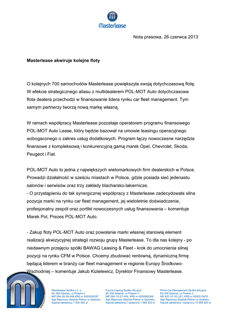 Nota prasowa, 26 czerwca 2013 Masterlease akwiruje kolejne floty O kolejnych 700 samochodów Masterlease powiększyła swoją dotychczasową flotę. W efekcie strategicznego aliasu z multidealerem POL-MOT Auto dotychczasowa flota dealera przechodzi w finansowanie lidera rynku car fleet management. Tym samym partnerzy tworzą nową markę własną. W ramach współpracy Masterlease pozostaje operatorem programu finansowego POL-MOT Auto Lease, który będzie bazował na umowie leasingu operacyjnego wzbogaconego o zakres usług dodatkowych. Program łączy nowoczesne narzędzia finansowe z kompleksową i konkurencyjną gamą marek Opel, Chevrolet, Skoda, Peugeot i Fiat. POL-MOT Auto to jedna z największych wielomarkowych firm dealerskich w Polsce. Prowadzi działalność w sześciu miastach w Polsce, gdzie posiada sieć jedenastu salonów i serwisów oraz trzy zakłady blacharsko-lakiernicze. - O przystąpieniu do tak synergicznej współpracy z Masterlease zadecydowała silna pozycja marki na rynku car fleet management, jej wieloletnie doświadczenie, profesjonalny zespół oraz portfel nowoczesnych usług finansowania – komentuje Marek Pol, Prezes POL-MOT Auto. - Zakup floty POL-MOT Auto oraz powołanie marki własnej stanowią element realizacji akwizycyjnej strategii rozwoju grupy Masterlease. To dla nas kolejny - po niedawnym przejęciu spółki BAWAG Leasing & Fleet - krok do umocnienia silnej pozycji na rynku CFM w Polsce. Chcemy zbudować rentowną, dynamiczną firmę będącą liderem w branŜy car fleet management w regionie Europy ŚrodkowoWschodniej – komentuje Jakub Kizielewicz, Dyrektor Finansowy Masterlease. Masterlease Spółka z o. o. 80-308 Gdańsk, ul. Polanki 4 NIP 584-26-99-948 KRS nr 0000362287 Sąd Rejonowy Gdańsk-Północ w Gdańsku Kapitał zakładowy 7 905 000 zł Futura Leasing Spółka Akcyjna 80-308 Gdańsk, ul. Polanki 4 NIP 584-10-27-454, KRS nr 0000069348 Sąd Rejonowy Gdańsk-Północ w Gdańsku Kapitał zakładowy i wpłacony 1 689 320 zł Prime Car Management Spółka Akcyjna 80-308 Gdańsk, ul. Polanki 4 NIP 957-07-53-221, KRS nr 0000013870 Sąd Rejonowy Gdańsk-Północ w Gdańsku Kapitał zakładowy i wpłacony 15 999 500 zł
