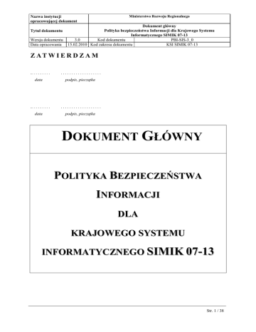 Ministerstwo Rozwoju Regionalnego Nazwa instytucji opracowującej dokument Tytuł dokumentu Wersja dokumentu Data opracowania Dokument główny Polityka bezpieczeństwa Informacji dla Krajowego Systemu Informatycznego SIMIK 07-13 3.0 Kod dokumentu PBI-SIS-3_0 15.02.2010 Kod zakresu dokumentu KSI SIMIK 07-13 Z AT W I E R D Z A M .. . . . . . . . . data .. . . . . . . . . data ................... podpis, pieczątka ................... podpis, pieczątka DOKUMENT GŁÓWNY POLITYKA BEZPIECZEŃSTWA INFORMACJI DLA KRAJOWEGO SYSTEMU INFORMATYCZNEGO SIMIK 07-13 Str. 1 / 38 Ministerstwo Rozwoju Regionalnego Nazwa instytucji opracowującej dokument Tytuł dokumentu Wersja dokumentu Data opracowania Dokument główny Polityka bezpieczeństwa Informacji dla Krajowego Systemu Informatycznego SIMIK 07-13 3.0 Kod dokumentu PBI-SIS-3_0 15.02.2010 Kod zakresu dokumentu KSI SIMIK 07-13 Historia zmian Nr wersji Data 0.8 25.06.2007 1.0 25.10.2007 Autorzy Piotr Łoziński Andrzej Oszmian Piotr Łoziński Andrzej Oszmian 25.02.2008 1.2 29.02.2008 Opis zmian Waldemar Gaik Piotr Łoziński Andrzej Oszmian Utworzenie nowego dokumentu Zatwierdzona przez Dyrektora Departamentu MF/RI Ujednolicono procedury i nazewnictwo wypracowane wspólnie przez MF i MRR Zatwierdzona przez Kierownika Projektu 29.02.2008 Zatwierdzona przez Dyrektora Departamentu MF/RI 28.04.2008 Zmiana numeracji załączników tego dokumentu. Dodano załączniki: upowaŜnienie do pełnienia funkcji ABI oraz ZBI 1.3 Andrzej Oszmian 28.04.2008 1.4 10.07.2008 10.10.2008 2.0 Zatwierdzona przez Dyrektora Departamentu MF/RI Grzegorz Brandebura Grzegorz Brandebura 21.1007.11.2008 Waldemar Gaik 10-18.11.2008 Stach Leszczyński 2.1 29.01.2009 3.0 15.02.2010 Grzegorz Brandebura Andrzej Kuzawiński Usunięto zapis z pkt. 12.1 dotyczący ustalania harmonogramu przestrzegania zasad PBI Gruntowne przekonstruowanie dokumentu, zdjęcie klauzuli: „zastrzeŜone do uŜytku słuŜbowego w MF i MRR” 1. Usunięto rolę Koordynatora SIMIK, zastąpił a go rola Administratora Merytorycznego 2. Wprowadzenie uwag 3. Weryfikacja – wprowadzenie uwag Weryfikacja uwag wprowadzonych przez MRR. Zastąpienie roli MF przez MRR po przeniesieniu Systemu, uwzględnienie roli Wykonawcy (ACPD) Str. 2 / 38 Nazwa instytucji opracowującej dokument Tytuł dokumentu Wersja dokumentu Data opracowania Ministerstwo Rozwoju Regionalnego Dokument główny Polityka bezpieczeństwa Informacji dla Krajowego Systemu Informatycznego SIMIK 07-13 3.0 Kod dokumentu PBI-SIS-3_0 15.02.2010 Kod zakresu dokumentu KSI SIMIK 07-13 I. Spis treści I. II. III. IV. V. VI. VII. VIII. VIII. IX. X. 1. 2. XI. XII. 1. 2. XIII. 1. 2. XIV. XV. XVI. XVII. XVIII. XIX. XX. 1. 2. 3. 4. 5. 6. 7. 8. 9. 10. Spis treści.................................................................................................................................................. 3 Wstęp ........................................................................................................................................................ 4 Cel polityki bezpieczeństwa ..................................................................................................................... 5 Odwołania do innych dokumentów .......................................................................................................... 6 Opis i zasięg systemu................................................................................................................................ 7 Zasoby KSI SIMIK 07-13......................................................................................................................... 8 Obszary przetwarzania informacji ............................................................................................................ 9 Analiza ryzyka ........................................................................................................................................ 10 Hierarchia ról i zadań w KSI SIMIK 07-13............................................................................................ 11 Organizacja bezpieczeństwa ................................................................................................................... 14 Bezpieczeństwo osobowe ....................................................................................................................... 16 Zasady postępowania uŜytkowników ..................................................................................................... 16 Szkolenia uŜytkowników........................................................................................................................ 16 Bezpieczeństwo fizyczne i środowiskowe głównej infrastruktury systemu ........................................... 17 Zarządzanie systemem i siecią dla głównej infrastruktury systemu ....................................................... 18 Zarządzanie serwerami ........................................................................................................................... 18 Zarządzanie siecią................................................................................................................................... 19 Kontrola dostępu..................................................................................................................................... 21 Dostęp uŜytkowników do systemu ......................................................................................................... 21 Polityka haseł.......................................................................................................................................... 21 Monitorowanie bezpieczeństwa.............................................................................................................. 23 Naruszenia bezpieczeństwa .................................................................................................................... 24 Rozwój systemu.............................