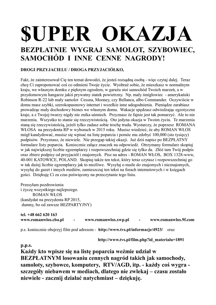 $UPER OKAZJA BEZPŁATNIE WYGRAJ SAMOLOT, SZYBOWIEC, SAMOCHÓD I INNE CENNE NAGRODY! DROGI PRZYJACIELU / DROGA PRZYJACIÓŁKO, Fakt, że zainteresował Cię ten temat dowodzi, że jesteś rozsądną osobą - więc czytaj dalej. Teraz chcę Ci zaproponować coś co odmieni Twoje życie. Wyobraź sobie, że mieszkasz w normalnym kraju, we własnym domku z pięknym ogrodem, w garażu stoi samochód Twoich marzeń, a w przydomowym hangarze jakiś prywatny statek powietrzny. Np. mały śmigłowiec - amerykański Robinson R-22 lub mały samolot Cessna, Mooney, czy Bellanca, albo Commander. Oczywiście w domu masz szybki, szerokopasmowy internet i wszelkie inne udogodnienia. Pieniądze zarabiasz prowadząc mały dochodowy biznes we własnym domu. Wakacje spędzasz odwiedzając egzotyczne kraje, a z Twojej twarzy nigdy nie znika uśmiech. Przyznasz że fajnie jest tak pomarzyć. Ale to nie marzenia. Wszystko to stanie się rzeczywistością. Oto jedyna okazja w Twoim życiu. Te marzenia staną się rzeczywistością, jeżeli tylko zadasz sobie trochę trudu. Wystarczy, że poprzesz ROMANA WŁOSA na prezydenta RP w wyborach w 2015 roku. Musisz wiedzieć, że aby ROMAN WŁOS mógł kandydować, musisz się wpisać na listę poparcia i pomóc mu zdobyć 100,000 (sto tysięcy) podpisów. Przyznasz, że niewiele. Nie przegap takiej okazji. Już dziś napisz po BEZPŁATNY formularz listy poparcia. Koniecznie załącz znaczek na odpowiedź. Otrzymany formularz skopiuj w jak największej liczbie egzemplarzy i rozpowszechniaj gdzie się tylko da. Złóż tam Twój podpis oraz zbierz podpisy od przyjaciół i znajomych. Pisz na adres - ROMAN WŁOS, BOX 1328-www, 40-001 KATOWICE, POLAND. Skopiuj także ten tekst, który teraz czytasz i rozpowszechniaj go w tak dużej liczbie egzemplarzy jak to możliwe. Wysyłaj e-maile do znajomych i nieznajomych, wysyłaj do gazet i innych mediów, zamieszczaj ten tekst na forach internetowych i w księgach gości. Dziękuję Ci za czas poświęcony na przeczytanie tego listu. Przesyłam pozdrowienia i życzę wszystkiego najlepszego. ROMAN WŁOS (kandydat na prezydenta RP 2015, dumny, bo od zawsze BEZPARTYJNY) tel. +48 662 620 163 www.romanwlos.cba.pl - www.romanwlos.xwp.pl - www.romanwlos.9f.com p.s. koniecznie obejrzyj film pod adresem - http://www.tvs.pl/informacje/4923/ oraz http://www.tvs.pl/film.php?id_materialu=1891 p.p.s. Każdy kto wpisze się na listę poparcia weźmie udział w BEZPŁATNYM losowaniu cennych nagród takich jak samochody, samoloty, szybowce, komputery, RTV/AGD, itp. - każdy coś wygra szczegóły niebawem w mediach, dlatego nie zwlekaj – czasu zostało niewiele - zacznij działać natychmiast – dziękuję.