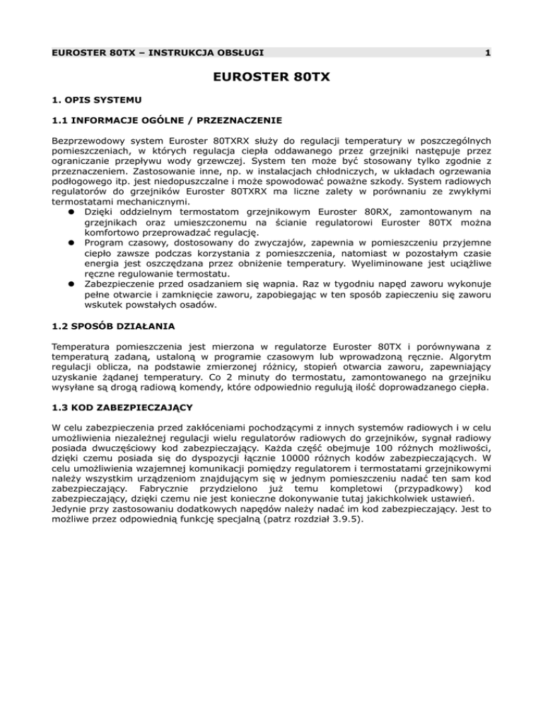 EUROSTER 80TX – INSTRUKCJA OBSŁUGI 1 EUROSTER 80TX 1. OPIS SYSTEMU 1.1 INFORMACJE OGÓLNE / PRZEZNACZENIE Bezprzewodowy system Euroster 80TXRX służy do regulacji temperatury w poszczególnych pomieszczeniach, w których regulacja ciepła oddawanego przez grzejniki następuje przez ograniczanie przepływu wody grzewczej. System ten może być stosowany tylko zgodnie z przeznaczeniem. Zastosowanie inne, np. w instalacjach chłodniczych, w układach ogrzewania podłogowego itp. jest niedopuszczalne i może spowodować poważne szkody. System radiowych regulatorów do grzejników Euroster 80TXRX ma liczne zalety w porównaniu ze zwykłymi termostatami mechanicznymi. ● Dzięki oddzielnym termostatom grzejnikowym Euroster 80RX, zamontowanym na grzejnikach oraz umieszczonemu na ścianie regulatorowi Euroster 80TX można komfortowo przeprowadzać regulację. ● Program czasowy, dostosowany do zwyczajów, zapewnia w pomieszczeniu przyjemne ciepło zawsze podczas korzystania z pomieszczenia, natomiast w pozostałym czasie energia jest oszczędzana przez obniżenie temperatury. Wyeliminowane jest uciążliwe ręczne regulowanie termostatu. ● Zabezpieczenie przed osadzaniem się wapnia. Raz w tygodniu napęd zaworu wykonuje pełne otwarcie i zamknięcie zaworu, zapobiegając w ten sposób zapieczeniu się zaworu wskutek powstałych osadów. 1.2 SPOSÓB DZIAŁANIA Temperatura pomieszczenia jest mierzona w regulatorze Euroster 80TX i porównywana z temperaturą zadaną, ustaloną w programie czasowym lub wprowadzoną ręcznie. Algorytm regulacji oblicza, na podstawie zmierzonej różnicy, stopień otwarcia zaworu, zapewniający uzyskanie żądanej temperatury. Co 2 minuty do termostatu, zamontowanego na grzejniku wysyłane są drogą radiową komendy, które odpowiednio regulują ilość doprowadzanego ciepła. 1.3 KOD ZABEZPIECZAJĄCY W celu zabezpieczenia przed zakłóceniami pochodzącymi z innych systemów radiowych i w celu umożliwienia niezależnej regulacji wielu regulatorów radiowych do grzejników, sygnał radiowy posiada dwuczęściowy kod zabezpieczający. Każda część obejmuje 100 różnych możliwości, dzięki czemu posiada się do dyspozycji łącznie 10000 różnych kodów zabezpieczających. W celu umożliwienia wzajemnej komunikacji pomiędzy regulatorem i termostatami grzejnikowymi należy wszystkim urządzeniom znajdującym się w jednym pomieszczeniu nadać ten sam kod zabezpieczający. Fabrycznie przydzielono już temu kompletowi (przypadkowy) kod zabezpieczający, dzięki czemu nie jest konieczne dokonywanie tutaj jakichkolwiek ustawień. Jedynie przy zastosowaniu dodatkowych napędów należy nadać im kod zabezpieczający. Jest to możliwe przez odpowiednią funkcję specjalną (patrz rozdział 3.9.5). EUROSTER 80TX – INSTRUKCJA OBSŁUGI 2 1.4 WSKAZÓWKI TECHNICZNE Najważniejsze dane techniczne podano poniższej: Zasięg (w otwartej przestrzeni): do 100 m Maksymalna liczba termostatów grzejnikowych, obsługiwanych przez regulator: 8 Częstotliwość radiowa: 868,35 Mhz Zasilanie: 2 baterie alkaliczne AA na każdą jednostkę Trwałość baterii: ok. 1 rok Zakres temperatur: 6°C do 30°C Liczba załączeń: 4 w ciągu dnia lub 28 w ciągu tygodnia ● ● ● ● ● ● Używać wyłączenie baterii alkalicznych. Akumulatorki i inne baterie nie nadają się ze względu na niższe napięcie lub silne rozładowanie samoczynne i mogą powodować zakłócenia w działaniu. Zasięg zastosowanego systemu radiowego na otwartej przestrzeni wynosi 100 m. Jest to całkowicie wystarczające w pomieszczeniu, ze względu na istotnie mniejsze odległości, nawet przy uwzględnieniu niekorzystnych warunków otoczenia (działanie ekranujące grzejnika itp.). Gdyby mimo to doszło do problemów w transmisji radiowej, wówczas w rozdziale 5.1 znajdują się wskazówki pozwalające na ich usunięcie. Moc nadawcza wynosi mniej niż 10 mW ( dla porównania moc telefonu komórkowego może być ponad 200-krotnie większa ). Tym samym nie należy oczekiwać negatywnego oddziaływania na wrażliwe organizmy ludzkie i zwierzęta. Przyrząd należy czyścić jedynie przy użyciu suchej szmatki płóciennej, która może być nieco zwilżona w przypadku silnego zanieczyszczenia. Nie używać żadnych środków myjących zawierających rozpuszczalnik. Uważać, aby do wnętrza przyrządu nie przeniknęła wilgoć. Podgrzewanie pomieszczenia wymaga czasu, ze względu na zwymiarowanie grzejnika. Jeżeli wartość zadana zostanie zmieniona, wówczas temperatura w pomieszczeniu zmienia się z odpowiednim opóźnieniem. Różnice pomiędzy wartością zadaną i temperaturą w pomieszczeniu mogą być spowodowane różnymi wielkościami zakłócającymi, jak np. przeciągiem, źródłami ciepła obcego w pomieszczeniu albo niedostatecznym dopływem ciepła z kotła. Temperatura mierzona jest z dużą dokładnością. W celu zapobieżenia niepotrzebnie częstym przesterowaniom zaworu, np. przy krótkotrwałych zmianach temperatury w pomieszczeniu, spowodowanych otwarciem drzwi, wartość pomiarowa jest uśredniania na podstawie większej liczby pomiarów. 1.5 ZAWARTOŚĆ ZESTAWU 1 x regulator Euroster 80TX 1 x uchwyt ścienny dla regulatora, z elementami mocującymi 1 x termostat grzejnikowy Euroster 80RX 1 x zestaw pierścieni adapterowych dla zaworów Danfossa (3 szt.) 1 x instrukcja obsługi 4 x baterie alkaliczne AA 1 x instrukcja obsługi Dodatkowe termostaty grzejnikowe mogą zostać zamówione u lokalnego dystrybutora wyrobów Euroster. EUROSTER 80TX – INSTRUKCJA OBSŁUGI 3 2. INSTALACJA SYSTEMU 2.1 INSTALOWANIE REGULATORA EUROSTER 80TX 2.1.1 MIEJSCE MONTAŻU Do zainstalowania regulatora należy wybrać odpowiednie miejsce, które ● ● ● ● ● ● ● powinno znajdować się centralnie w pomieszczeniu, w którym jest mierzona temperatura, powinno być łatwo dostępne, powinno znajdować się na wysokości oczu, nie powinno znajdować się na źle zaizolowanej ścianie zewnęt