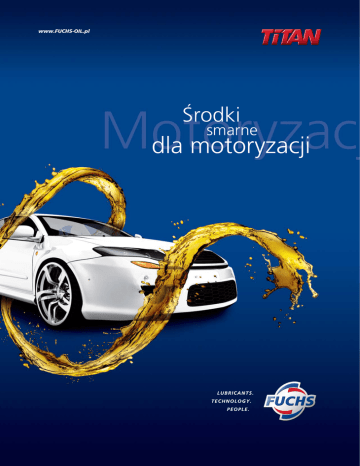 www.FUCHS-OIL.pl Ârodki smarne dla motoryzacji ÂRODKI SMARNE TECHNOLOGIA LUDZIE ■ Najwi´kszy na Êwiecie niezale˝ny producent Êrodków smarnych ■ Kompletna gama Êrodków smarnych dla motoryzacji i przemys∏u ■ Ârodki, które chronià i smarujà od poczàtku – Fuchs liderem w nape∏nianiu fabrycznym w Niemczech ■ Fabryki na ca∏ym Êwiecie, m.in. w Gliwicach 2 Liczby i fakty ZAK¸AD PRODUKCYJNY W POLSCE: GLIWICE , PRZYNALE˚NOÂC: FUCHS PETROLUB SE G¸ÓWNA SIEDZIBA: Mannheim, Niemcy PRAWDZIWY SPECJALISTA W ZAKRESIE ÂRODKÓW SMARNYCH: 100% koncentracja na Êrodkach smarnych PE¸NA GAMA PRODUKTÓW: ponad 2 000 produktów CERTYFIKOWANY PRZEZ: DIN EN ISO 9001:2008, DIN EN ISO 14001:2004 Od ponad 80 lat wszelkie dzia∏ania oraz projekty badawcze koncentrujemy na rozwoju innowacyjnych Êrodków smarnych. Nasza specjalizacja na tym polu oznacza ciàg∏y wzrost – zarówno geograficzny, jak i techniczny. Nieustannie udoskonalamy i rozwijamy zakres zastosowaƒ naszych nowoczesnych produktów. Dzisiaj Fuchs jest firmà oferujàcà najwy˝szej klasy Êrodki smarne na ca∏ym Êwiecie, w ka˝dej ga∏´zi przemys∏u. Co sprawia, ˝e nasze produkty sà tak wartoÊciowe? Opracowujemy Êrodki smarne do konkretnego zastosowania, dopasowane do wymogów i procesów produkcyjnych naszych partnerów. Wspólnie poszukujemy najlepszych rozwiàzaƒ dla klientów. Taki rodzaj wspó∏pracy jest unikalny w swojej formie i zakresie. W naszej dzia∏alnoÊci opieramy si´ na jednym kluczowym czynniku: jesteÊmy najwi´kszym na Êwiecie niezale˝nym producentem Êrodków smarnych. I w∏aÊnie ta niezale˝noÊç nas wyró˝nia – wizjonerskie podejÊcie sprawia, ˝e jesteÊmy otwarci na nowe metody i rozwiàzania, które sà podstawà innowacji. A innowacje to znak firmowy Fuchsa. 3 UTRZYMUJEMY ÂWIAT W RUCHU ■ Rozwiàzania skrojone na miar´ w dziedzinie olejów dla motoryzacji ■ Kompletna gama produktów do wszystkich zastosowaƒ w motoryzacji ■ Prze∏omowa technologia XTL® (Xtreme Temperature Lubrication) 4 Prze∏omowa technologia XTL® (Xtreme Temperature Lubrication) Nowa technologia olejów bazowych XTL®, charakteryzujàca si´ ekstremalnie wysokim wskaênikiem lepkoÊci oraz wybitnà odpornoÊcià na starzenie, zapewnia szybszà cyrkulacj´ oleju oraz znacznie zwi´kszonà ochron´ silnika w d∏ugim okresie. Podczas rozruchu, oleje silnikowe w technologii XTL® ∏atwiej i szybciej docierajà do wspó∏pracujàcych elementów silnika - nawet w ekstremalnych warunkach pracy, w ca∏ym okresie pomi´dzy wymianami. Oznacza to ∏atwiejszy rozruch silnika i mniejsze zu˝ycie jego elementów, a ponadto ograniczenie zu˝ycia paliwa. Dodatkowo, w porównaniu z konwencjonalnym olejem, zu˝ycie oleju w trakcie eksploatacji równie˝ ulega zmniejszeniu. ® TECHNOLOGY 5 Ârodki smarne dla motoryzacji Spis treÊci 6 1 Oleje silnikowe | Oleje silnikowe – samochody osobowe str. 8 Oleje silnikowe – flota mieszana str. 10 Oleje silnikowe – pojazdy u˝ytkowe str. 11 Oleje silnikowe jednosezonowe str. 14 Oleje do silników stacjonarnych zasilanych gazem str. 15 Oleje silnikowe – sprz´t p∏ywajàcy str. 16 Oleje do silników dwusuwowych str. 16 2 Oleje przek∏adniowe | Oleje przek∏adniowe – samochody osobowe str. 17 Oleje przek∏adniowe – pojazdy u˝ytkowe str. 18 Oleje przek∏adniowe – samochody osobowe i pojazdy u˝ytkowe str. 19 Oleje wielofunkcyjne – maszyny budowlane str. 20 Oleje do przek∏adni automatycznych (ATF) str. 21 Oleje do przek∏adni dwusprz´g∏owych (DCTF) str. 23 3 Oleje hudrauliczne | str. 24 4 Produkty specjalne | P∏yny hamulcowe str. 25 P∏yny do uk∏adów ch∏odzenia str. 25 Dodatki do paliw str. 26 Ochrona przed korozjà str. 26 Ârodki myjàce str. 26 5 Smary | str. 27 7 1 OLEJE SILNIKOWE Oleje silnikowe – samochody osobowe TITAN GT1 SAE 0W-20 XTL ® TECHNOLOGY TITAN GT1 PRO C-1 SAE 5W-30 Najwy˝szej jakoÊci olej silnikowy do samochodów z filtrami czàstek sta∏ych o wyd∏u˝onych i standardowych przebiegach pomi´dzy wymianami. ACEA C1 TITAN GT1 PRO C-2 SAE 5W-30 Najwy˝szej jakoÊci olej silnikowy do samochodów koncernu PSA z filtrami czàstek sta∏ych o wyd∏u˝onych i standardowych przebiegach pomi´dzy wymianami. ACEA C2 API SN/SM/CF TITAN GT1 PRO C-3 SAE 5W-30 Najwy˝szej jakoÊci olej silnikowy opracowany w nowej technologii XTL dla maksymalnego u∏atwienia rozruchu zimnego silnika i poprawy jego osiàgów. Przeznaczony do nowoczesnych silników z wyd∏u˝onymi oraz standardowymi okresami serwisowymi. Opracowany specjalnie do pojazdów VW i Mercedes Benz wyposa˝onych w filtry czàstek sta∏ych. ® TECHNOLOGY XTL ® TECHNOLOGY BMW LONGLIFE-14 FE+ PSA B71 2290 RENAULT RN0700 ACEA A5/B5 FIAT 9.55535-S1 HONDA SUBARU SUZUKI TOYOTA BMW LONGLIFE-04 MB-APPROVAL 229.51 PORSCHE C30 VW 504 00/507 00 ACEA C3 ACEA A3/B4 FORD M2C917-A Najwy˝szej jakoÊci olej silnikowy do pojazdów ze standardowymi i wyd∏u˝onymi okresami wymian. Opracowany do samochodów Renault z turbospr´˝arkà i systemami oczyszczania spalin. ACEA C4 MB-APPROVAL 226.51 RENAULT RN0720 TITAN GT1 PRO FLEX SAE 5W-30 Najwy˝szej jakoÊci olej silnikowy opracowany w nowej technologii XTL dla maksymalnego u∏atwienia rozruchu zimnego silnika i poprawy jego osiàgów. Przeznaczony do nowoczesnych silników z wyd∏u˝onymi oraz standardowymi okresami serwisowymi. Opracowany specjalnie do pojazdów BMW, Mercedes Benz i Opel, wyposa˝onych w filtry czàstek sta∏ych. ACEA C3 API SN/SM BMW LONGLIFE-04 dexos2TM (GB2C0209075) MB-APPROVAL 229.51 VW 502 00/ 505 00/ 505 01 ® TECHNOLOGY TOYOTA HONDA ACEA A5/B5 JASO DL-1 FORD WSS-M2C934-B MAZDA TITAN GT1 PRO C-4 SAE 5W-30 XTL Rekomendacje FUCHS ACEA C2 ACEA A5/B5 API SL ILSAC GF-4 ACEA A1 / B1 XTL Dopuszczenia Najwy˝szej jakoÊci olej silnikowy o prze∏omowej klasie lepkoÊci, opracowany w najnowszej technologii XTL w oparciu o unikalne dodatki bezcynkowe. Przeznaczony do pojazdów o najwy˝szych osiàgach, nap´dza