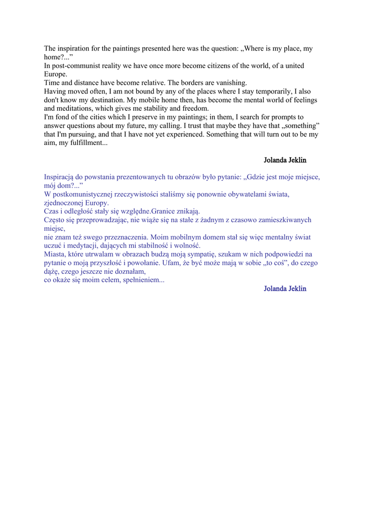 The inspiration for the paintings presented here was the question: „Where is my place, my home?...” In post-communist reality we have once more become citizens of the world, of a united Europe. Time and distance have become relative. The borders are vanishing. Having moved often, I am not bound by any of the places where I stay temporarily, I also don't know my destination. My mobile home then, has become the mental world of feelings and meditations, which gives me stability and freedom. I'm fond of the cities which I preserve in my paintings; in them, I search for prompts to answer questions about my future, my calling. I trust that maybe they have that „something” that I'm pursuing, and that I have not yet experienced. Something that will turn out to be my aim, my fulfillment... Jolanda Jeklin Inspiracją do powstania prezentowanych tu obrazów było pytanie: „Gdzie jest moje miejsce, mój dom?...” W postkomunistycznej rzeczywistości staliśmy się ponownie obywatelami świata, zjednoczonej Europy. Czas i odległość stały się względne.Granice znikają. Często się przeprowadzając, nie wiąże się na stałe z żadnym z czasowo zamieszkiwanych miejsc, nie znam też swego przeznaczenia. Moim mobilnym domem stał się więc mentalny świat uczuć i medytacji, dających mi stabilność i wolność. Miasta, które utrwalam w obrazach budzą moją sympatię, szukam w nich podpowiedzi na pytanie o moją przyszłość i powołanie. Ufam, że być może mają w sobie „to coś”, do czego dążę, czego jeszcze nie doznałam, co okaże się moim celem, spełnieniem... Jolanda Jeklin On the semblance enchanting only with lightness and decorative charm, the oeuvre of Jolanda Jeklin also has a something under the surface. The twin-like similar, lambent panoramas of metropolises, which are only a few hours away but nevertheless distant, breath with the rhythm of nomadic, continuous contemporariness – without prominent attributes, points of reference or borders. The horizontal rhythm of the sea waves stopped in time – monotonous, repetitive, perpetual – it reflects in her visual world a counterpoint of post-industrial urbanism – the degraded, but still limitless and powerful nature. Just as the disturbing torsos of androgenic figures are a metaphor of anonymity and lack a stable definition of the "I", the feerical, cobalt-turquoise mandalas bring to mind the charm of oriental baths and escapist memories or perhaps dreams. Pulsating with a centripetal rhythm, they also document a persistent search for relief – a mental center. Lidia Głuchowska Z pozoru urzekające tylko lekkością i dekoracyjnym wdziękiem, malarstwo Jolandy Jeklin ma i ukryte, drugie dno. Jej bliźniaczo do siebie podobne, migotliwe widoki dostępnych w kilka godzin, choć odległych metropolii, tchną rytmem nomadycznej, płynnej nowoczesności – bez wyrazistych artybutów, punktów odniesienia i granic. Horyzontalny rytm zatrzymanych w czasie morskich fal – monotonny, powtarzalny, nieustanny – odzwierciedla zaś w jej wizualnym świecie kontrapunkt postindustrialnej urbanistyki – degradowaną, lecz ciągle bezkresną i władczą naturę. Jak niepokojące torsa androgynicznych postaci są tu metaforą anonimowości i braku stabilnej definicji „ja”, tak feeryczne, kobaltowo-turkusowe mandale przywołują na myśl czar orientalnych łaźni i eskapistycznych wspomnień czy marzeń. Pulsując dośrodkowym rytmem, dokumentują one także uporczywe poszukiwanie ukojenia – mentalnego centrum. Lidia Głuchowska Jolanda Jeklin Born in Ljubljana in 1976. Artistically bound with Slovenia and – for 15 years now – also with Poland. She gained her first artistic experience in the year 2000 while participating in activities at the Cultural Center in Warsaw on Łazienkowska street. Between 2003-07 she was a part of an informal artistic group under the leadership of Wojtek Pąkowski, she created works of painting as well as sculptures and her first mandala using a mosaic technique. In 2008-2009 she did the painting works entitled Abstractions, and in 2012-2013 pastel portraits and self-portraits as well as marine paintings. Since 2013 she has been creating using painting and graphic techniques and has done installations, including but not limited to, the series - Cities, Mandalas and White is Beautiful. Recently she did illustrations for the poetry of Manja Sirnik Zugman Brstenja/ Abundance. She graduated from the European Academy of Arts with a BA in painting under the tutorship of Antoni Fałat, she did an additional degree in graphics under Professor Ryszard Osadczy (2008-11). She started her postgraduate studies at the Polish-Japanese Academy of Computer Techniques in the New Media Arts Department (2011-12). Since 2013 she has continued her postgraduate studies in the workshop of Professor Stanisław Kortyka and in the supplementary workshop of Norman Smużniak, PhD, habil., at the Institute of Visual Arts in the Arts Department at the University of Zielona Góra. Individual exhibitions 2007 Intensity, Palace of Culture and Science in Warsaw, under the patronage of the Embassy of Slovenia 2007 Dance, video presentation at the Cultural Center Kamnik, Kotlovnica, Slovenia 2008 Abstraction, Dwór Artusa, Gdańsk, as part of the project Slovenia at the Baltic 2010 Reflection of a moment, Galeria Polfa, Łódź 2013 Portrait, a show for a few months, Art Gallery Lawenda Cafe, Gdynia 2013 Memoirs of the Summer, Art Gallery Lawenda Cafe, Gdynia Collective exhibitions 2001 Borki, an auction as part of the Weekend of Slovenian Culture 2010 Nadrzecze, post open air painting workshops exhibition, Gallery Marek, Warszawa 2012 Sense & Simplicity event, live painting event, Philips, Warszawa, 2012 Color Blue, Gallery Zaułek smaków, Warszawa 2014 Charity Auction of Contemporary Art, Galeria +, Warszawa 2014 Women's Day, Gallery PWW, Zielona Góra, Curator: Professor Magdalena Gryska 2014 White is Beautiful