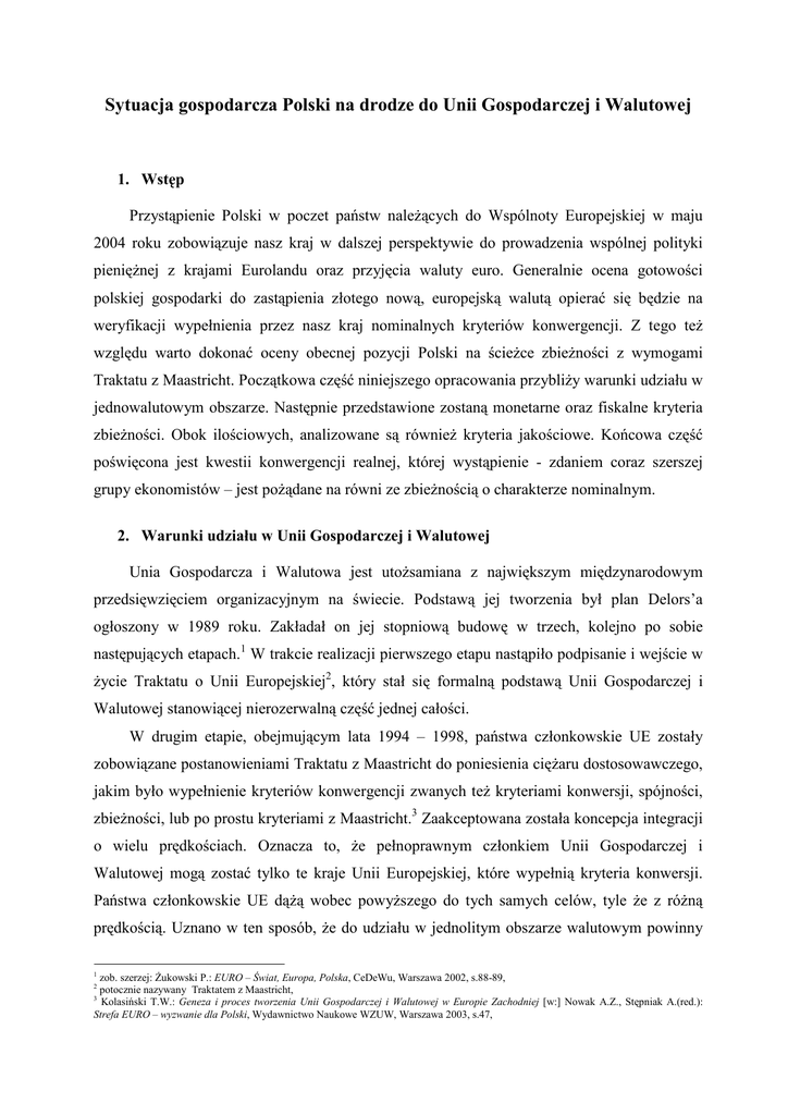 Sytuacja gospodarcza Polski na drodze do Unii Gospodarczej i Walutowej 1. Wstęp Przystąpienie Polski w poczet państw należących do Wspólnoty Europejskiej w maju 2004 roku zobowiązuje nasz kraj w dalszej perspektywie do prowadzenia wspólnej polityki pieniężnej z krajami Eurolandu oraz przyjęcia waluty euro. Generalnie ocena gotowości polskiej gospodarki do zastąpienia złotego nową, europejską walutą opierać się będzie na weryfikacji wypełnienia przez nasz kraj nominalnych kryteriów konwergencji. Z tego też względu warto dokonać oceny obecnej pozycji Polski na ścieżce zbieżności z wymogami Traktatu z Maastricht. Początkowa część niniejszego opracowania przybliży warunki udziału w jednowalutowym obszarze. Następnie przedstawione zostaną monetarne oraz fiskalne kryteria zbieżności. Obok ilościowych, analizowane są również kryteria jakościowe. Końcowa część poświęcona jest kwestii konwergencji realnej, której wystąpienie - zdaniem coraz szerszej grupy ekonomistów – jest pożądane na równi ze zbieżnością o charakterze nominalnym. 2. Warunki udziału w Unii Gospodarczej i Walutowej Unia Gospodarcza i Walutowa jest utożsamiana z największym międzynarodowym przedsięwzięciem organizacyjnym na świecie. Podstawą jej tworzenia był plan Delors’a ogłoszony w 1989 roku. Zakładał on jej stopniową budowę w trzech, kolejno po sobie następujących etapach.1 W trakcie realizacji pierwszego etapu nastąpiło podpisanie i wejście w życie Traktatu o Unii Europejskiej2, który stał się formalną podstawą Unii Gospodarczej i Walutowej stanowiącej nierozerwalną część jednej całości. W drugim etapie, obejmującym lata 1994 – 1998, państwa członkowskie UE zostały zobowiązane postanowieniami Traktatu z Maastricht do poniesienia ciężaru dostosowawczego, jakim było wypełnienie kryteriów konwergencji zwanych też kryteriami konwersji, spójności, zbieżności, lub po prostu kryteriami z Maastricht.3 Zaakceptowana została koncepcja integracji o wielu prędkościach. Oznacza to, że pełnoprawnym członkiem Unii Gospodarczej i Walutowej mogą zostać tylko te kraje Unii Europejskiej, które wypełnią kryteria konwersji. Państwa członkowskie UE dążą wobec powyższego do tych samych celów, tyle że z różną prędkością. Uznano w ten sposób, że do udziału w jednolitym obszarze walutowym powinny 1 zob. szerzej: Żukowski P.: EURO – Świat, Europa, Polska, CeDeWu, Warszawa 2002, s.88-89, potocznie nazywany Traktatem z Maastricht, 3 Kolasiński T.W.: Geneza i proces tworzenia Unii Gospodarczej i Walutowej w Europie Zachodniej [w:] Nowak A.Z., Stępniak A.(red.): Strefa EURO – wyzwanie dla Polski, Wydawnictwo Naukowe WZUW, Warszawa 2003, s.47, 2 zostać dopuszczone kraje, których dobra sytuacja gospodarcza nie podlega dyskusji. Co więcej przyjęto, iż wielkości podstawowych wskaźników ekonomicznych w krajach członkowskich powinny być zbliżone po to, aby osiągnąć pożądaną zbieżność gospodarczą w całej Unii. Rysunek 1. Kryteria zbieżności gospodarczej wynikające z Protokołu załączonego do Traktatu z Maastricht. KRYTERIA ZBIEŻNOŚCI MONETARNE inflacja FISKALNE Maksymalnie 1,5 punktu procentowego powyżej średniej dla trzech państw UE o najniższej inflacji Maksymalnie 3 % PKB stopy procentowe Maksymalnie 2 punkty procentowe powyżej średniej dla trzech państw UE o najniższej inflacji Maksymalnie 60 % PKB kurs walutowy deficyt budżetowy dług publiczny Utrzymywanie kursu w max. +/- 15 % przedziale wahań i niemożność jego dewaluacji Źródło: Opracowanie własne na podstawie: Treaty on European Union, Protocol on the Convergence Citeria Referred to in Article 109j of the Treaty Establishing the European Community, ECSC-EEC-EAEC, Brussels – Luxembourg 1992. Konkretne wartości dotyczące wyżej wymienionych kryteriów spójności zawarte zostały w jednym z protokołów dołączonych do Traktatu.4 Wyłączenie szczegółowych warunków z treści Traktatu było zamierzone, gdyż procedury dotyczące wprowadzania zmian do protokołów są zdecydowanie prostsze niż możliwości zmiany samego Traktatu. Daje to władzom Unii Europejskiej pewną swobodę w kształtowaniu warunków dostępu do strefy euro. Stosownie do potrzeb mogą być one zaostrzone lub złagodzone.5 Obecnie kształtują się one na poziomie zaprezentowanym na rysunku 1. 4 Treaty on European Union, Protocol on the Convergence Citeria Referred to in Article 109j of the Treaty Establishing the European Community, ECSC-EEC-EAEC, Brussels – Luxembourg 1992, 5 Oręziak L.: Euro, nowy pieniądz, Wydawnictwo Naukowe PWN, Warszawa 1999, s.29, Ostatnią fazą budowy było wprowadzenie wraz z początkiem 1999 roku nowej waluty euro na terenie 11 krajów Unii Europejskiej. Był to moment, w którym formalnie zaczęła funkcjonować strefa euro, określana także w literaturze obszarem euro, lub Eurolandem. Od 2001 roku dołączyła do niej Grecja. Poza strefą euro znajdują się nowi członkowie Unii Europejskiej - w tym Polska oraz trzy kraje, które dotychczas nie zrezygnowały z własnej waluty na rzecz wspólnej jednostki pieniężnej: Wielka Brytania, Dania i Szwecja. W przypadku nowych kandydatów stosuje się tzw. derogację, a wspomniane kraje nazywa członkami UGW z derogacją. Oznacza to, że państwa te są zobowiązane przyjąć euro, a to z kolei obliguje je do podjęcia działań niezbędnych do spełnienia kryteriów zbieżności. Dopiero wtedy staną się pełnoprawnymi członkami Unii Gospodarczej i Walutowej. 3. Sytuacja gospodarcza Polski w świetle nominalnych kryteriów spójności Pierwszym z analizowanych kryteriów monetarnych jest kryterium inflacyjne. Proces obniżania stopy inflacji w Polsce zaliczyć należy do największych sukcesów krajowej gospodarki w okresie transformacji. Konsekwentnie prowadzona polityka pieniężna, nakierowana na realizację średniookresowego celu, przyczyniła się d