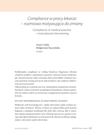 Compliance w pracy lekarza – rozmowa motywująca do zmiany Compliance in medical practice – motivational interviewing Anna Czelej, Małgorzata Kaczyńska FUTUREMD Problematyka compliance to według Światowej Organizacji Zdrowia „światowy problem o ogromnym znaczeniu”. Zarówno branża medyczna, jak i farmaceutyczna szuka rozwiązań, które pozwoliłyby zwiększyć procent pacjentów stosujących się do zaleceń lekarzy. Jak zwiększyć efektywność procesu leczenia? Odpowiedzią na to pytanie jest m.in. doskonalenie umiejętności komunikacyjnych. Lekarz rozważnie zarządzający komunikacją i relacją z pacjentem ma większy wpływ na motywację i zaangażowanie pacjenta w proces leczenia. Kto jest odpowiedzialny za efektywność leczenia? Większość osób korzystających z opieki zdrowotnej nadal oczekuje pomocy tylko od lekarza. Wierzy, że lekarz po zadaniu kilku pytań postawi diagnozę, a następnie zaordynuje leki, które albo wyleczą, albo w znacznym stopniu polepszą komfort życia. Mówiąc inaczej, tacy pacjenci zrzucają całą odpowiedzialność za swój powrót do zdrowia na lekarza, pielęgniarkę i cały system opieki zdrowotnej. Vol. 4/Nr 3(13)/2011 53 Compliance w pracy lekarza – rozmowa motywująca do zmiany A. Czelej, M. Kaczyńska Praca z takim pacjentem jest dla lekarza nie lada wyzwaniem. Nic dziwnego: bo kto z nas w swoim życiu nie słyszy głosu zewnętrznych autorytetów, które mówią, co dla nas dobre, co powinniśmy robić? Nawet jeśli się z nimi zgadzamy na poziomie racjonalnym, to w życiu postępujemy dokładnie odwrotnie. Rzuć palenie…, Proszę regularnie zażywać leki..., Nie stresuj się tak…, Powinna pani zacząć ćwiczyć… Przykłady można mnożyć – począwszy od naszej komunikacji z dziećmi, poprzez dobre rady znajomych, po zalecenia lekarza czy nasze własne postanowienia noworoczne. Mechanizm jest taki sam – nacisk zawsze budzi opór. Dzieje się tak dlatego, że perswazja i zmiana za nią idąca są zagrożeniem dla ukrytych korzyści, które pacjent czerpie z dotychczasowego stylu życia (np. chwila przyjemności, wolność od dyscypliny zażywania leków, komfort niećwiczenia i niemęczenia się). Problem pojawia się wówczas, gdy zmiana stylu życia staje się czynnikiem, który w ogromnym stopniu decyduje o powodzeniu długoterminowej terapii. Badania pokazują, że pacjenci często nie stosują się do zaleceń lekarzy, którzy przekonują ich do zmiany destrukcyjnych, szkodliwych zachowań. Choroby przewlekłe, takie jak: cukrzyca, choroby serca, choroby układu oddechowego, otyłość, nowotwory, depresja, są w dużym stopniu wynikiem niewłaściwego trybu życia. Dlatego lekarz w swojej codziennej praktyce używa różnych sposobów, aby przekonać pacjenta do zmiany niezdrowych przyzwyczajeń. Stosuje rady, zachęty, pochlebstwa, a nawet ostrzeżenia. Takie komunikaty nie przynoszą jednak większych rezultatów. Sukces jest możliwy wówczas, gdy odpowiedzialność za proces leczenia przyjmuje nie tylko lekarz, ale również sam pacjent. Co może zrobić lekarz, by zaprosić pacjenta do współodpowiedzialności? Kluczem do odpowiedzi jest zmiana postawy i dotychczasowych nawyków komunikacyjnych lekarza. Motywację pacjenta do stosowania się do zaleceń może kształtować właśnie lekarz. Poprzez uważne słuchanie i życzliwe zainteresowanie uzyskuje dostęp do istotnych dla procesu leczenia informacji. W dalszych etapach rozmowy zaprasza pacjenta do współpracy, a tym samym zyskuje w nim partnera i osobę współodpowiedzialną za leczenie. 54 Vol. 4/Nr 3(13)/2011 Compliance w pracy lekarza – rozmowa motywująca do zmiany A. Czelej, M. Kaczyńska Dyscyplina przyjmowania leków Problemy z dyscypliną zażywania leków występują w większości zalecanych terapii, w których przyjmowanie leków musi się stać, a przynajmniej powinno, elementem stylu życia pacjenta. Osoby pytane, dlaczego zaprzestały przyjmowania leków, często przytaczają argument zapominam. „Zapominanie” jest tylko wymówką, przykrywką, wierzchołkiem góry lodowej. I gdy zaglądamy głębiej, znajdujemy różnego rodzaju obiekcje i prawdziwe powody nieprzyjmowania leków. Są to różnego rodzaju ambiwalencje związane z przekonaniami dotyczącymi skutków ubocznych leków, ich realnej skuteczności, przekonaniami dotyczącymi samego schorzenia, jego akceptacji i potencjalnych następstw. To również brak pewności i gwarancji, że podjęte działania przyniosą określony skutek. To strach przed ryzykiem rozstania się z tym, co znane na rzecz niepewnej przyszłości. William R. Miller i Stephen Rollnick w swojej książce „Wywiad motywujący. Jak przygotować ludzi do zmiany” wskazują na dwojakie przyczyny nieprzestrzegania ustaleń leczniczych. Na poziomie akceptacji problemu są to np. niezrozumienie wagi choroby, wątpliwości, czy zmiana jest możliwa, a jeśli tak, to jakie będą jej skutki uboczne. Na poziomie akceptacji terapii to przede wszystkim obawy o trafność proponowanego sposobu leczenia, uprzednie negatywne doświadczenia lub przeszkody zewnętrzne w postaci problemów finansowych czy trudności rodzinnych pacjenta. Na czym polega rozmowa, która motywuje? Zastosowanie w leczeniu rozmowy motywującej powoduje, że pacjent zmienia postawę, ma motywację do zmiany zachowań i uczenia się nowych umiejętności. Rozmowa z jednej strony dotyczy kwestii ograniczenia bądź zaniechania zachowań zagrażających pacjentowi, np. pomijania zaleconej dawki leku, palenia papierosów czy złych nawyków żywieniowych. Z drugiej zaś strony dotyczy odkrycia przez niego nowych działań polegających np. na regularnym przyjmowaniu leków czy zmianie diety. Lekarz zazwyczaj ostrzega pacjenta, daje mu rady, ponieważ chce dla niego jak najlepiej, chce, aby ten zmienił swoje szkodliwe zachowania. Jednak zdecydowanie lepszym sposobem na zmianę tych nawyków jest pomoc pacjentowi w znalezieniu i zwe