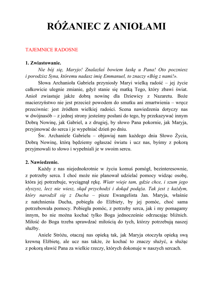 RÓŻAIEC Z AIOŁAMI TAJEMNICE RADOSNE 1. Zwiastowanie. ie bój się, Maryjo! Znalazłaś bowiem łaskę u Pana! Oto poczniesz i porodzisz Syna, któremu nadasz imię Emmanuel, to znaczy «Bóg z nami!». Słowa Archanioła Gabriela przyniosły Maryi wielką radość – jej życie całkowicie ulegnie zmianie, gdyż stanie się matką Tego, który zbawi świat. Anioł zwiastuje jakże dobrą nowinę dla Dziewicy z Nazaretu. Boże macierzyństwo nie jest przecież powodem do smutku ani zmartwienia – wręcz przeciwnie: jest źródłem wielkiej radości. Scena nawiedzenia dotyczy nas w dwójnasób – z jednej strony jesteśmy posłani do tego, by przekazywać innym Dobrą Nowinę, jak Gabriel, a z drugiej, by słowo Pana pokornie, jak Maryja, przyjmować do serca i je wypełniać dzień po dniu. Św. Archaniele Gabrielu – objawiaj nam każdego dnia Słowo Życia, Dobrą Nowinę, którą będziemy ogłaszać światu i ucz nas, byśmy z pokorą przyjmowali to słowo i wypełniali je w swoim sercu. 2. awiedzenie. Każdy z nas niejednokrotnie w życiu komuś pomógł, bezinteresownie, z potrzeby serca. I choć może nie planował udzielać pomocy widząc osobę, która jej potrzebuje, wyciągnął rękę. Wiatr wieje tam, gdzie chce, i szum jego słyszysz, lecz nie wiesz, skąd przychodzi i dokąd podąża. Tak jest z każdym, który narodził się z Ducha – pisze Ewangelista Jan. Maryja, właśnie z natchnienia Ducha, pobiegła do Elżbiety, by jej pomóc, choć sama potrzebowała pomocy. Pobiegła pomóc, z potrzeby serca, jak i my pomagamy innym, bo nie można kochać tylko Boga jednocześnie odrzucając bliźnich. Miłość do Boga trzeba sprawdzać miłością do tych, którzy potrzebują naszej służby. Aniele Stróżu, otaczaj nas opieką tak, jak Maryja otoczyła opieką swą krewną Elżbietę, ale ucz nas także, że kochać to znaczy służyć, a służąc z pokorą sławić Pana za wielkie rzeczy, których dokonuje w naszych sercach. 3. arodzenie I nagle przyłączyło się do anioła mnóstwo zastępów niebieskich, które wielbiły Boga słowami: «Chwała Bogu na wysokościach, a na ziemi pokój ludziom Jego upodobania». Obietnica dana przez Boga wypełniła się – Maryja powiła Syna. Patrząc na miejsce, w którym przyszedł na świat Jezus, nie zapowiadało to Jego Królewskości – ubogi żłób, otoczenie zwierząt. Jednak w tej prostocie dokonywały się rzeczy niezwykłe – zewsząd przybiegali pasterze, by oddać pokłon Dziecięciu. Przybyli również Królowie, by uniżyć się przed Tym, który jest większy od nich. Aniołowie radowali się z narodzenia Pana. Opowiadały Pasterzom o tym, co wydarzyło się w Betlejem, śpiewały Gloria na cześć Tego, który się narodził. A co by było gdyby Aniołowie nie oznajmili Pasterzom, że narodził się dla nich Zbawiciel?! Co by było, gdyby Anioł nie ostrzegł Królów o podstępie Heroda, a ci, wracając do swojej ojczyzny powiedzieliby Herodowi, gdzie narodził się Mesjasz, by i ten mógł się do niego udać. A co by było gdybym to ja był Pasterzem, który słysząc wieść Aniołów miał zostawić cały swój dobytek i biec do Króla, który narodził się w stajni?! Co by było, gdybym to ja był Aniołem, który nie zważając na opinię innych śpiewa z radością „Gloria in excelsis Deo!”. Aniele Stróżu, ucz mnie w każdym czasie śpiewać Panu hymn uwielbienia razem z zastępami Aniołów w niebie. Pomagaj mi każdego dnia z tak wielkim pośpiechem, jak Pastuszkowie, szukać Chrystusa w drugim człowieku. 4. Ofiarowanie. Gdy potem upłynęły dni ich oczyszczenia według Prawa Mojżeszowego, przynieśli Je do Jerozolimy, aby Je przedstawić Panu. Maryja i Józef wypełniając Prawo przyszli do świątyni, by ofiarować Bogu Jego własnego Syna. Ale tak dzieje się również z nami. Poprzez Chrzest święty staliśmy się dziećmi samego Boga. I my także zostaliśmy ofiarowani Bogu jako Jego własne dzieci. Ale to pierwsze ofiarowanie wymaga od nas uaktualnienia – postępując w wierze na nowo musimy ofiarowywać całego siebie Bogu, by móc się z Nim jednoczyć. Ofiarować siebie Bogu to nie tylko złożyć pobożną deklarację, pomodlić się, ale to pomoc w przywracaniu godności dziecka Bożego tym, którzy ją utracili. Święty Aniele, pomóż mi składać Bogu tylko czyste ofiary bez względu na to, jaki miecz może przeniknąć moje serce. Ucz mnie składać ofiary ze swego niedostatku, jak uczyniła to uboga wdowa, a nie tylko z tego, co mi zbywa. 5. Znalezienie. Czy nie wiedzieliście, że powinienem być w tym, co należy do mego Ojca? Ten, kto w życiu stracił bliską osobę – dziecko, któregoś z rodziców, przyjaciela, wie, co czuła Maryja – będąc już daleko od Jerozolimy zorientowała się, że Jezus nie wraca z nimi do domu. I tak, jak każda matka by uczyniła, z pośpiechem ruszyła w poszukiwaniu swego dziecka. Dopiero po trzech dniach odnalazła je w świątyni wśród uczonych w piśmie. Możemy sobie wyobrazić Maryję wpadającą do świątyni – łzy szczęścia z odnalezienia Syna zapewne same płynęły po policzkach. Strata kogoś bliskiego jest chyba największym bólem. Przenikające się uczucia strachu i tęsknoty przeszywają do głębi serce. A jak Ty się czujesz bracie, siostro, gdy tracisz Jezusa z oczu?! Czujesz strach o swoje życie, swoją duszę? A może twoje serce wypełnia tęsknota, która umacnia pragnienie wtulenia się w ramiona Chrystusa?! Aniele Stróżu, dopomóż mi, abym nigdy nie tracił Chrystusa z moich oczu, a gdy grzech przysłoni mi Jego twarz pomóż z nim zerwać i dać się odnaleźć Temu, który zwyciężył mój grzech. TAJEMNICE ŚWIATŁA 1. Chrzest Jezusa w Jordanie Wtedy przyszedł Jezus z Galilei nad Jordan do Jana, żeby przyjąć chrzest od niego. Lecz Jan powstrzymywał Go, mówiąc: «To ja potrzebuję chrztu od Ciebie, a Ty przychodzisz do mnie?» Jezus mu odpowiedział: «Pozwól teraz, bo tak godzi s