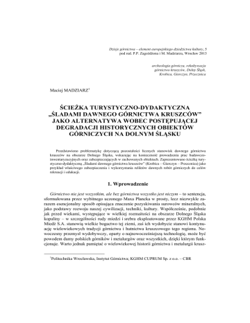 Dzieje górnictwa – element europejskiego dziedzictwa kultury, 5 pod red. P.P. Zagożdżona i M. Madziarza, Wrocław 2013 archeologia górnicza, rekultywacja górnictwo kruszców, Dolny Śląsk, Krobica, Gierczyn, Przecznica Maciej MADZIARZ1 ŚCIEŻKA TURYSTYCZNO-DYDAKTYCZNA „ŚLADAMI DAWNEGO GÓRNICTWA KRUSZCÓW” JAKO ALTERNATYWA WOBEC POSTĘPUJĄCEJ DEGRADACJI HISTORYCZNYCH OBIEKTÓW GÓRNICZYCH NA DOLNYM ŚLĄSKU Przedstawiono problematykę dotyczącą pozostałości licznych stanowisk dawnego górnictwa kruszców na obszarze Dolnego Śląska, wskazując na konieczność prowadzenia prac badawczoinwentaryzacyjnych oraz zabezpieczających w zachowanych obiektach. Zaprezentowano ścieżkę turystyczno-dydaktyczną „Śladami dawnego górnictwa kruszców” (Krobica – Gierczyn – Przecznica) jako przykład właściwego zabezpieczenia i wykorzystania reliktów dawnych robót górniczych do celów rekreacji i edukacji. 1. Wprowadzenie Górnictwo nie jest wszystkim, ale bez górnictwa wszystko jest niczym – to sentencja, sformułowana przez wybitnego uczonego Maxa Plancka w prosty, lecz niezwykle zarazem esencjonalny sposób opisująca znaczenie pozyskiwania surowców mineralnych, jako podstawy rozwoju naszej cywilizacji, techniki, kultury. Współcześnie, podobnie jak przed wiekami, występujące w wielkiej rozmaitości na obszarze Dolnego Śląska kopaliny – w szczególności rudy miedzi i srebra eksploatowane przez KGHM Polska Miedź S.A. stanowią wielkie bogactwo tej ziemi, zaś ich wydobycie stanowi kontynuację wielowiekowych tradycji górnictwa i hutnictwa kruszcowego tego regionu. Nowoczesny przemysł wydobywczy, oparty o najnowocześniejszą technologię, może być powodem dumy polskich górników i metalurgów oraz wszystkich, dzięki którym funkcjonuje. Warto jednak pamiętać o wielowiekowej historii górnictwa i metalurgii krusz1 Politechnika Wrocławska, Instytut Górnictwa; KGHM CUPRUM Sp. z o.o. – CBR 230 Maciej MADZIARZ ców na Dolnym Śląsku, którego początki sięgać mogą nawet epoki brązu. Setki lat prac poszukiwawczych i eksploatacyjnych pozostawiły po sobie bogate, materialne dziedzictwo – utrwalone w skałach Sudetów i ich przedgórza, które wymaga niezwłocznie szczegółowego rozpoznania, zabezpieczenia i ochrony, mogąc też zostać wykorzystanym dla zwiększenia atrakcyjności turystycznej regionu. Mimo, że pojęcie terytorialne Śląska ulegało na przestrzeni wieków istotnym zmianom, eksploatację kopalin prowadzono na tym terenie od wielu stuleci, zaś Dolny Śląsk wyraźnie wyodrębniał się jako teren dawnej działalności górniczej. Na północ i wschód od jego granic nie prowadzono żadnych robót górniczych aż po rejon Bytomia i Tarnowskich Gór. Na zachodzie terenem robót górniczych były dopiero odległe okolice Freibergu. Mimo wyraźnego wyodrębnienia dolnośląskiego górnictwa charakteryzował je wysoki poziom techniki, odpowiadający innym ważnym historycznym ośrodkom wydobywczym w Europie (Dziekoński, 1972). W pochodzącym z 990 r. dokumencie Dagome iudex potwierdzającym włączenie Śląska do państwa polskiego bardzo enigmatycznie przedstawiono ówczesne granice tego regionu: „...od tego Krakowa aż do rzeki Odry, prosto do miejsca, które nazywa się Alemure (Ołomuniec lub Morawy), a od tej Alemury aż do ziemi Miliczan i od granicy Miliczan prosto do Odry i stąd idąc wzdłuż rzeki Odry aż [...] Schinesghe (może Gniezno lub Szczecin)”. Granice Polski na Bobrze i Kwisie zostały ustalone w roku 1000, kiedy utworzono biskupstwo wrocławskie i nie uległy w średniowieczu istotnym zmianom. Południową granicę stanowiły masywy górskie Sudetów, Gór Izerskich i Karkonoszy. Od XIII w. pod pojęciem Śląska rozumiano ziemie leżące na zachód od Przesieki Śląskiej, tj. puszcz granicznych rozdzielających Dolny i Górny Śląsk. W połowie XV w. Śląskiem określano już ww. obszar wraz z księstwami górnośląskimi. Aby uwzględnić dawne podziały, używano jednak pojęć Dolny Śląsk – Silesia Inferior, Niederschlesien dla dawnego Śląska i Górny Śląsk – Silesia Superior, Oberschlesien (Czapliński i in., 2002). Złoto, rudy srebra i ołowiu, miedzi, cyny, arsenu, kobaltu, niklu, chromu, żelaza, uranu, węgiel kamienny, brunatny, surowce skalne, a nawet wody mineralne stanowiły i w części stanowią nadal wielkie bogactwo dolnośląskiej ziemi. Przedmiotem zainteresowania dawnych górników były przede wszystkim liczne, niewielkie złoża polimetaliczne (zawierające kilka głównych minerałów kruszcowych). Na Dolnym Śląsku, ściślej w Sudetach, do tego typu formacji kruszcowych zalicza się złoża i wystąpienia charakteryzujące się wieloskładnikową i zmienną mineralizacją oraz bogactwem form występowania. Niektóre żyły lub zmineralizowane strefy osiągają długość ponad 2 km (Radzimowice), a głębokość ponad 300 m (Kowary). Eksploatowane tu dawniej złoża są w znakomitej większości tzw. złożami „otwartymi”, tzn. ciała rudne tych złóż są częściowo odsłonięte przez powierzchnię erozyjną, co umożliwiało ich wczesne odkrycie i wybierkę. W początkowym okresie eksploatacji wybierano znajdujące się na niewielkiej głębokości najbogatsze i najłatwiej dostępne ich części, a roboty górnicze, poza nielicznymi wyjątkami, prowadzone były okresowo. Znajomość złóż ograniczała Ścieżka turystyczno-dydaktyczna „Śladami dawnego górnictwa kruszców”... 231 się do rozpoznanych robotami górniczymi płytkich partii przypowierzchniowych. Warto zauważyć, że obecne tereny Dolnego Śląska znajdowały się w epoce brązu w zasięgu osadnictwa tzw. kultury unietyckiej, która formowała się od ok. 2100 r. p.n.e. w szczególności na południe od Wrocławia (Czapliński i in., 2002). W odkrytych cmentarzyskach szkieletowych tej kultury znajdowane są liczne wyroby miedziane oraz wyroby z brązu i złota, w tym broń, przed