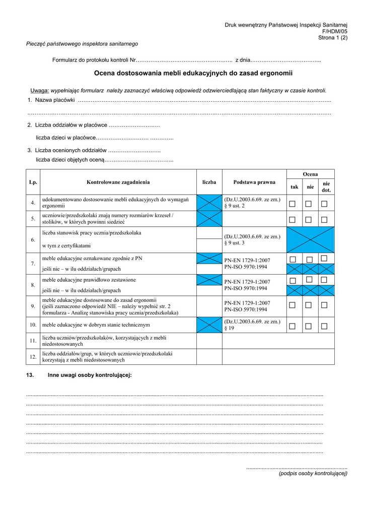 Druk wewnętrzny Państwowej Inspekcji Sanitarnej F/HDM/05 Strona 1 (2) Pieczęć państwowego inspektora sanitarnego Formularz do protokołu kontroli Nr…………………………………………….. z dnia………………………………... Ocena dostosowania mebli edukacyjnych do zasad ergonomii Uwaga: wypełniając formularz należy zaznaczyć właściwą odpowiedź odzwierciedlającą stan faktyczny w czasie kontroli. 1. Nazwa placówki …………………………………………………..…...……………………………………………………………….. .……………………………………………………………..………………………………………………………………………….……… 2. Liczba oddziałów w placówce …………………….… liczba dzieci w placówce……………….………. …………. 3. Liczba ocenionych oddziałów ……………………….. liczba dzieci objętych oceną……………………………….. Ocena Lp. Kontrolowane zagadnienia 4. udokumentowano dostosowanie mebli edukacyjnych do wymagań ergonomii 5. uczniowie/przedszkolaki znają numery rozmiarów krzeseł / stolików, w których powinni siedzieć liczba stanowisk pracy ucznia/przedszkolaka 6. w tym z certyfikatami meble edukacyjne oznakowane zgodnie z PN 7. jeśli nie – w ilu oddziałach/grupach meble edukacyjne prawidłowo zestawione 8. jeśli nie – w ilu oddziałach/grupach liczba Podstawa prawna nie nie dot. (Dz.U.2003.6.69. ze zm.) § 9 ust. 2 (Dz.U.2003.6.69. ze zm.) § 9 ust. 3 PN-EN 1729-1:2007 PN-ISO 5970:1994 PN-EN 1729-1:2007 PN-ISO 5970:1994 9. meble edukacyjne dostosowane do zasad ergonomii (jeśli zaznaczono odpowiedź NIE – należy wypełnić str. 2 formularza - Analizę stanowiska pracy ucznia/przedszkolaka) PN-EN 1729-1:2007 PN-ISO 5970:1994 10. meble edukacyjne w dobrym stanie technicznym (Dz.U.2003.6.69. ze zm.) § 19 11. liczba uczniów/przedszkolaków, korzystających z mebli niedostosowanych 12. liczba oddziałów/grup, w których uczniowie/przedszkolaki korzystają z mebli niedostosowanych 13. tak Inne uwagi osoby kontrolującej: .................................................................................................................................................................................................. .................................................................................................................................................................................................. .................................................................................................................................................................................................. .................................................................................................................................................................................................. .................................................................................................................................................................................................. ..................................................................................................................................................................................…............ .................................................................................................................................................................................................. .................................................................. (podpis osoby kontrolującej) Druk wewnętrzny Państwowej Inspekcji Sanitarnej F/HDM/05 Strona 2 (2) Analiza stanowiska pracy ucznia/przedszkolaka nr …….. Analizę przeprowadzono w dniu …………………….….... w oddziale/grupie ……………..…...……..… w sali …………………...……………. na podstawie PN-EN 1729-1:2007 / PN-ISO 5970:1994 Numer rozmiaru krzesła i stolika, Wysokość ciała Nr ucznia z których uczeń i/lub podkolanowa w dzienniku ciała ucznia / Lp. /przedszkolak* szkolnym/ przedszkolaka* powinien przedszkolnym* korzystać w cm zgodnie z PN 1 2 3 4 Krzesło Wysokość siedziska w cm 5 Stolik Numer Wysokość rozmiaru płyty roboczej zaznaczony na w cm krześle 6 7 - właściwe zaznaczyć P - prawidłowo zestawione krzesło ze stolikiem; dostosowane do wymagań ergonomii N - nieprawidłowo zestawione krzesło ze stolikiem; niedostosowane do wymagań ergonomii * Dostosowanie stolika Prawidłowość i krzesła do zestawienia Numer wysokości stolika i rozmiaru ucznia/ krzesła zaznaczony (zgodnie z PN) przedszkolaka* na stoliku P/N (zgodnie z PN) P/N 8 9 10