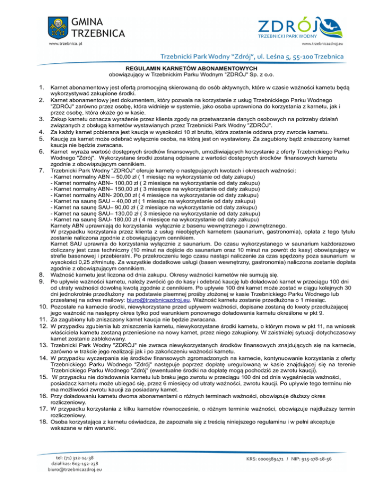 Regulamin karnetów - Gminny Park Wodny TRZEBNICA