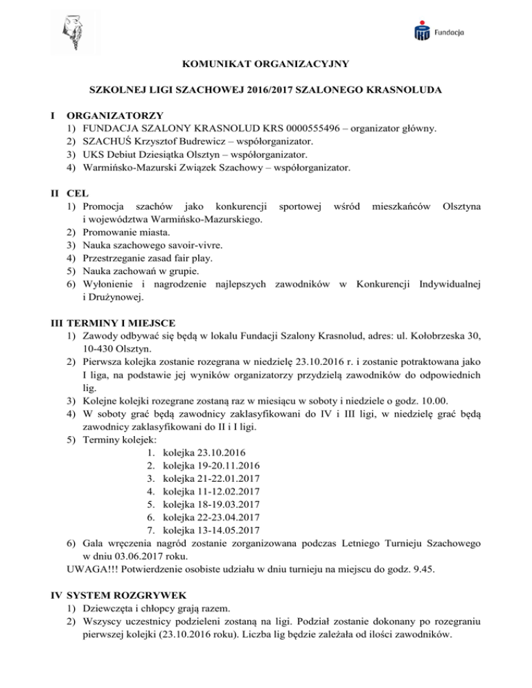 KOMUNIKAT ORGANIZACYJNY SZKOLNEJ LIGI SZACHOWEJ 2016/2017 SZALONEGO KRASNOLUDA I ORGANIZATORZY 1) FUNDACJA SZALONY KRASNOLUD KRS 0000555496 – organizator główny. 2) SZACHUŚ Krzysztof Budrewicz – współorganizator. 3) UKS Debiut Dziesiątka Olsztyn – współorganizator. 4) Warmińsko-Mazurski Związek Szachowy – współorganizator. II CEL 1) Promocja szachów jako konkurencji sportowej wśród mieszkańców Olsztyna i województwa Warmińsko-Mazurskiego. 2) Promowanie miasta. 3) Nauka szachowego savoir-vivre. 4) Przestrzeganie zasad fair play. 5) Nauka zachowań w grupie. 6) Wyłonienie i nagrodzenie najlepszych zawodników w Konkurencji Indywidualnej i Drużynowej. III TERMINY I MIEJSCE 1) Zawody odbywać się będą w lokalu Fundacji Szalony Krasnolud, adres: ul. Kołobrzeska 30, 10-430 Olsztyn. 2) Pierwsza kolejka zostanie rozegrana w niedzielę 23.10.2016 r. i zostanie potraktowana jako I liga, na podstawie jej wyników organizatorzy przydzielą zawodników do odpowiednich lig. 3) Kolejne kolejki rozegrane zostaną raz w miesiącu w soboty i niedziele o godz. 10.00. 4) W soboty grać będą zawodnicy zaklasyfikowani do IV i III ligi, w niedzielę grać będą zawodnicy zaklasyfikowani do II i I ligi. 5) Terminy kolejek: 1. kolejka 23.10.2016 2. kolejka 19-20.11.2016 3. kolejka 21-22.01.2017 4. kolejka 11-12.02.2017 5. kolejka 18-19.03.2017 6. kolejka 22-23.04.2017 7. kolejka 13-14.05.2017 6) Gala wręczenia nagród zostanie zorganizowana podczas Letniego Turnieju Szachowego w dniu 03.06.2017 roku. UWAGA!!! Potwierdzenie osobiste udziału w dniu turnieju na miejscu do godz. 9.45. IV SYSTEM ROZGRYWEK 1) Dziewczęta i chłopcy grają razem. 2) Wszyscy uczestnicy podzieleni zostaną na ligi. Podział zostanie dokonany po rozegraniu pierwszej kolejki (23.10.2016 roku). Liczba lig będzie zależała od ilości zawodników. 3) Maksymalna liczba lig – 4. 4) Zawodnicy nieuczestniczący w pierwszej kolejce przy zgłoszeniu się do rozgrywek będą traktowani jako nowozgłaszający się. 5) Nowozgłaszający się do rozgrywek rozpoczynają grę (dotyczy sytuacji gdy zostaną wyodrębnione co najmniej trzy ligi, przepisy mają zastosowanie od drugiej kolejki): a) zawodnicy o rankingu minimum 1800 - w I lidze, b) zawodnicy o rankingu minimum 1600 - w II lidze, c) pozostali zawodnicy w III lidze bądź IV lidze – w zależności od ilości zawodników w poszczególnych ligach. 6) Na prośbę zawodnika można dopuścić go do gry w niższej lidze niż ta, która jest mu przypisana, zgodnie z posiadaną kategorią (dotyczy zawodników nowozgłaszających się). 7) Informacja o posiadanej kategorii będzie weryfikowana w Centralnym Rejestrze. 8) Każdy zawodnik w jednej kolejce ligi może rozegrać maksymalnie jeden turniej (zagrać w jednej lidze). 9) Zawodnik ma prawo do gry w lidze, do której go przydzielono decyzją organizatora. 10) Zawodnik opuszczając kolejkę nie spada z ligi, w której miał prawo gry. 11) W każdej kolejce rozgrywa się 7 rund, tempo gry P’15 (15 minut na partię dla zawodnika). Za zwycięstwo zawodnik otrzymuje 1 pkt, za remis 0,5 pkt. 12) W celu obiektywnego porównywania wyników zawodnicy: a) grający w I lidze otrzymują 10 pkt premii, b) zawodnicy grający w II lidze otrzymają 7 pkt premii, c) zawodnicy grający w III lidze otrzymają 4 pkt premii, d) zawodnicy grający w IV lidze otrzymają 1 pkt premii. 13) Pierwsza kolejka zostanie potraktowana jako I liga – wszyscy uczestnicy otrzymają 10 pkt premii. 14) Rozegranych zostanie 7. kolejek, do klasyfikacji zalicza się 5 najlepszych wyników. 15) Kojarzenie zawodników komputerowe, kryteria kojarzenia zawodników z tych samych szkół zostaną ustalone przed pierwszą kolejką i zostaną ogłoszone przed pierwszą rundą dnia 23.10.2016 r. 16) Zamknięcie list startowych – 15 minut przed rozpoczęciem gry. V UCZESTNICY 1) W rozgrywkach mogą brać udział wszyscy uczniowie ze szkół podstawowych, gimnazjów i szkół ponadgimnazjalnych z Olsztyna i województwa warmińsko-mazurskiego. 2) Liczba miejsc ograniczona do 80 osób. Decyduje data zgłoszenia. 3) Zasady podziału na ligi po rozegraniu pierwszej kolejki. 4) Przydział zawodników na ligi (obowiązujący od drugiej kolejki) zostanie dokonany na podstawie ilości uczestników oraz tabeli wyników pierwszej kolejki. O podziale na ligi organizator powiadomi uczestników przed drugą kolejką, poprzez ogłoszenie na stronie internetowej. VI KLASYFIKACJA INDYWIDUALNA 1) Będą prowadzone osobne klasyfikacje dla dziewcząt i chłopców w grupach wiekowych: a) szkoły podstawowe, b) gimnazja, c) szkoły ponadgimnazjalne. 2) O kolejności miejsc decyduje: a) suma 5. najlepszych wyników zawodnika, b) wynik procentowy, c) ilość rozegranych turniejów. VII KLASYFIKACJA DRUŻYNOWA 1) Będą prowadzone trzy klasyfikacje osobno dla szkół podstawowych, gimnazjów i szkół ponadgimnazjalnych. 2) Drużyna może liczyć dowolną ilość osób, wynik drużyny w danej kolejce stanowi suma punktów uzyskanych przez 4 najlepszych zawodników, w tym przynajmniej 1 dziewczynkę. 3) Do końcowej klasyfikacji zalicza się 5 najlepszych wyników drużyny. 4) O kolejności miejsc decyduje: a) suma 5. najlepszych wyników drużyny, b) 6. wynik drużyny, c) 7. wynik drużyny. VIII ZASADY AWANSU I SPADKU (obowiązują przy utworzonych czterech ligach, obowiązują od drugiej kolejki) Liga I II III IV awans 15% 18% 20% Spadek 10% 15% 18% - IX NAGRODY I WYRÓŻNIENIA 1) Na zakończenie Ligi wyróżnieni zostaną zawodnicy zajmujący: a) miejsca I-III wśród szachistek szkół podstawowych, b) miejsca I-III wśród szachistów szkół podstawowych, c) miejsca I-III wśród szachistek szkół gimnazjalnych, d) miejsca I-III wśród szachistów szkół gimnazjalnych, e) miejsca I-III wśród szachistek szkół ponadgimnazjalnych f) miejsca I-III wśród szachistów szkół ponadgimnazjalnych, 2) Na zakończenie Ligi wyróżnione zostaną: a) najlepsza drużyna na p