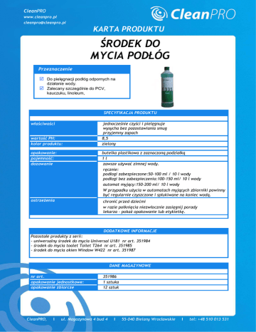 CleanPRO www.cleanpro.pl [email protected] KARTA PRODUKTU ŚRODEK DO MYCIA PODŁÓG Przeznaczenie Do pielęgnacji podłóg odpornych na działanie wody. Zalecany szczególnie do PCV, kauczuku, linoleum, SPECYFIKACJA PRODUKTU właściwości wartość PH: kolor produktu: jednocześnie czyści i pielęgnuje wysycha bez pozostawiania smug przyjemny zapach 8,5 zielony opakowanie: pojemność: dozowanie butelka plastikowa z zaznaczoną podziałką 1l zawsze używać zimnej wody. ręcznie: podłogi zabezpieczone:50-100 ml / 10 l wody podłogi bez zabezpieczenia:100-150 ml/ 10 l wody automat myjący:150-200 ml/ 10 l wody W przypadku użycia w automatach myjących zbiorniki powinny być regularnie czyszczone i spłukiwane na koniec wodą. ostrzeżenia chronić przed dziećmi w razie połknięcia niezwłocznie zasięgnij porady lekarza - pokaż opakowanie lub etykietkę. SPECYFIKACJA PRODUKTU DODATKOWE INFORMACJE Pozostałe produkty z serii: - uniwersalny środek do mycia Universal U181 nr art. 351984 - środek do mycia toalet Toilet T264 nr art. 351985 - środek do mycia okien Window W422 nr art. 351987 DANE MAGAZYNOWE nr art. opakowanie jednostkowe: opakowanie zbiorcze CleanPRO, I 351986 1 sztuka 12 sztuk mail: [email protected] ul. Magazynowa 4 bud 4 I 55-040 Bielany www.cleanpro.pl Wrocławskie I tel: +48 510 013 531