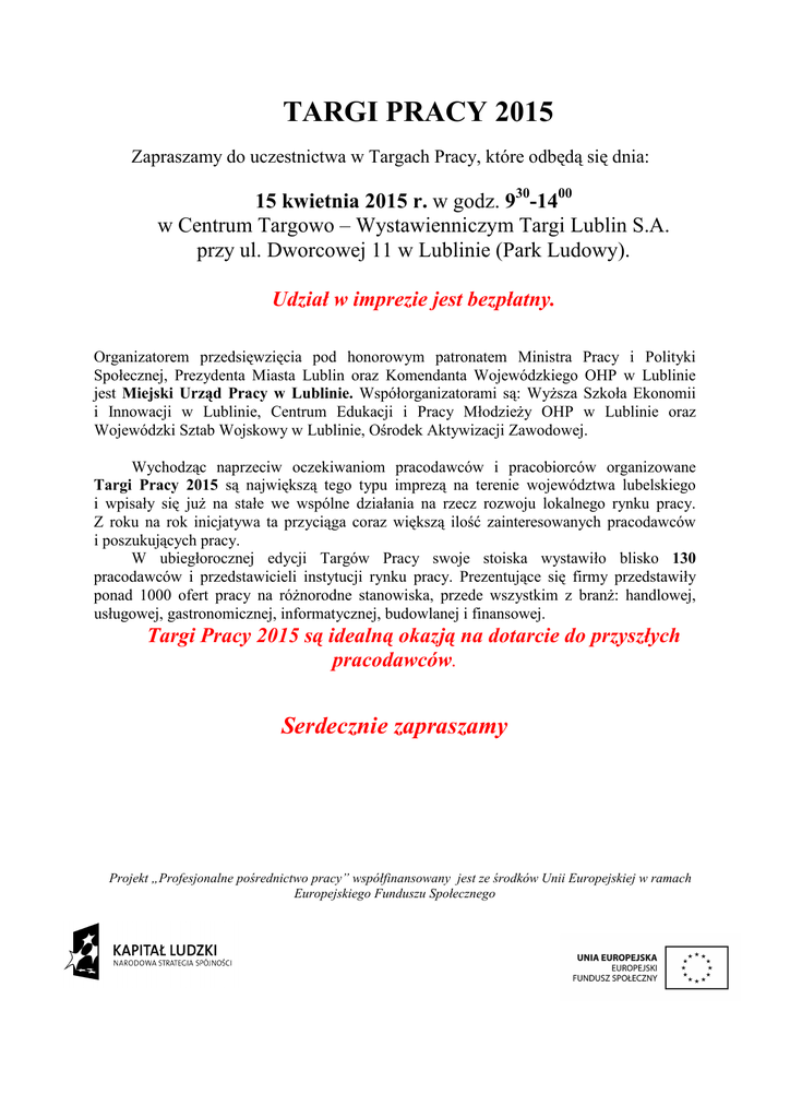 TARGI PRACY 2015 Zapraszamy do uczestnictwa w Targach Pracy, które odbędą się dnia: 15 kwietnia 2015 r. w godz. 930-1400 w Centrum Targowo – Wystawienniczym Targi Lublin S.A. przy ul. Dworcowej 11 w Lublinie (Park Ludowy). Udział w imprezie jest bezpłatny. Organizatorem przedsięwzięcia pod honorowym patronatem Ministra Pracy i Polityki Społecznej, Prezydenta Miasta Lublin oraz Komendanta Wojewódzkiego OHP w Lublinie jest Miejski Urząd Pracy w Lublinie. Współorganizatorami są: Wyższa Szkoła Ekonomii i Innowacji w Lublinie, Centrum Edukacji i Pracy Młodzieży OHP w Lublinie oraz Wojewódzki Sztab Wojskowy w Lublinie, Ośrodek Aktywizacji Zawodowej. Wychodząc naprzeciw oczekiwaniom pracodawców i pracobiorców organizowane Targi Pracy 2015 są największą tego typu imprezą na terenie województwa lubelskiego i wpisały się już na stałe we wspólne działania na rzecz rozwoju lokalnego rynku pracy. Z roku na rok inicjatywa ta przyciąga coraz większą ilość zainteresowanych pracodawców i poszukujących pracy. W ubiegłorocznej edycji Targów Pracy swoje stoiska wystawiło blisko 130 pracodawców i przedstawicieli instytucji rynku pracy. Prezentujące się firmy przedstawiły ponad 1000 ofert pracy na różnorodne stanowiska, przede wszystkim z branż: handlowej, usługowej, gastronomicznej, informatycznej, budowlanej i finansowej. Targi Pracy 2015 są idealną okazją na dotarcie do przyszłych pracodawców. Serdecznie zapraszamy Projekt „Profesjonalne pośrednictwo pracy” współfinansowany jest ze środków Unii Europejskiej w ramach Europejskiego Funduszu Społecznego